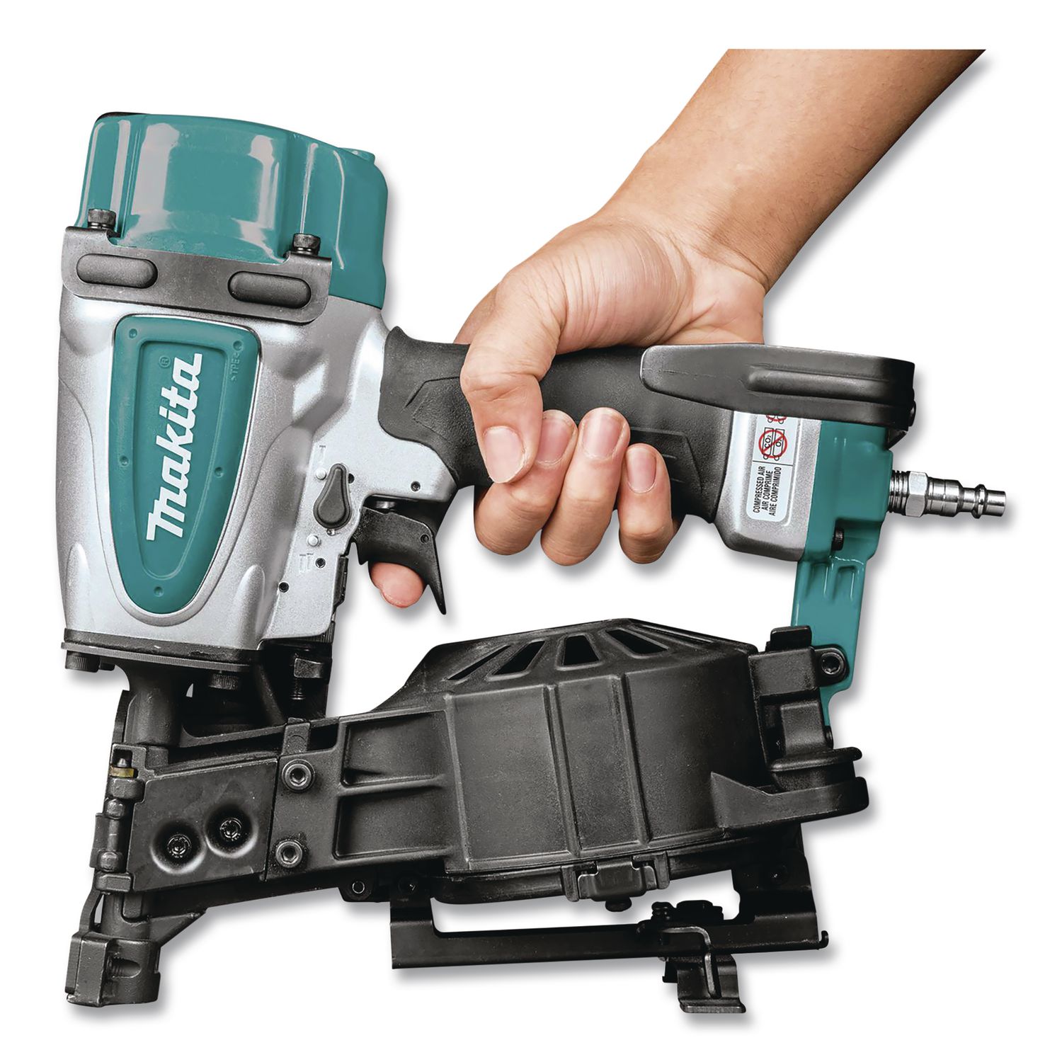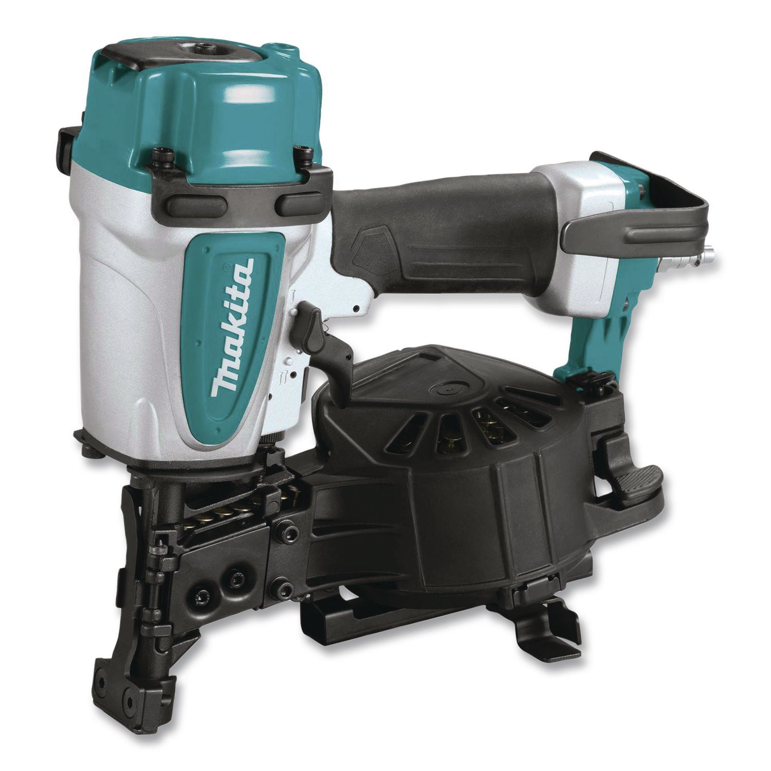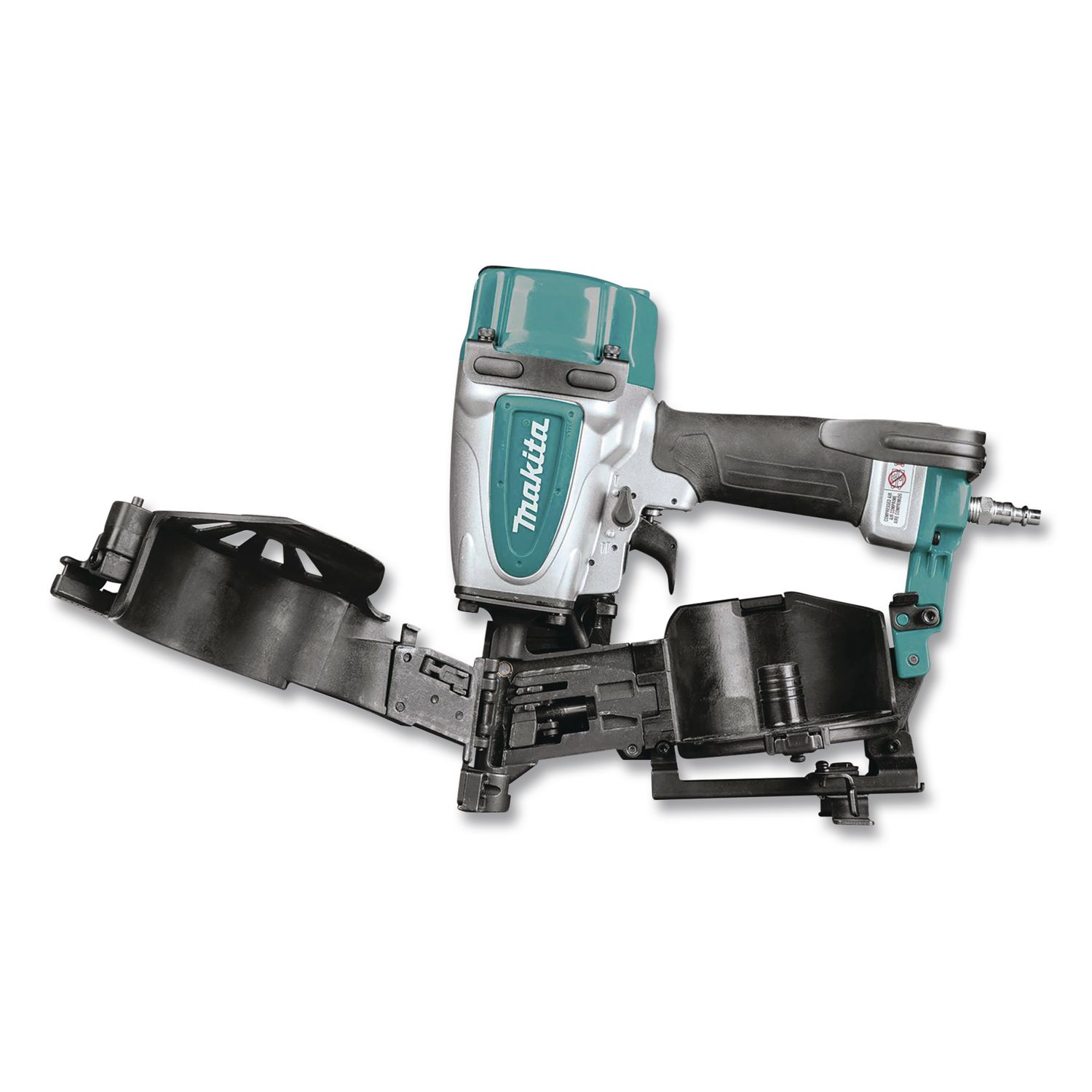 The Makita 1 3/4″ Roofing Coil Nailer combines rugged construction and robust performance with a light body weight (only 5.2 lbs). Accepts standard 0.12 shank diameter coil roofing nails from 3/4″ to 1 3/4″ in length. Engineered for longer tool life with durable and lightweight aluminum housing and an easy-loading adjustable canister. Ease-of-use features include a tool-less depth adjustment engineered for more precise control and flush nailing. Additional features include large carbide inserts on the nosepiece for long-lasting performance. Oversized steel wear plates are employed to reduce abrasion on the tool. Maximum Fastener Length: 1 3/4″; Fastener Type: Nails; Fastener Capacity: 120; Lubrication: Lightweight Oil.