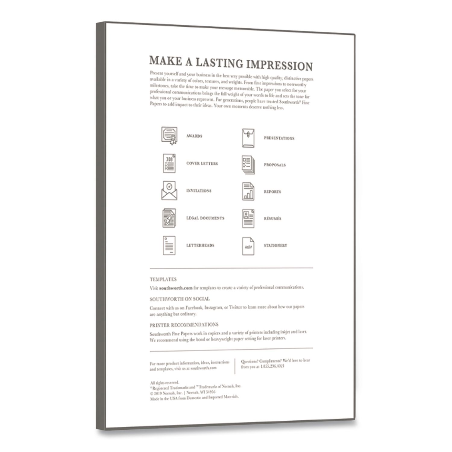 Nothing equals the rich texture of Southworth® 100% Cotton Resume Paper. Its distinctive crispness provides a feeling of substance that makes both an immediate and a lasting impression. Perfect for resumes, cover letters, thank you notes and more. It’s your story, how you tell that story matters. Trying to land the job is a full time job, from tweaking your resume to networking, career fairs to preparing for interviews. Through it all, you need to develop and tell the story of you. How you share that story matters. The paper you choose to share it on is important. From the first moment to enduring memory, the cotton in Southworth® Resume Paper adds a touch of class. Cotton paper makes first impressions more impressive with a distinct crispness and an unmistakable feel. Someone picking up your resume will know, before they even read a single word, that there’s something special to it. Be prepared to share your story at your next interview. Present your resume on Southworth® and rise to the top of the stack. Sheet/Roll Size: 8.5 x 11; Paper Basis Weight (lb): 24 lb Bond; Paper Grade (gsm): 89 gsm; Paper/Media Color(s): Ivory.