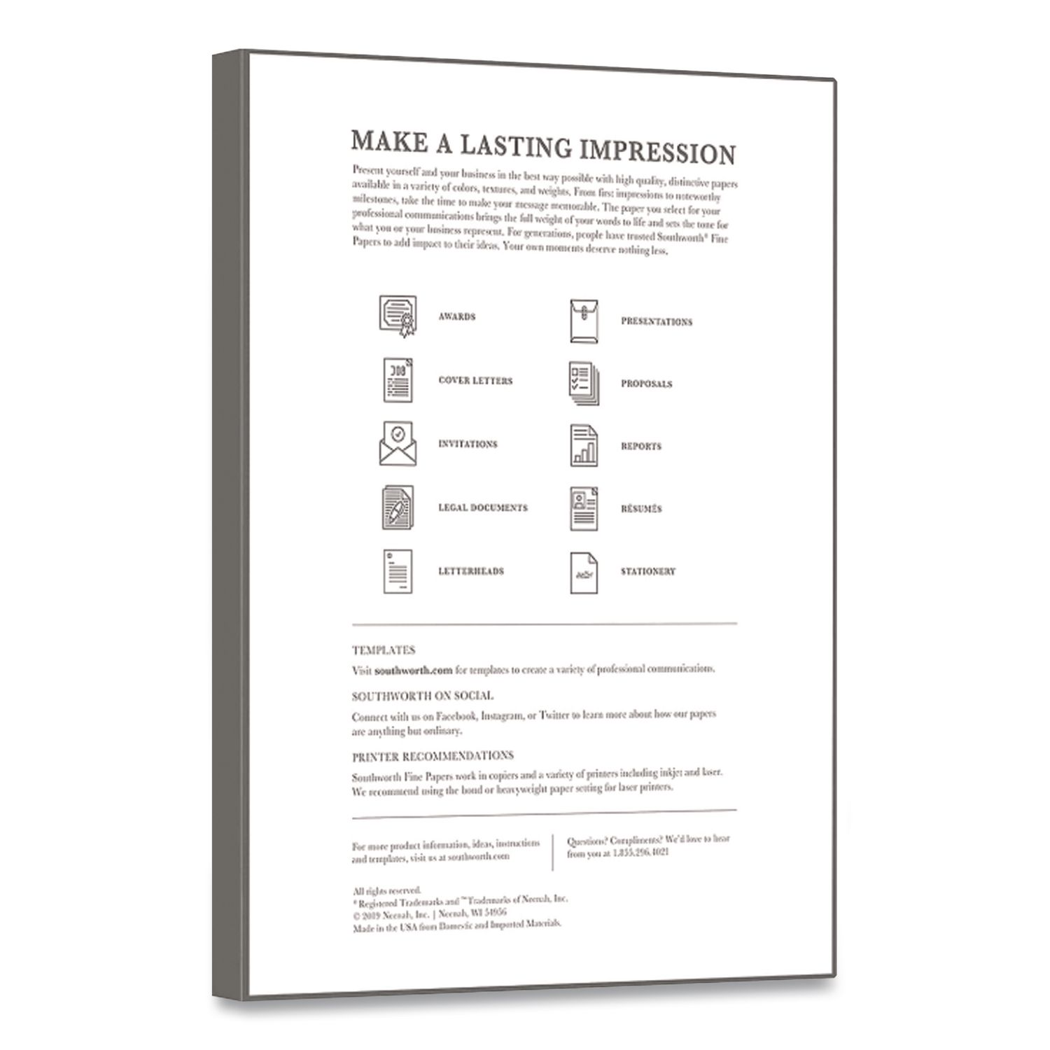 Nothing equals the rich texture of Southworth® 100% Cotton Resume Paper. Its distinctive crispness provides a feeling of substance that makes both an immediate and a lasting impression. Perfect for resumes, cover letters, thank you notes and more. It’s your story, how you tell that story matters. Trying to land the job is a full time job, from tweaking your resume to networking, career fairs to preparing for interviews. Through it all, you need to develop and tell the story of you. How you share that story matters. The paper you choose to share it on is important. From the first moment to enduring memory, the cotton in Southworth® Resume Paper adds a touch of class. Cotton paper makes first impressions more impressive with a distinct crispness and an unmistakable feel. Someone picking up your resume will know, before they even read a single word, that there’s something special to it. Be prepared to share your story at your next interview. Present your resume on Southworth® and rise to the top of the stack. Sheet/Roll Size: 8.5 x 11; Paper Basis Weight (lb): 32 lb Bond; Paper Grade (gsm): 120 gsm; Paper/Media Color(s): White.