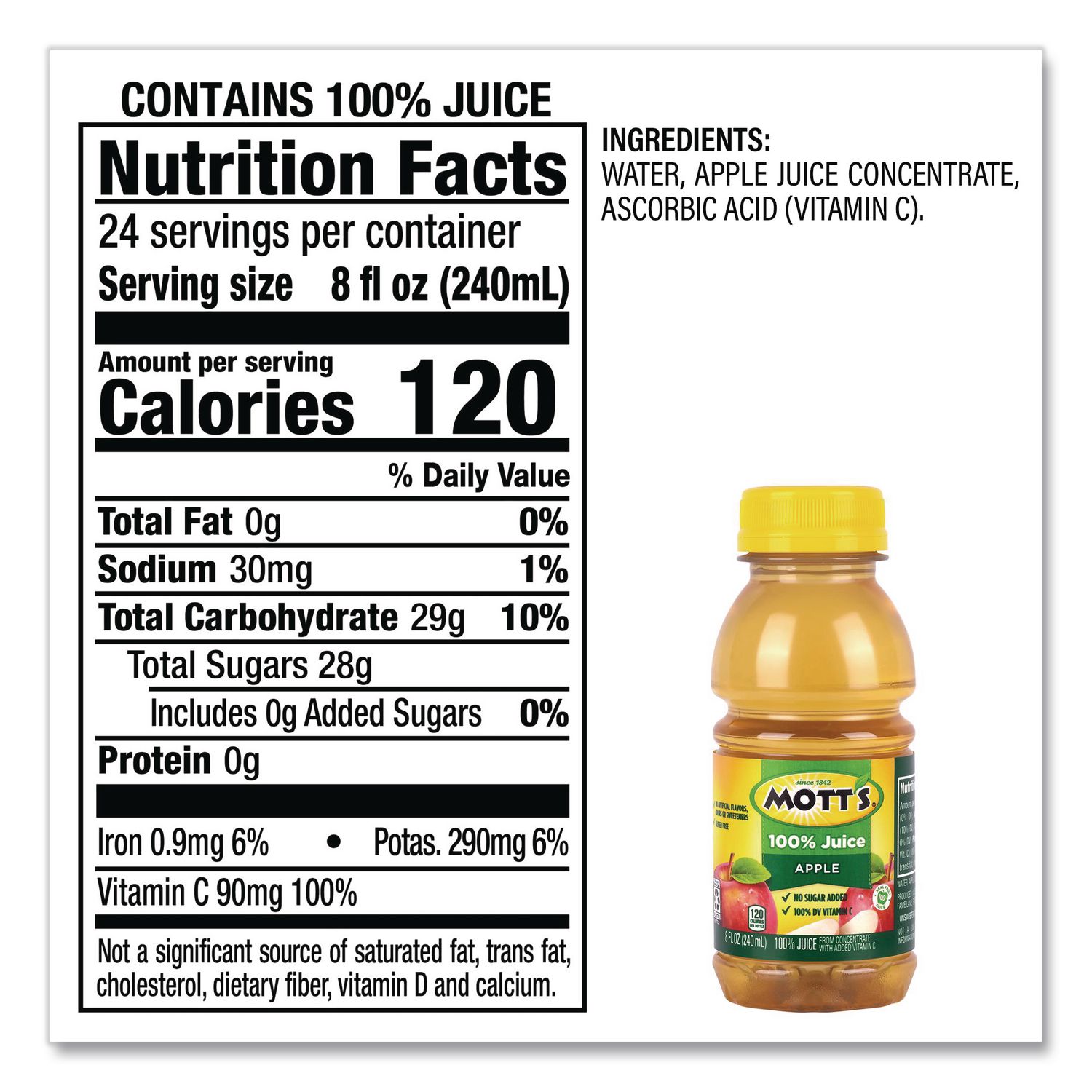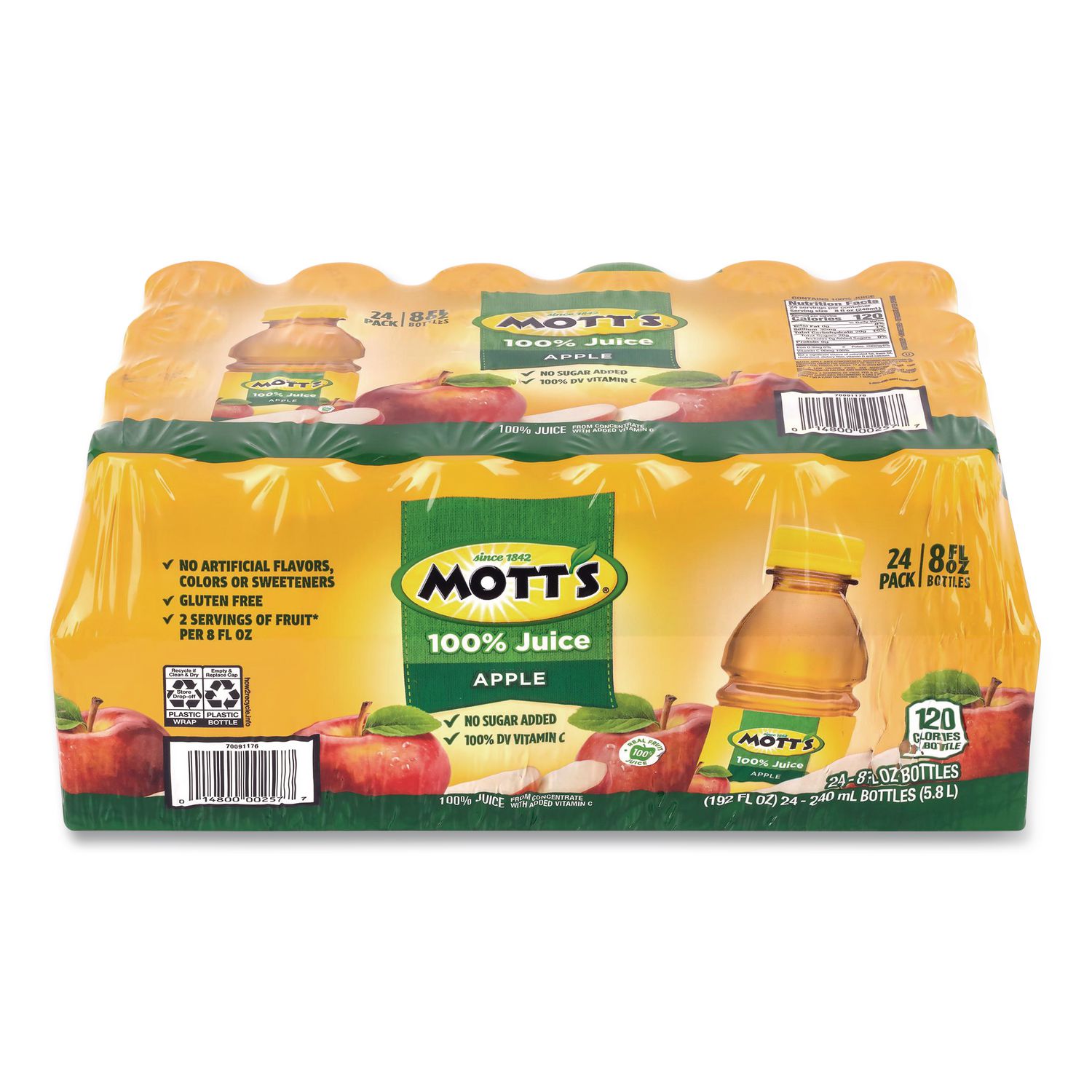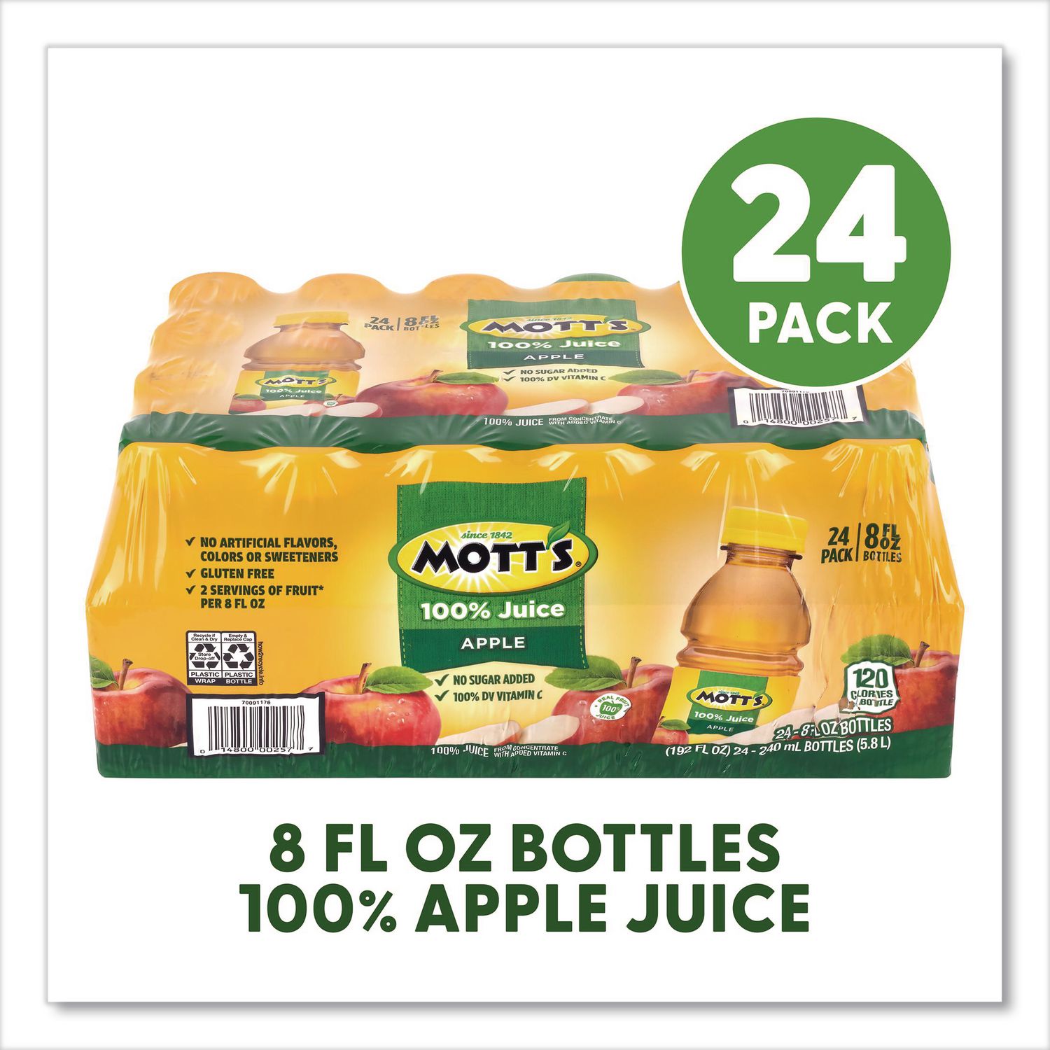 Nothing satisfies quite like Mott’s® Original Apple Juice. Packed with ripe apple flavor, Mott’s Original Apple Juice is 100% fruit juice and delivers two servings of fruit in each 8 fl oz cup, per current USDA Dietary Guidelines. It’s also an excellent source of Vitamin C, contains no added sugar and has a delicious taste the whole family will love. Mott’s® Original Apple Juice is the perfect refreshment at dinnertime, lunchtime or any time. Apples have always nourished us, inspired us and provided for us. Mott’s provides the nutrition and taste of real fruit that families have trusted since 1842, when Motts’s founder Samuel R. Mott began growing and packaging apples in New York. In the years since then, Mott’s commitment to apple excellence and high-quality products has continued to provide healthy, delicious juices and snacks. Treat your family to the classic taste of Mott’s® Original Apple Juice. Beverage Type: Juice; Flavor: Apple; Product Packaging: Bottle; Volume Capacity: 8 oz.