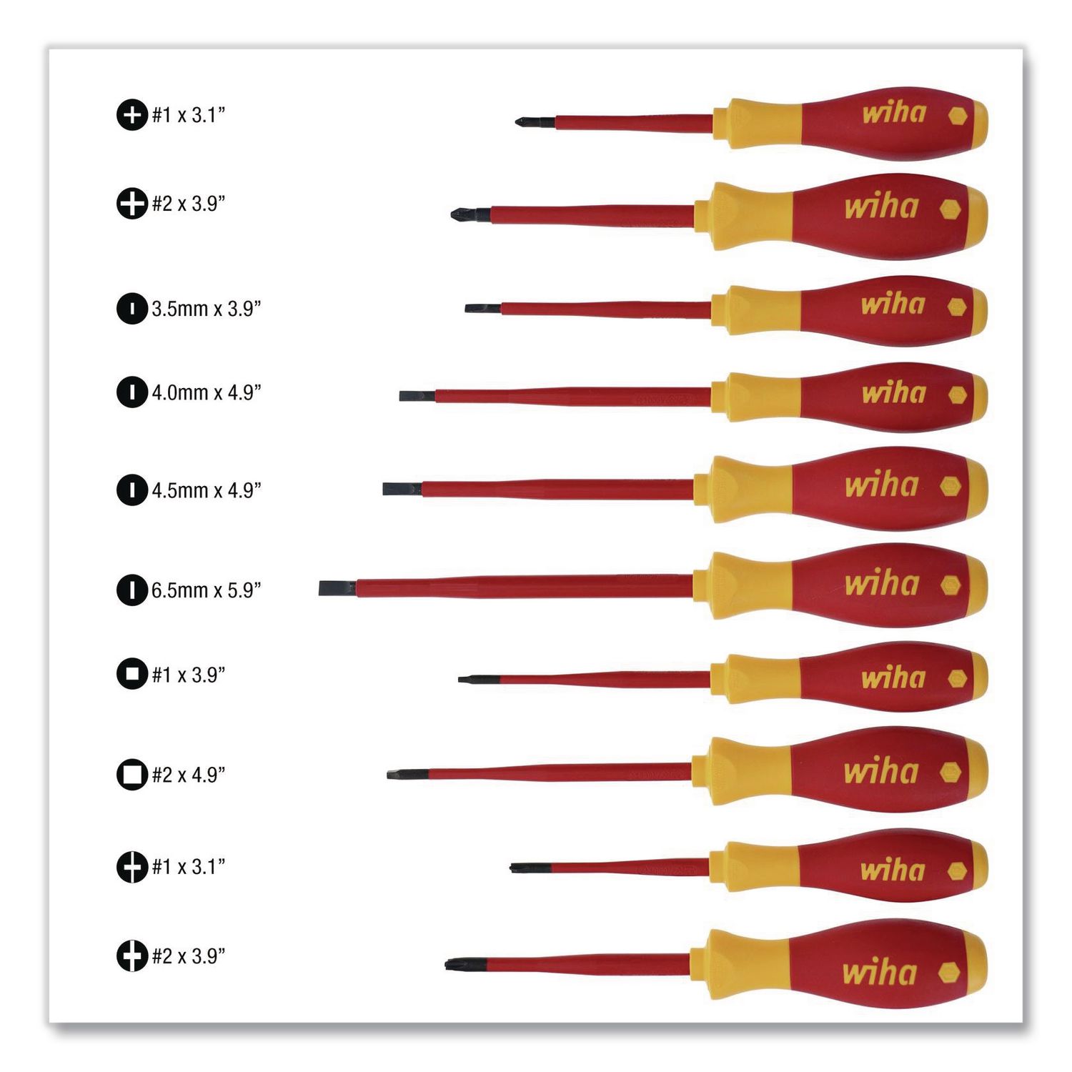 Wiha® Insulated SoftFinish® SlimLine cushion grip drivers are the standard for premium quality featuring ergonomic cushion grip handles for comfort and control, dual durometer construction for long-lasting durability, and handles directly molded to the blade for a permanent bond. The handles are sized proportionate to the blade for consistent mechanical advantage, include parallel flats to prevent table-top roll-off, and have driver tip profiles labeled on the cap for easy identification. Drivers consist of Wiha® engineered premium quality tool steel for strength and durability, have black oxide finish for corrosion protection, and feature exact fit precision machined tips for reduced cam-out. Every single Wiha® insulated tool is individually tested to 10,000 V AC and rated to 1,000 V AC (1,500 V DC) for safety and peace of mind in energized applications. This tool is VDE Certified and meets EN/IEC 60900 testing standards for protection against arc flash explosion, ASTM F1505 standard specifications for insulated and insulating hand tools and CSA testing benchmarks for safety and performance. Wiha® premium quality Insulated SoftFinish® cushion grip drivers are designed and engineered by Wiha® Germany and Manufactured in Germany. You can buy with confidence knowing that this product is Backed by the Wiha No Hassle Guarantee. Screwdrivers and Nut Drivers Tool Type: Screwdriver Set; Tip/Socket Type(s): Phillips; Slotted; Square; Xeno; Tip/Socket Size(s): Phillips: #1, #2; Slotted: 3.5 mm, 4 mm, 4.5 mm, 5.5 mm, 6.5 mm; Square: #1, #2; Xeno #1, #2; Tip/Socket Material: Steel.