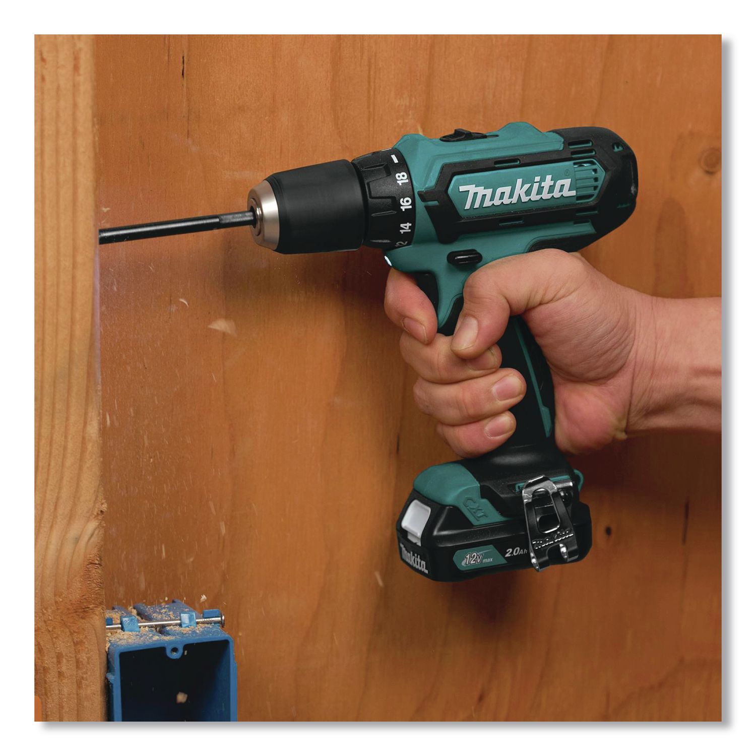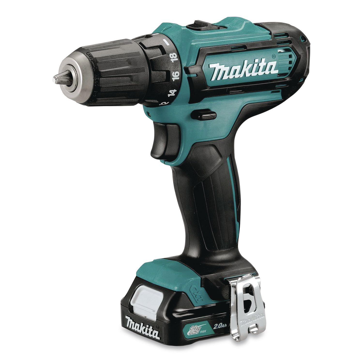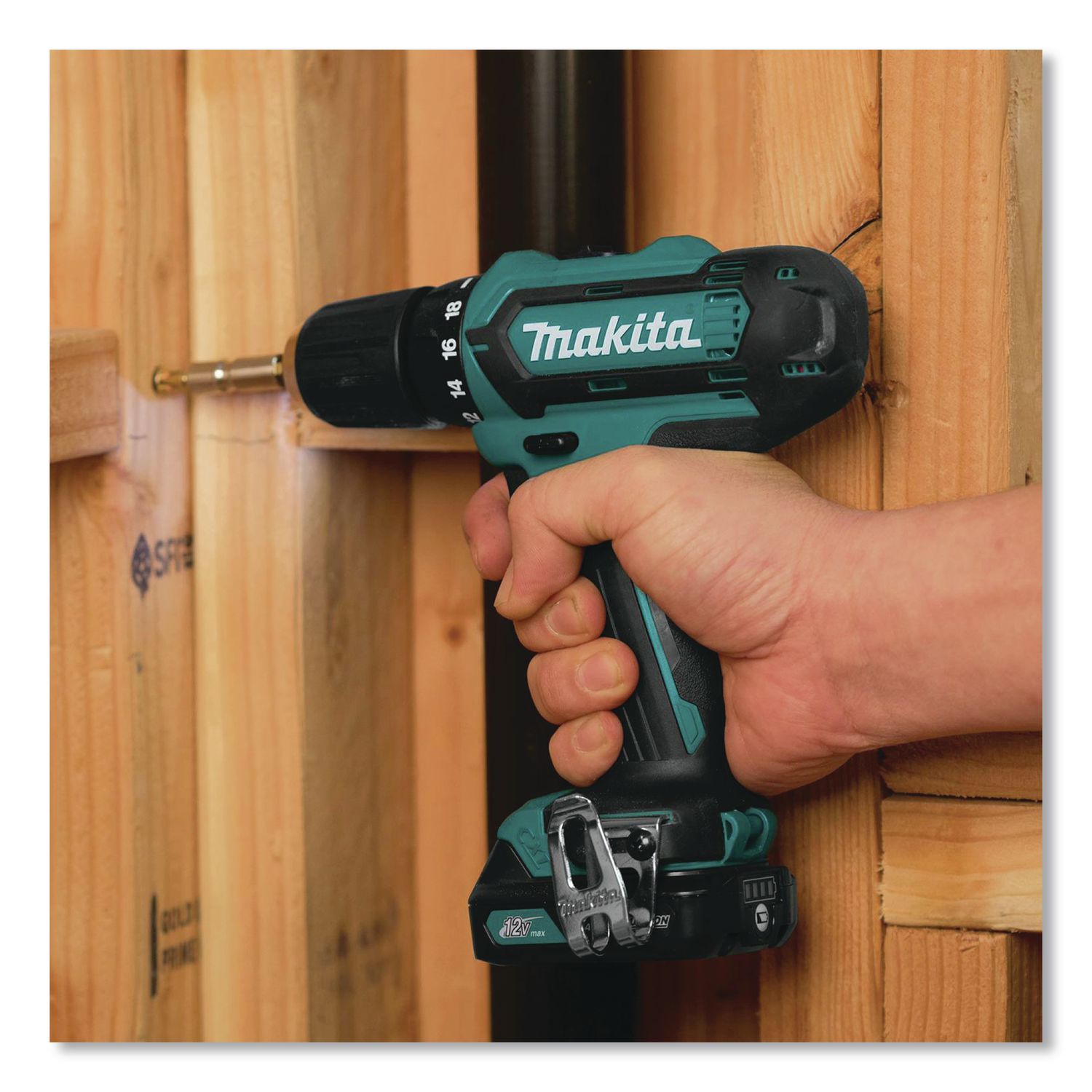 The Makita 12V MAX CXT Lithium-Ion 3/8″ Cordless Drill Driver Kit with Two Batteries (2 Ah) delivers power and speed in an ultra-compact size for drilling, driving and fastening applications. The kit includes two 12V MAX CXT Lithium-Ion slide-style batteries for improved balance and ergonomics over pod-style batteries. For added convenience the batteries include an on-board LED charge level indicator. Power Type: Battery; Cordless: Yes; Number of Speeds: 2 Variable; Maximum Rotation Speed (RPM): 0 to 450 RPM; 0 to 1,700 RPM.