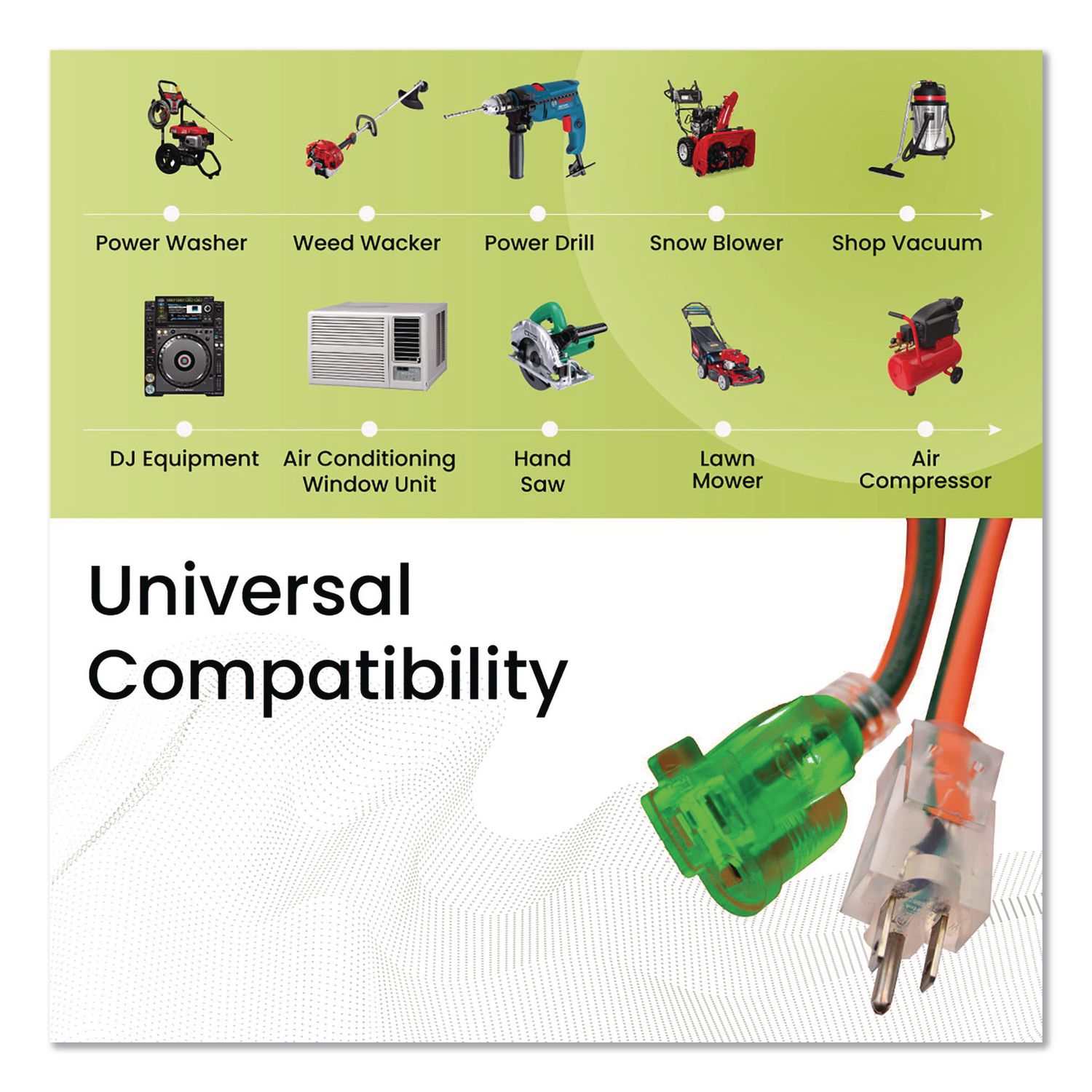 When the going gets tough, the tough get going, and the GoGreen Power lives up to that! The robust and durable, contractor grade 14/3 SJTW extension cord is ready to rumble as outdoor extension cord. Being moisture resistant, abrasion resistant and durable, even with prolonged exposure to sunlight, this cord is cETL listed and certified, which is compliant with the rigorous standards for a hard service thermoplastic cable rated for 125 volts. Our heavy-duty extension cord has molded plugs which gives it a sturdy build and makes it easy to use. And what could be more convenient than merely seeing if the cord has power or not, since the item has a lighted female end. The socket (female end) lights up when active, and the kink-free cord is recommended for use with heavy-duty equipment and tools. We offer free recycling and free shipping back of the used product to our recycling facility. Please view the recycling code and instructions on the back of the package and visit the GoGreen Power website for additional information. This item SHOULD NOT be used with an EV Charger. Suitable for lawn mowers, air compressors GFCI outlets and three-prong connectors. Please check amperage in advance. Application: Indoor; Outdoor; Cable Length: 100 ft; Number of Outlets: 1; Number of Prongs: 3.