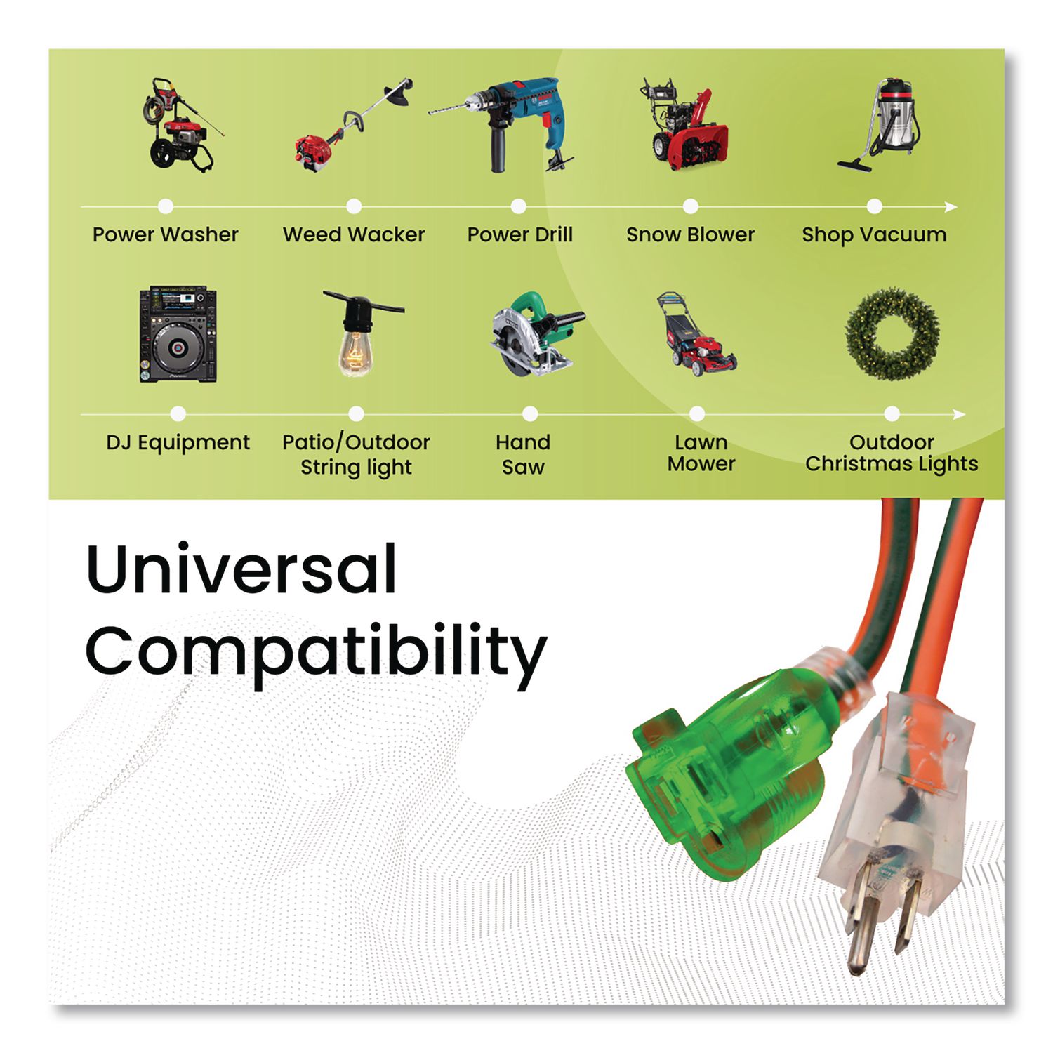 When the going gets tough, the tough get going, and GoGreen Power lives up to that! The robust and durable, contractor grade 16/3 SJTW extension cord is ready to rumble, both indoors as well as outdoors. Moisture-resistant, abrasion-resistant and durable, even with prolonged exposure to sunlight, this cord is ETL listed and cETL certified, which is compliant with the rigorous standards for a hard service thermoplastic cable rated for 300 volts. Our heavy-duty extension cord has molded plugs, which give it a sturdy build and make it easy to use. And what could be more convenient than merely seeing if the cord is lit or not, since this item is a lighted extension cord. The socket (female end) lights up when active, and the kink-free cord is recommended for use with heavy-duty equipment and tools. Enjoy hassle-free recycling. We offer free recycling and free shipping back of the used product to our recycling facility. Please view the recycling code and instructions on the back of the package and visit our website for additional information. This item should not be used with an EV Charger. Suitable for lawn mowers, air compressors GFCI outlets and three-prong connectors. Please check amperage in advance. Application: Outdoor; Cable Length: 100 ft; Number of Outlets: 1; Number of Prongs: 3.