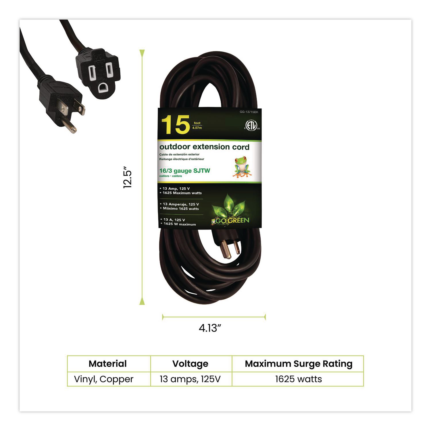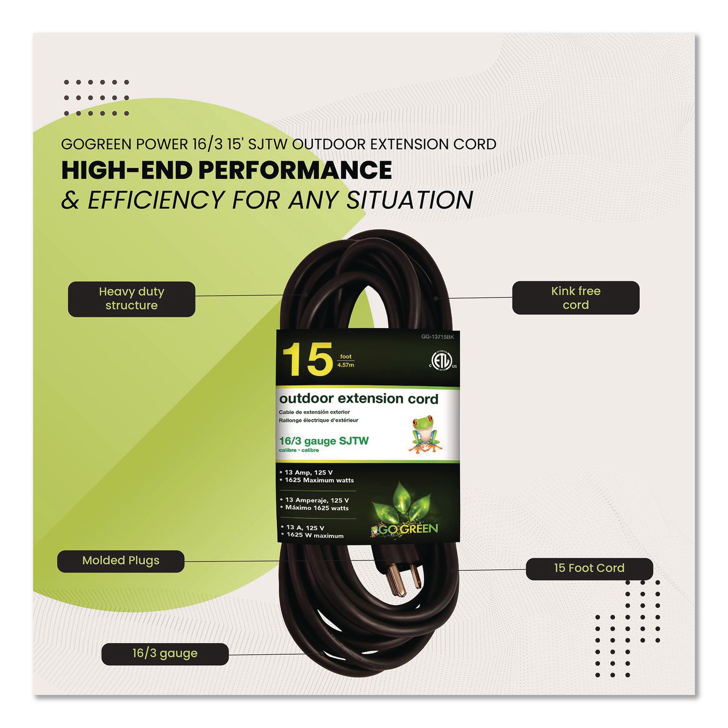 When the going gets tough, the tough get going, and GoGreen Power lives up to that! The robust and durable, contractor grade 16/3 SJTW extension cord is ready to rumble, both indoors as well as outdoors. Moisture-resistant, abrasion-resistant and durable, even with prolonged exposure to sunlight, this cord is ETL listed and cETL certified, which is compliant with the rigorous standards for a hard service thermoplastic cable rated for 300 volts. Our heavy-duty extension cord has molded plugs, which give it a sturdy build and make it easy to use. And what could be more convenient than merely seeing if the cord is lit or not, since this item is a lighted extension cord. The socket (female end) lights up when active, and the kink-free cord is recommended for use with heavy-duty equipment and tools. Enjoy hassle-free recycling. We offer free recycling and free shipping back of the used product to our recycling facility. Please view the recycling code and instructions on the back of the package and visit our website for additional information. This item should not be used with an EV Charger. Suitable for lawn mowers, air compressors GFCI outlets and three-prong connectors. Please check amperage in advance. Application: Outdoor; Cable Length: 15 ft; Number of Outlets: 1; Number of Prongs: 3.