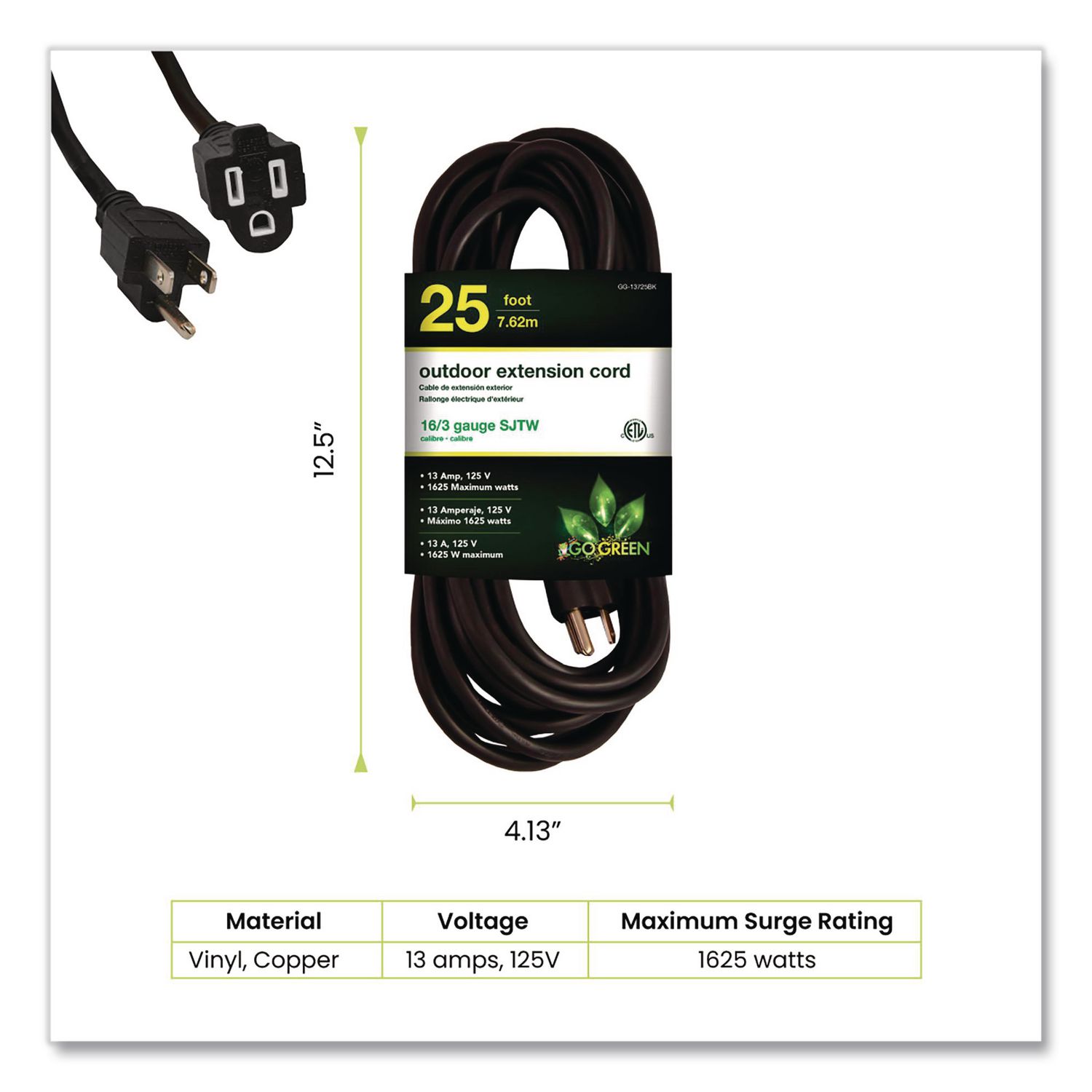 When the going gets tough, the tough get going, and GoGreen Power lives up to that! The robust and durable, contractor grade 16/3 SJTW extension cord is ready to rumble, both indoors as well as outdoors. Moisture-resistant, abrasion-resistant and durable, even with prolonged exposure to sunlight, this cord is ETL listed and cETL certified, which is compliant with the rigorous standards for a hard service thermoplastic cable rated for 300 volts. Our heavy-duty extension cord has molded plugs, which give it a sturdy build and make it easy to use. And what could be more convenient than merely seeing if the cord is lit or not, since this item is a lighted extension cord. The socket (female end) lights up when active, and the kink-free cord is recommended for use with heavy-duty equipment and tools. Enjoy hassle-free recycling. We offer free recycling and free shipping back of the used product to our recycling facility. Please view the recycling code and instructions on the back of the package and visit our website for additional information. This item should not be used with an EV Charger. Suitable for lawn mowers, air compressors GFCI outlets and three-prong connectors. Please check amperage in advance. Application: Outdoor; Cable Length: 25 ft; Number of Outlets: 1; Number of Prongs: 3.