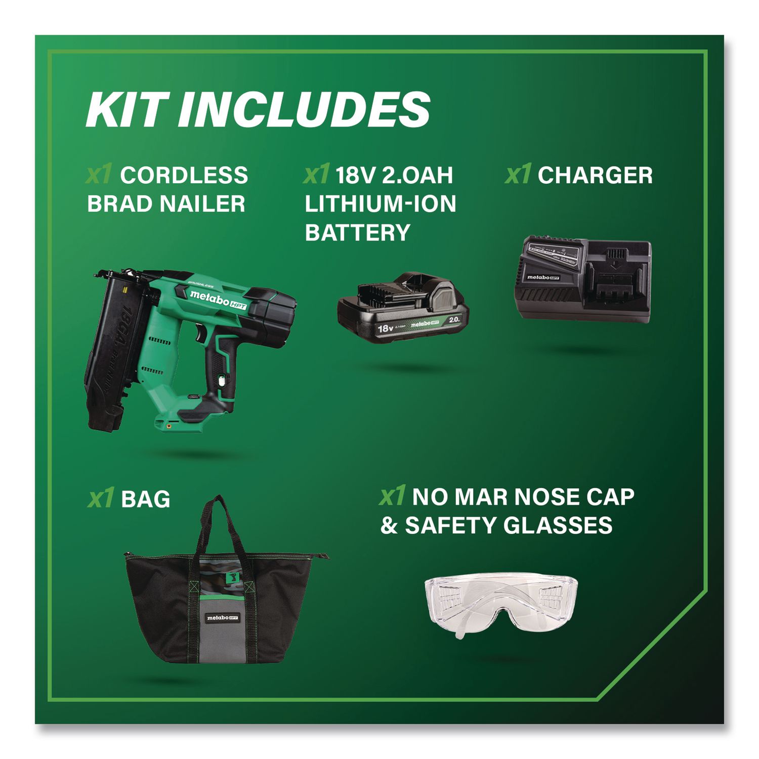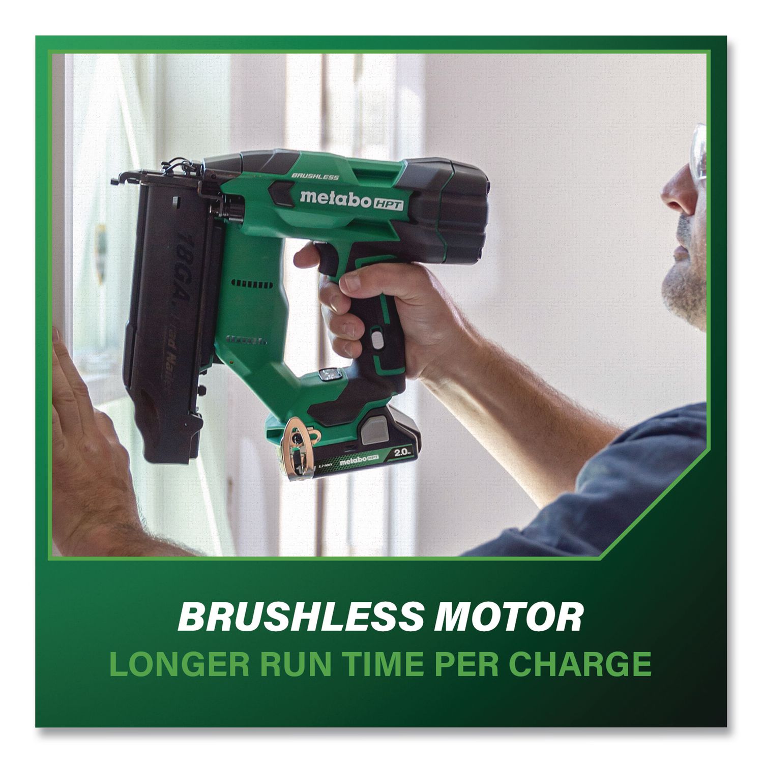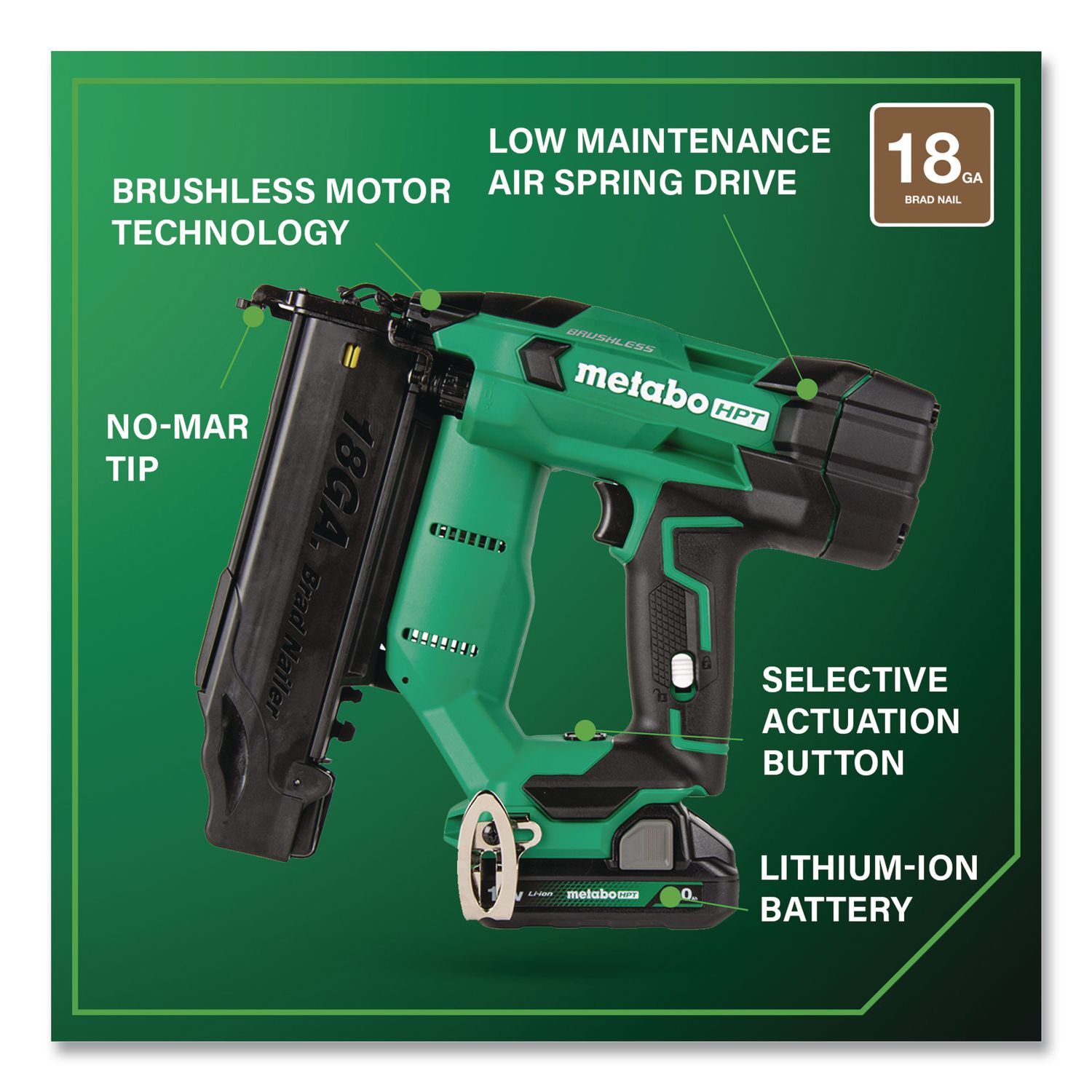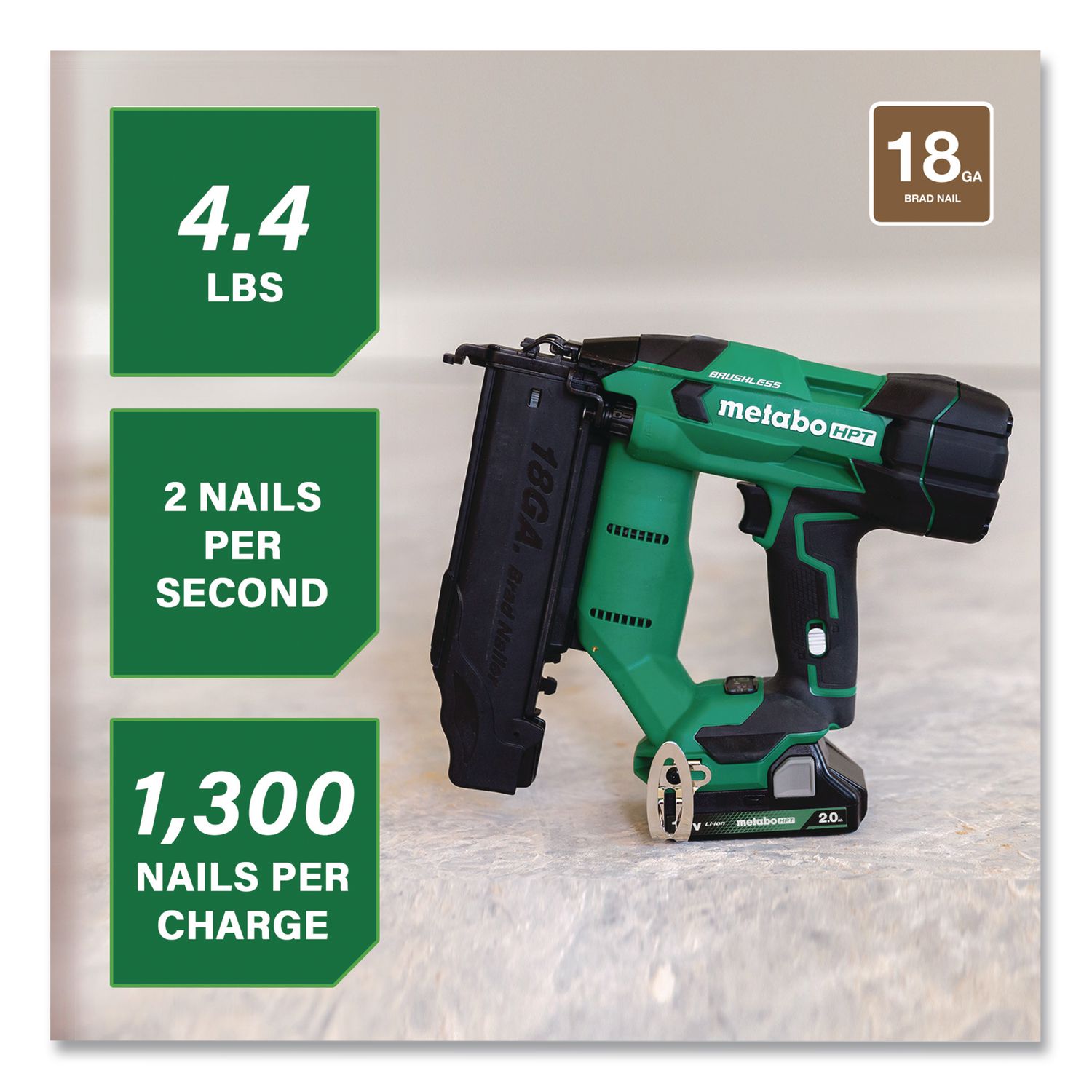 The Pro Preferred Brand of Pneumatic Nailers introduces the 18V Brushless Compact Cordless 18 ga Brad Nailer that is 30% more compact and 31% lighter than the previous model. Now, with a 2 Ah battery with fuel gauge, it delivers a driving speed of up to two nails per second, saving valuable time and increasing productivity. Forget the hassle of having to drag long hoses or compressors around, or having to deal with gas cartridges, and go cordless! This 18 ga Brad Nailer delivers a similar feel to a pneumatic nailer thanks to Metabo HPT’s unique Air Spring Drive System. Combine the pneumatic-like feel with the convenience and power of the 18V or MultiVolt battery, and this cordless Brad Nailer works all day long, driving 5/8″ to 2″ nails. Get 1,300 nails per charge with the included 2 Ah compact battery. Maximum Fastener Length: 2″; Fastener Type: Nails; Fastener Capacity: 100; Fastener Gauge: 18 ga.