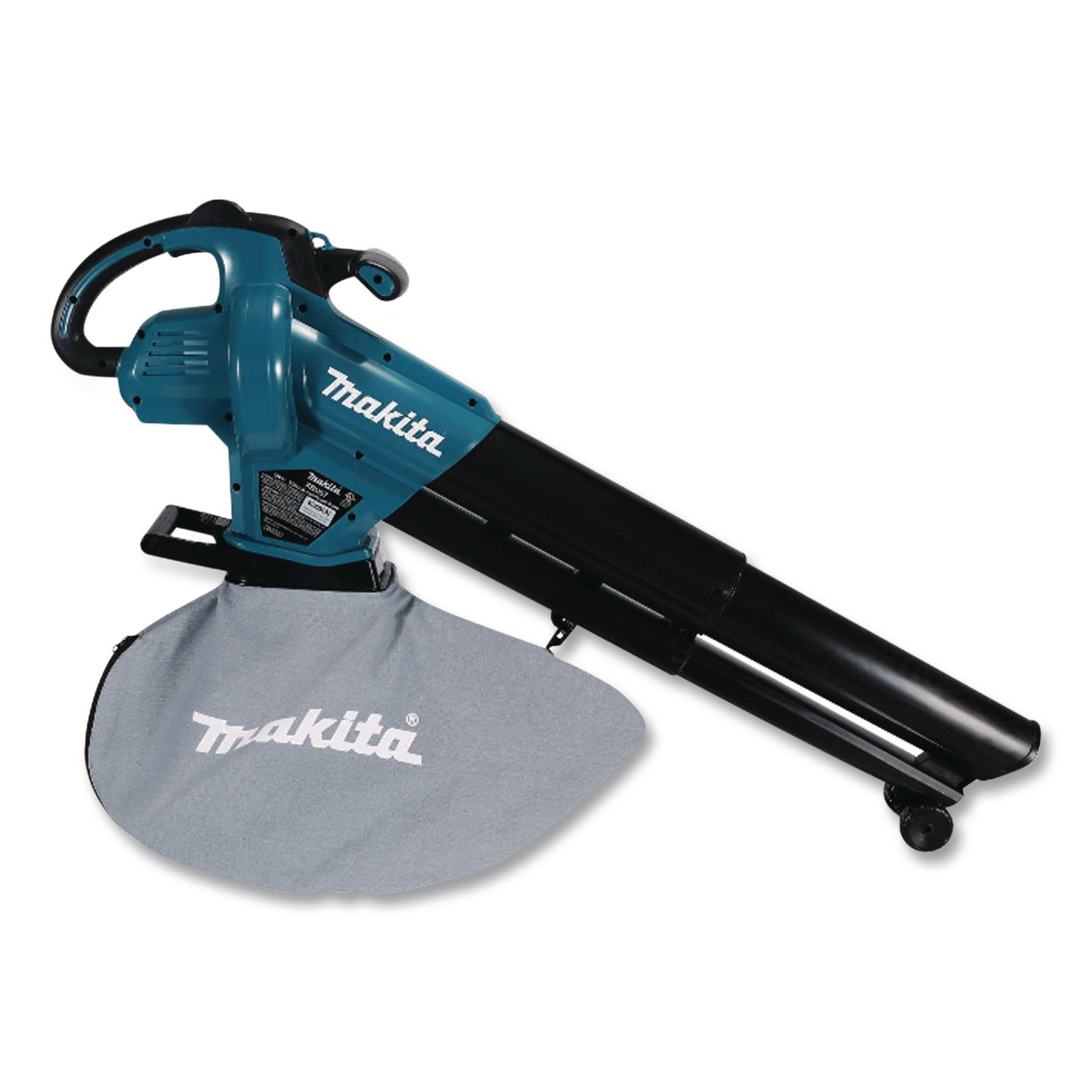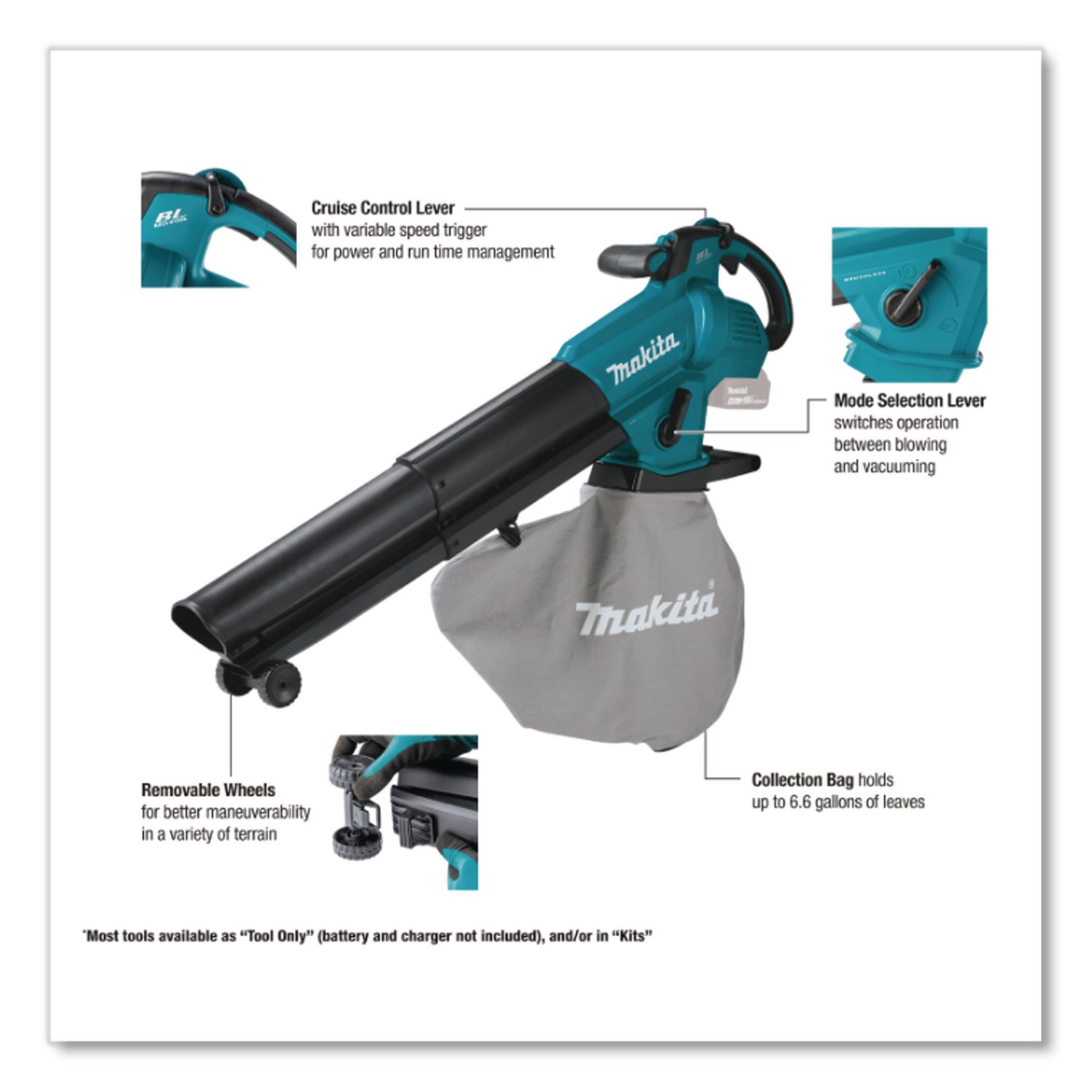 With lower noise and zero emissions, the 18V LXT Brushless Blower/Vacuum Mulcher Kit is a welcome solution for clean-up applications. The commercial design allows the blower to tackle demanding applications, comparable to gas blowers. The Brushless Blower/Vacuum Mulcher easily converts from blower to vacuum and mulcher. The brushless motor delivers speeds up to 143 MPH and up to 148 CFM. It also delivers up to 215 CFM and 13″ water lift of suction power. Makita’s efficient brushless motor is electronically controlled to optimize battery energy use for up to 50% longer run time per battery charge than similar non-brushless tools. Electronic controls efficiently use battery energy to match the changing demands of the application for increased power and speed when needed. Makita’s brushless motors run cooler and more efficiently for longer life. The collection bag holds up to 6.6 gal of leaves. The precision suction power aids in fallen leaf cleanup without altering stone and rock settings in plant beds. It also features removable wheels for better maneuverability in a variety of terrain. Lawn and Garden Tool Type: Blower/Vacuum Mulcher; Tool Application: Landscaping; Body Material: Plastic; Color(s): Black/Teal.
