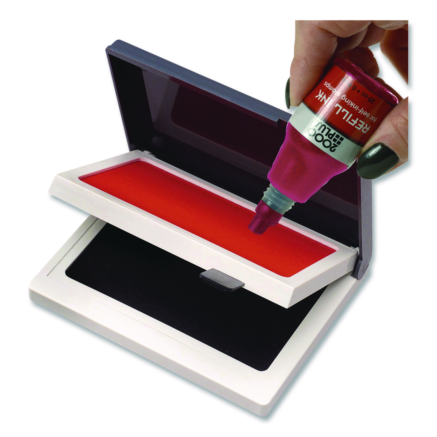 Double your choices with two pads in one impact-resistant case. Unique design allows you to switch colors with ease—simply flip the pads as you would the pages of a book. Superior felt surface delivers better stamp coverage while ensuring long-lasting performance. Compatible with a variety of hand-stamp sizes. Re-inkable. Stamp Pads Type: Inked Felt; Ink Pad Type: Conventional Pad; Ink Color(s): Black/Red; Size: 4″ x 2″.