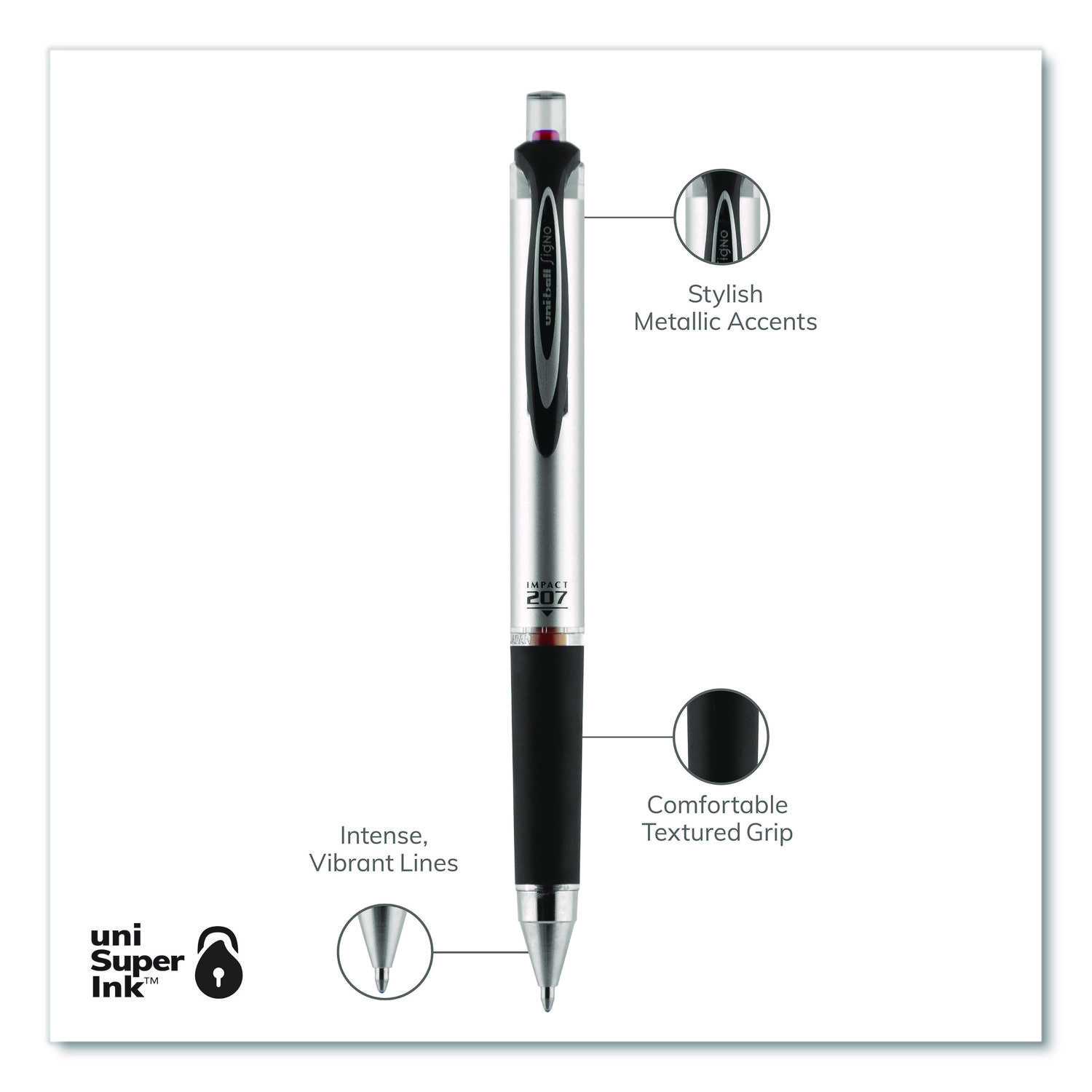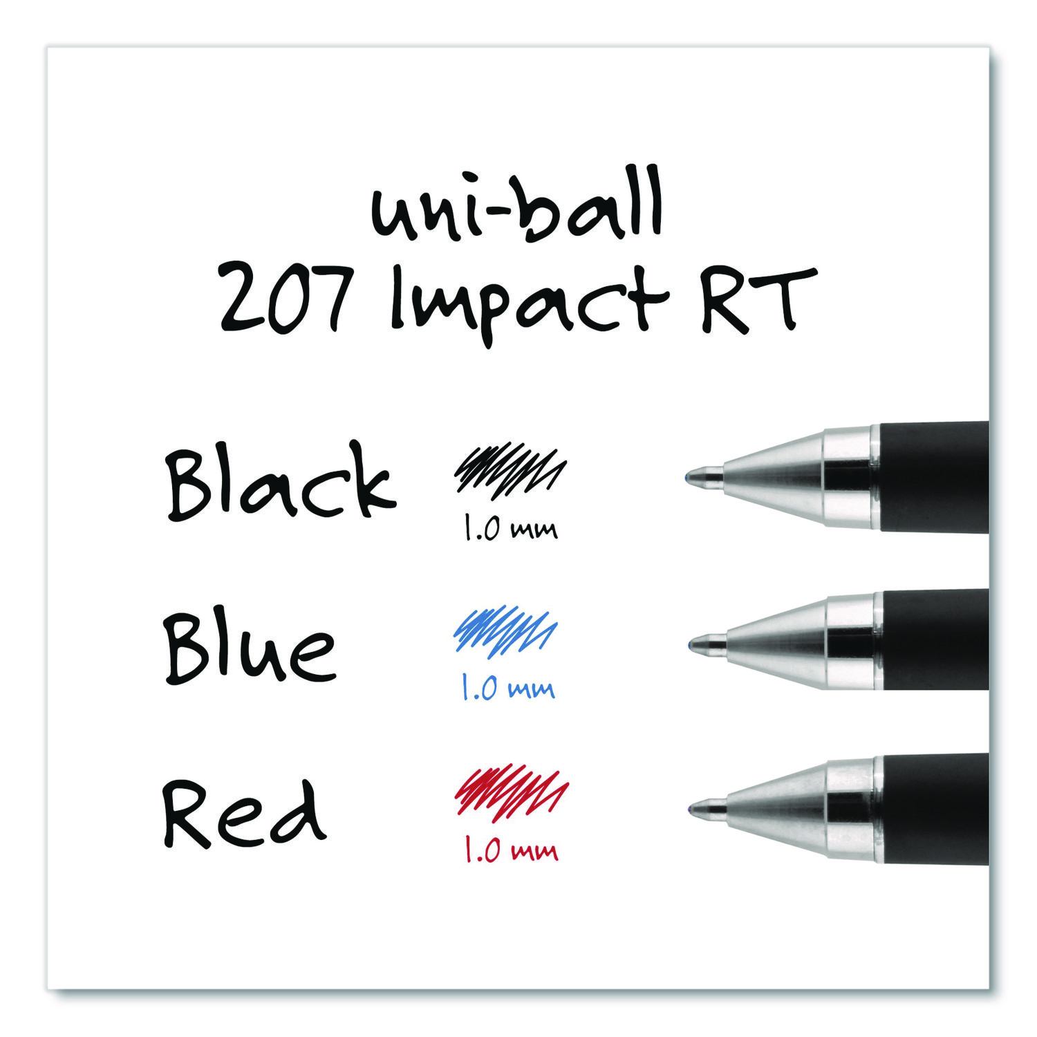 Make an unmistakable impact with uniball® 207™ Impact™ RT Gel Pens. A professional’s first choice, 207™ Impact™ RT pens feature a sophisticated barrel, stylish metallic accents and a high-quality finish, along with an innovative pocket clip release that auto-retracts the pens’ point. Smooth-flowing, pigment-based gel ink ensures a smooth glide and a richly pigmented line with every stroke, while uni Super Ink technology entrenches ink deep into paper to provide three-way protection against water, fading and fraud. Pen Sub-Brand & Product Family: 207™ Impact™ RT; Pen Type: Gel Pen; Pen Style: Retractable; Pen Tip Type: Conical.