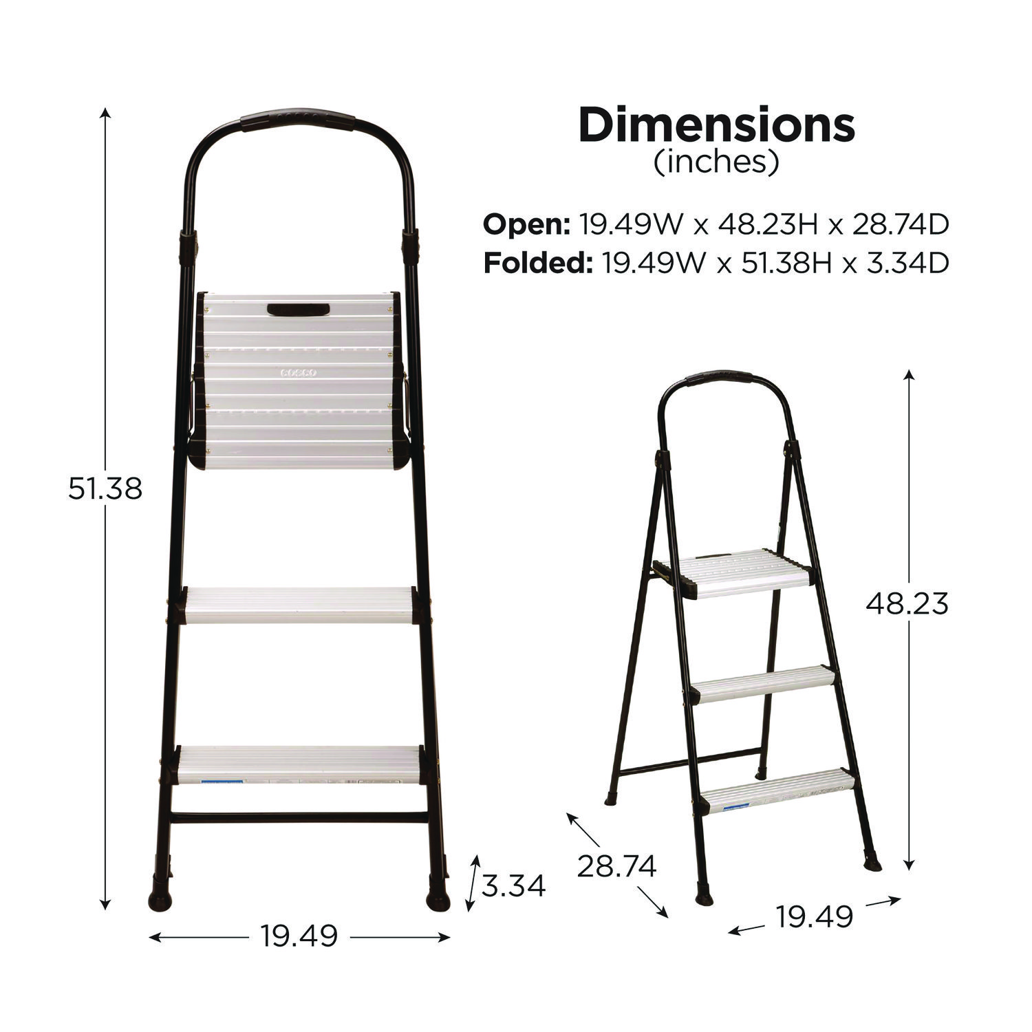 Cosco Three-Step Folding Step Stool is ideal for any task. Whether it’s reaching that high cabinet, changing a light bulb or washing the windows, our products make it easier to get any job done with an 8 ft. 10 in max reach. This lightweight step stool provides security and stability to any job. Number of Steps: 3; Step Stools Type: Folding Step Stool; Working Height: 28.75″; Frame Material: Steel.