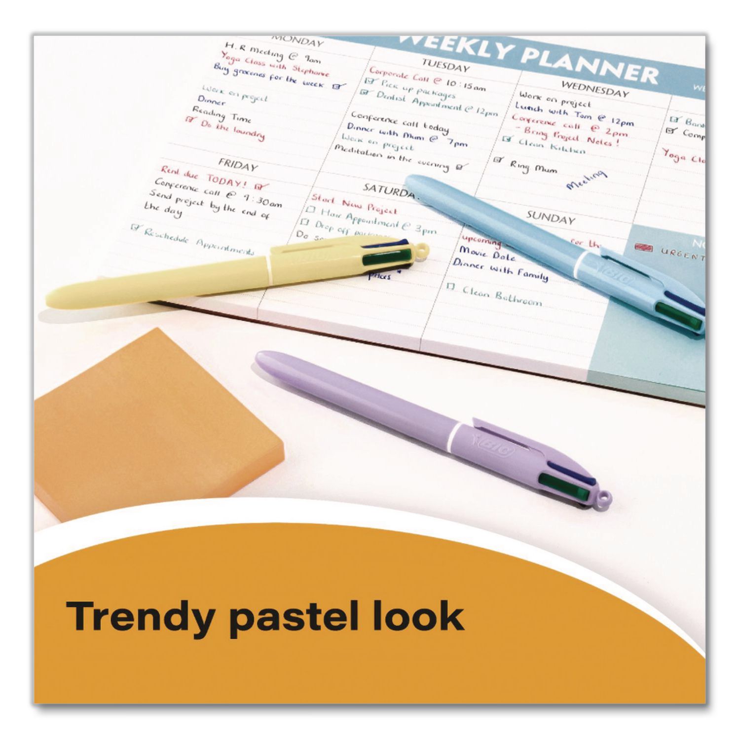 Express yourself in vivid color with the dependable and ultra-convenient BIC® 4-Color Ball Pen. This world-renowned multifunction pen lets you choose from four ink colors with a simple click, so there’s no need to carry around multiple pens. It’s a practical solution that’s ideal for color-coding, organizing notes, editing others’ work and more. Standard ballpoint ink is long-lasting, and the pen is refillable. Soft-Touch Pastel Barrels. Pen Sub-Brand & Product Family: 4-Color™; Pen Type: Multi-Color Ballpoint Pen; Pen Style: Retractable; Pen Tip Type: Conical.