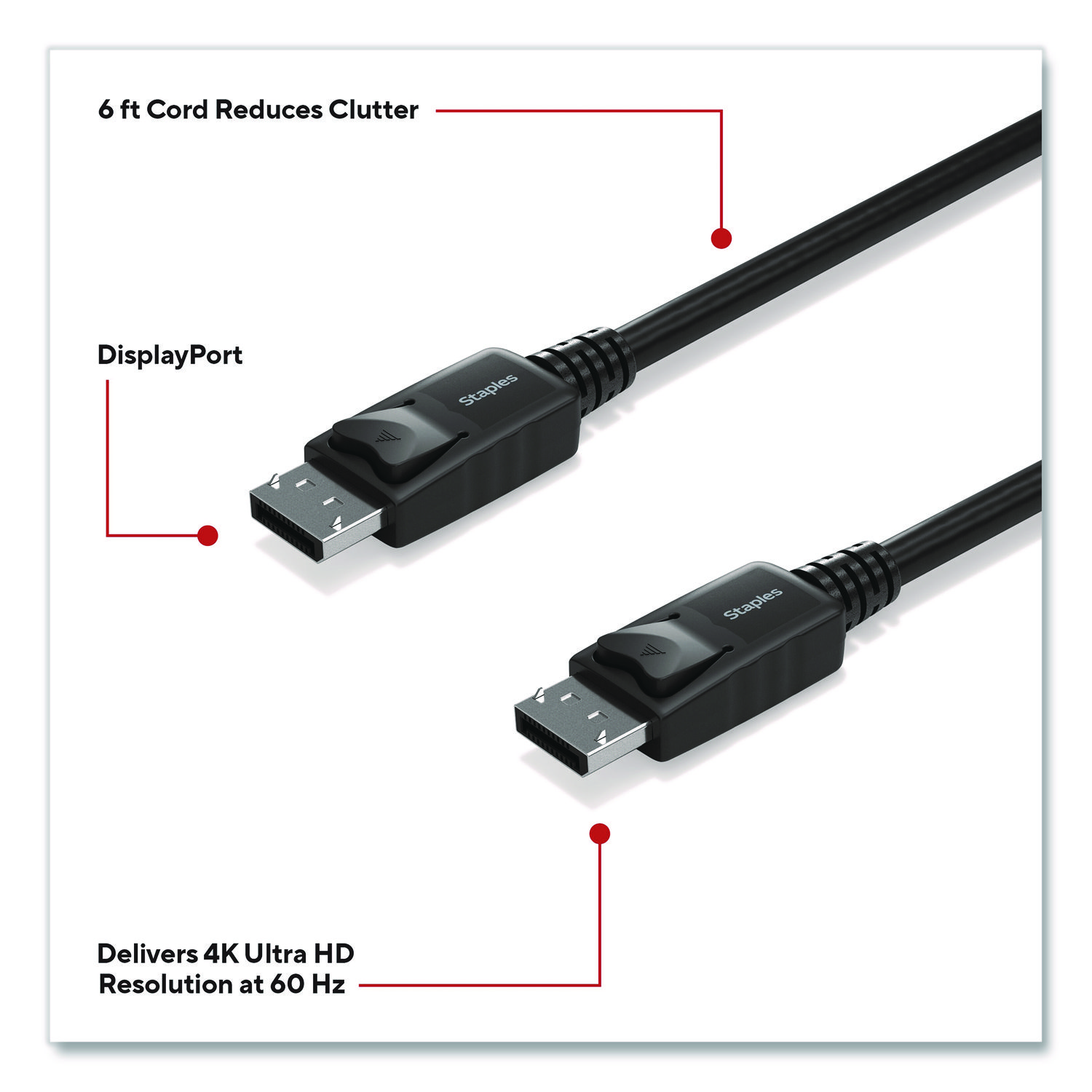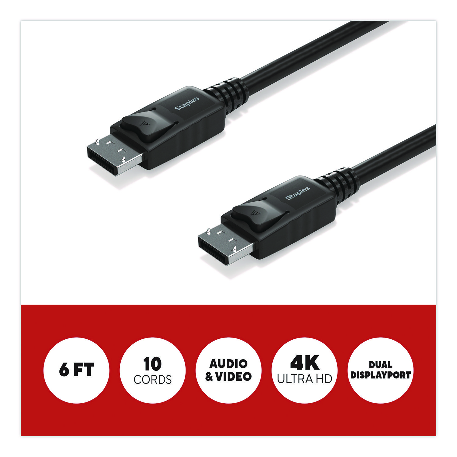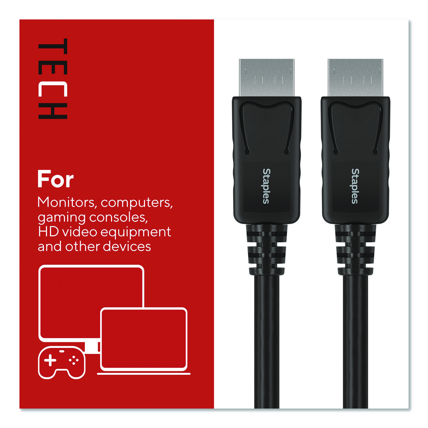 For work or entertainment an extra display often comes in handy. With the Staples TECH DisplayPort cable, you can connect additional monitors, displays, gaming consoles, projectors and more. Delivering crisp 4K Ultra HD resolution this cable promises clear audio and video for an exceptional experience. It provides ample length to connect devices across your workspace while also reducing cord clutter. This cable is the perfect choice for outfitting your work, gaming or entertainment space. Enjoy high resolution audio and video so you can upgrade your home or office workspace and do your best work. Cable Type: DisplayPort Cable; Connector/Port/Interface: DisplayPort Male; DisplayPort Male; Cable Length: 6 ft; Jacket Color: Black.