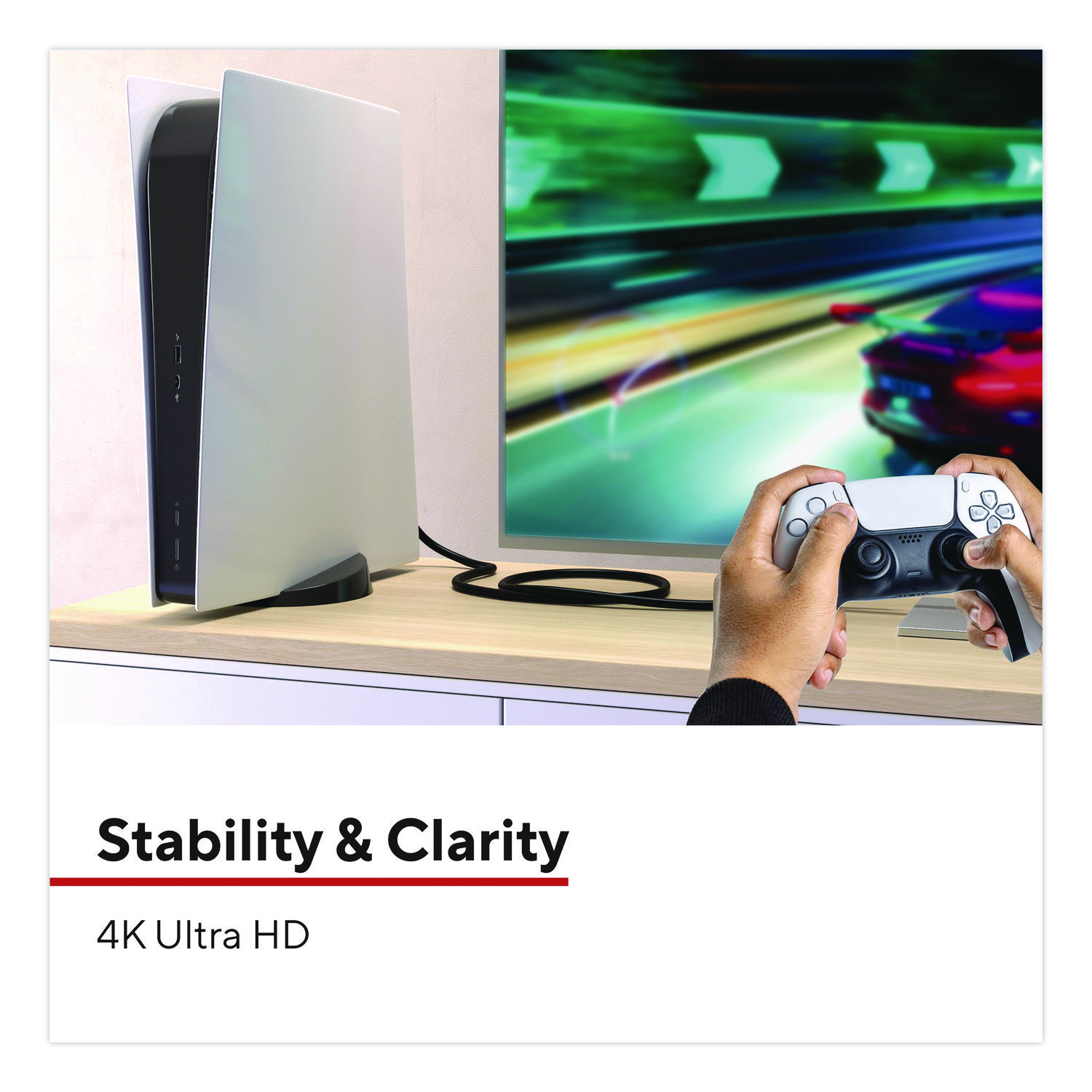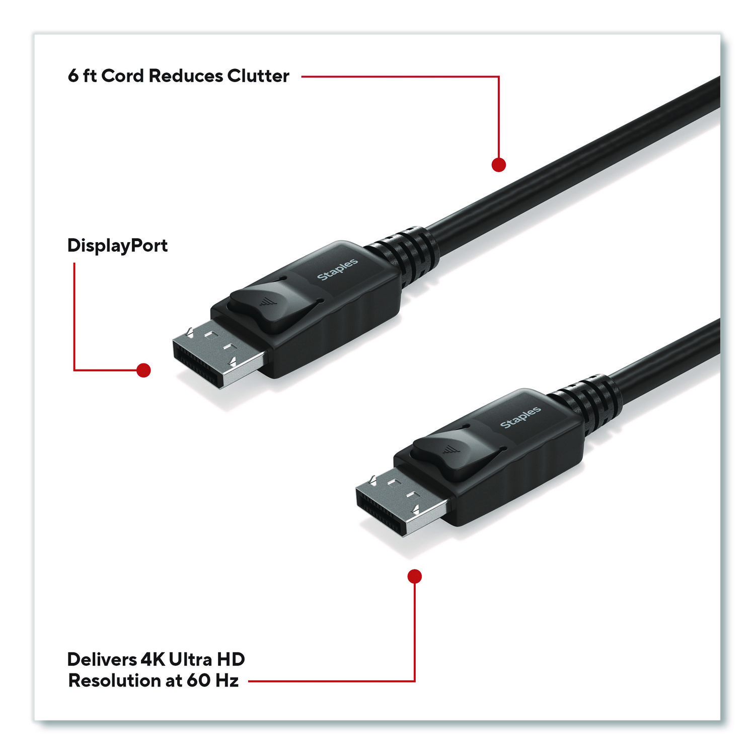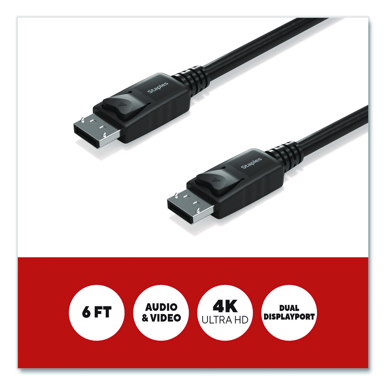 For work or entertainment an extra display often comes in handy. With the Staples TECH DisplayPort cable, you can connect additional monitors, displays, gaming consoles, projectors and more. Delivering crisp 4K Ultra HD resolution this cable promises clear audio and video for an exceptional experience. It provides ample length to connect devices across your workspace while also reducing cord clutter. This cable is the perfect choice for outfitting your work, gaming or entertainment space. Enjoy high resolution audio and video so you can upgrade your home or office workspace and do your best work. Cable Type: DisplayPort Cable; Connector/Port/Interface: DisplayPort Male; DisplayPort Male; Cable Length: 6 ft; Jacket Color: Black.