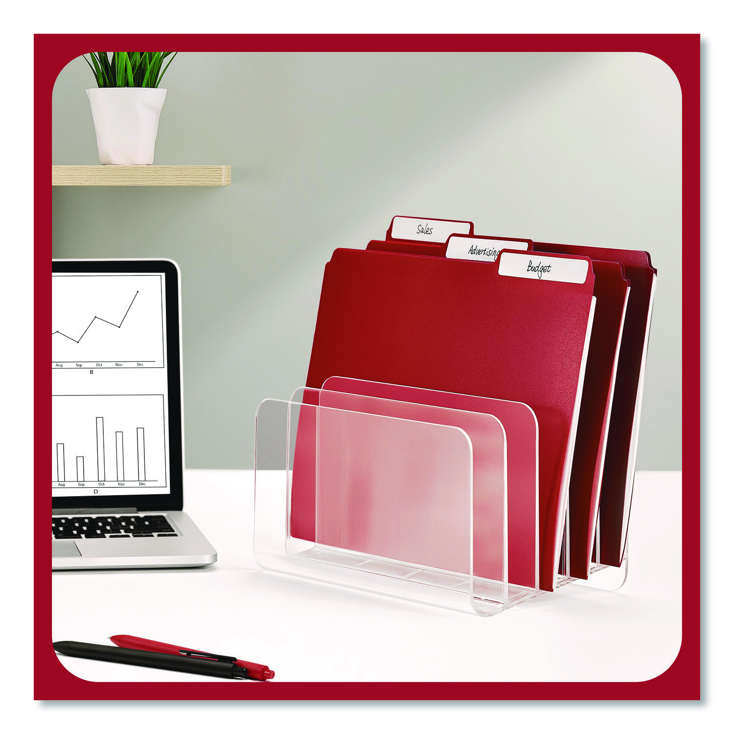 The staggered design displays stored documents clearly, and five individual compartments provide plenty of space for grouped storage. This plastic TRU REDâ„¢ five-slot incline sorter’s considered sizing leaves ample room for other workspace tools atop your desk. Number of Compartments: 5; For File Size: 8.5″ x 11″; Load Orientation: Top/Side; Color(s): Clear.