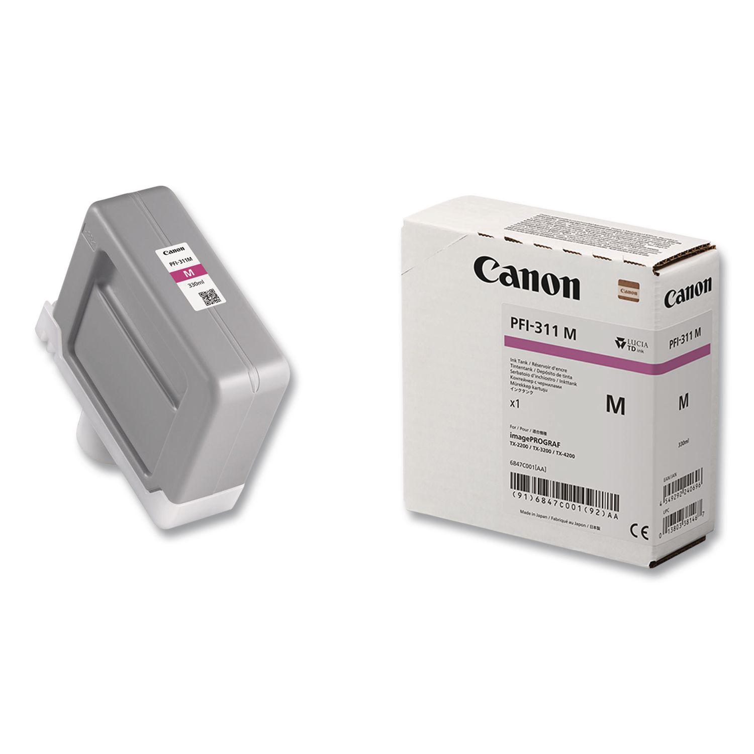 330ml Magenta LUCIA TD Pigment Ink Tank. Compatible with the imagePROGRAF TX-3200, TX-4200, TX-3200 MFP Z36, and TX-4200 MFP Z36 Large-Format Printers. Device Types: Wide Format Inkjet Printer; Color(s): Magenta; Supply Type: Ink; Market Indicator (Cartridge Number): PFI-311.