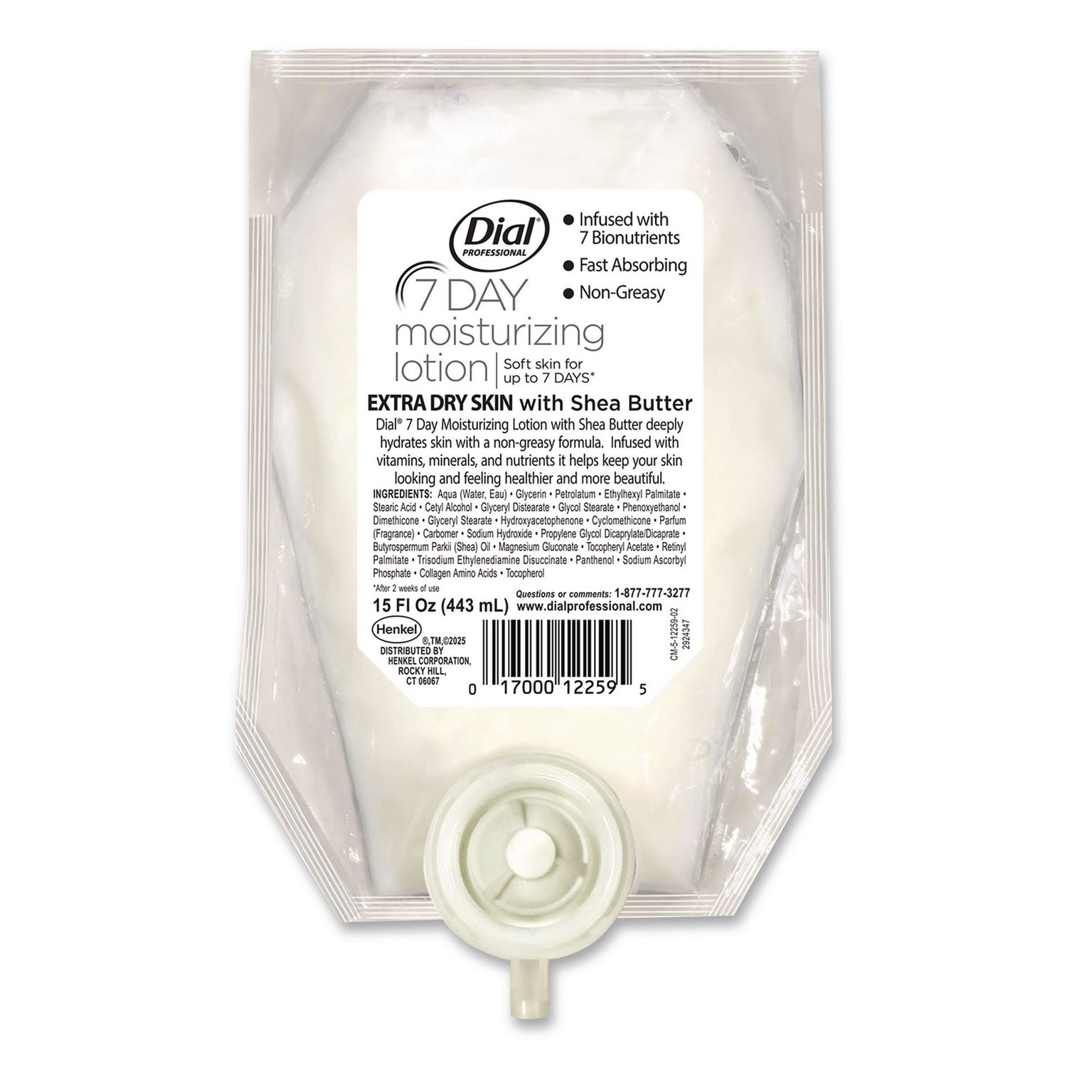 Shea butter deeply hydrates skin with a non-greasy formula. Infused with vitamins, minerals, and nutrients, it helps keep your skin looking and feeling healthier and more beautiful after two weeks use. Product Packaging: Refill Pouch; Volume Capacity: 15 oz; For Use With: Dial® Professional Versa Dispenser 34055; Quantity: 6/Carton.