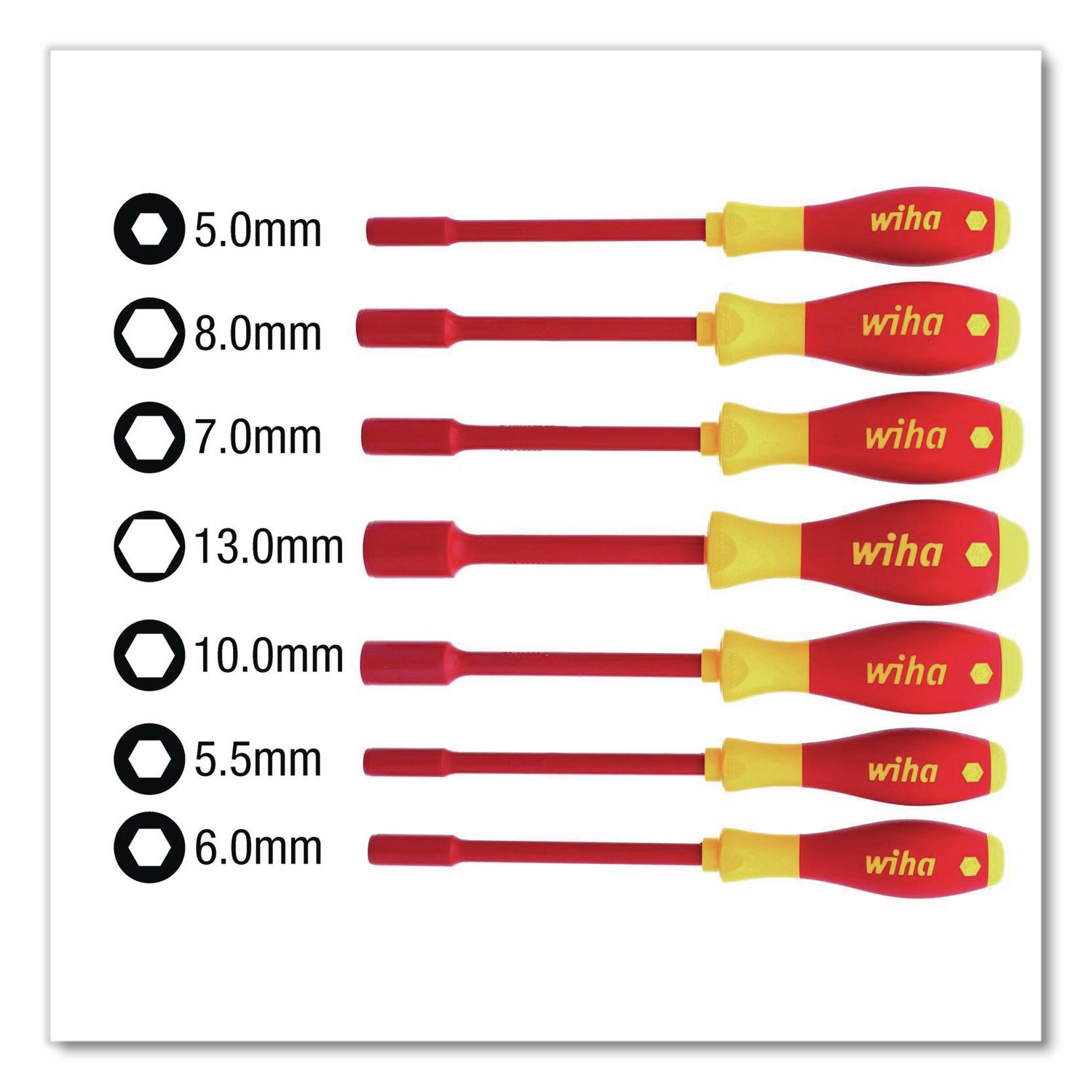 Every single Wiha® insulated tool is individually tested to 10,000 volts AC and rated to 1,000 volts AC (1,500 volts DC) for safety and peace of mind in energized applications. This tool is VDE Certified and meets EN/IEC 60900 testing standards for protection against arc flash explosion, ASTM F1505 standard specifications for insulated and insulating hand tools and CSA testing benchmarks for safety and performance. Made in Germany and Backed by the Wiha® No Hassle Guarantee. Screwdrivers and Nut Drivers Tool Type: Nut Driver Set; Tip/Socket Type(s): Metric Hex; Tip/Socket Size(s): 5 mm; 6 mm; 7 mm; 8 mm; 9 mm; 10 mm; 11 mm; 12 mm; 13 mm; Tip/Socket Material: Steel.
