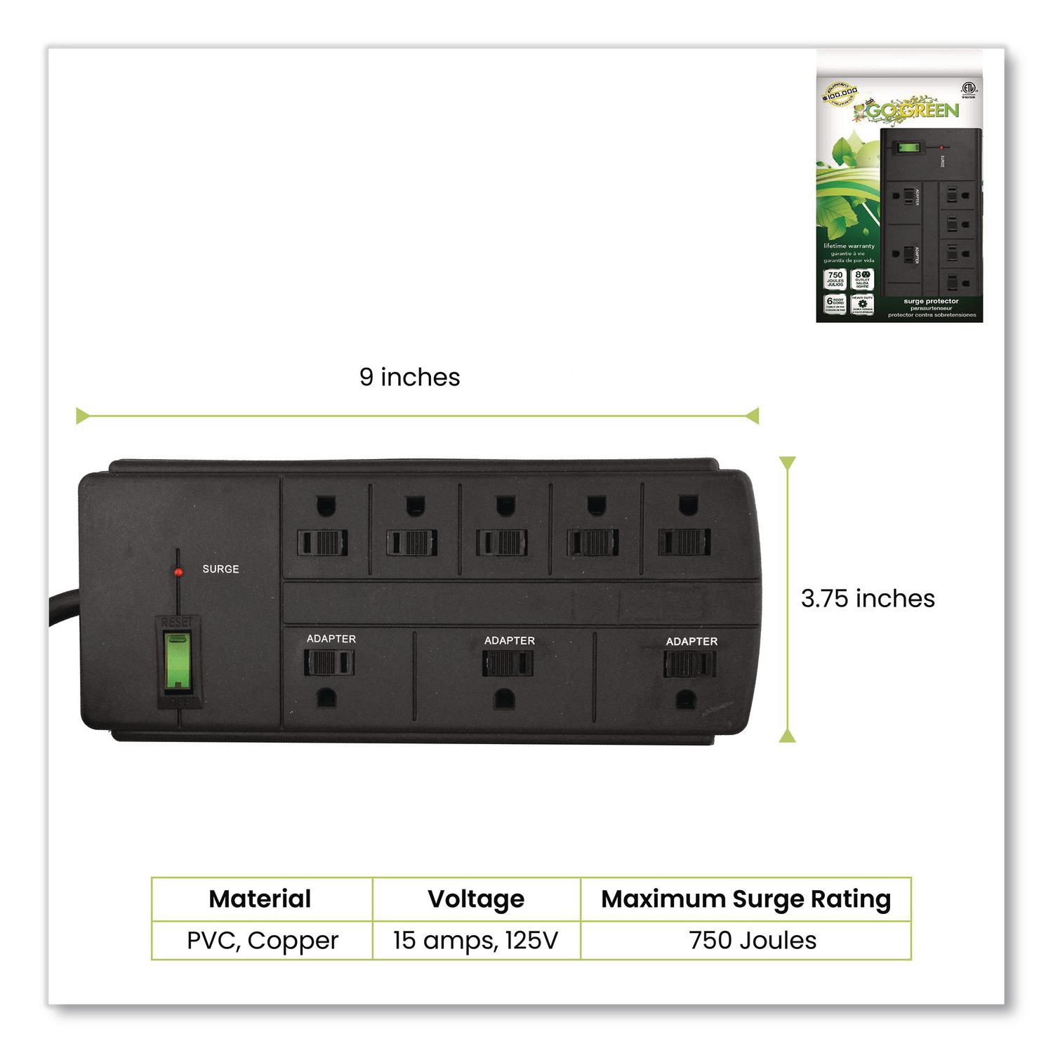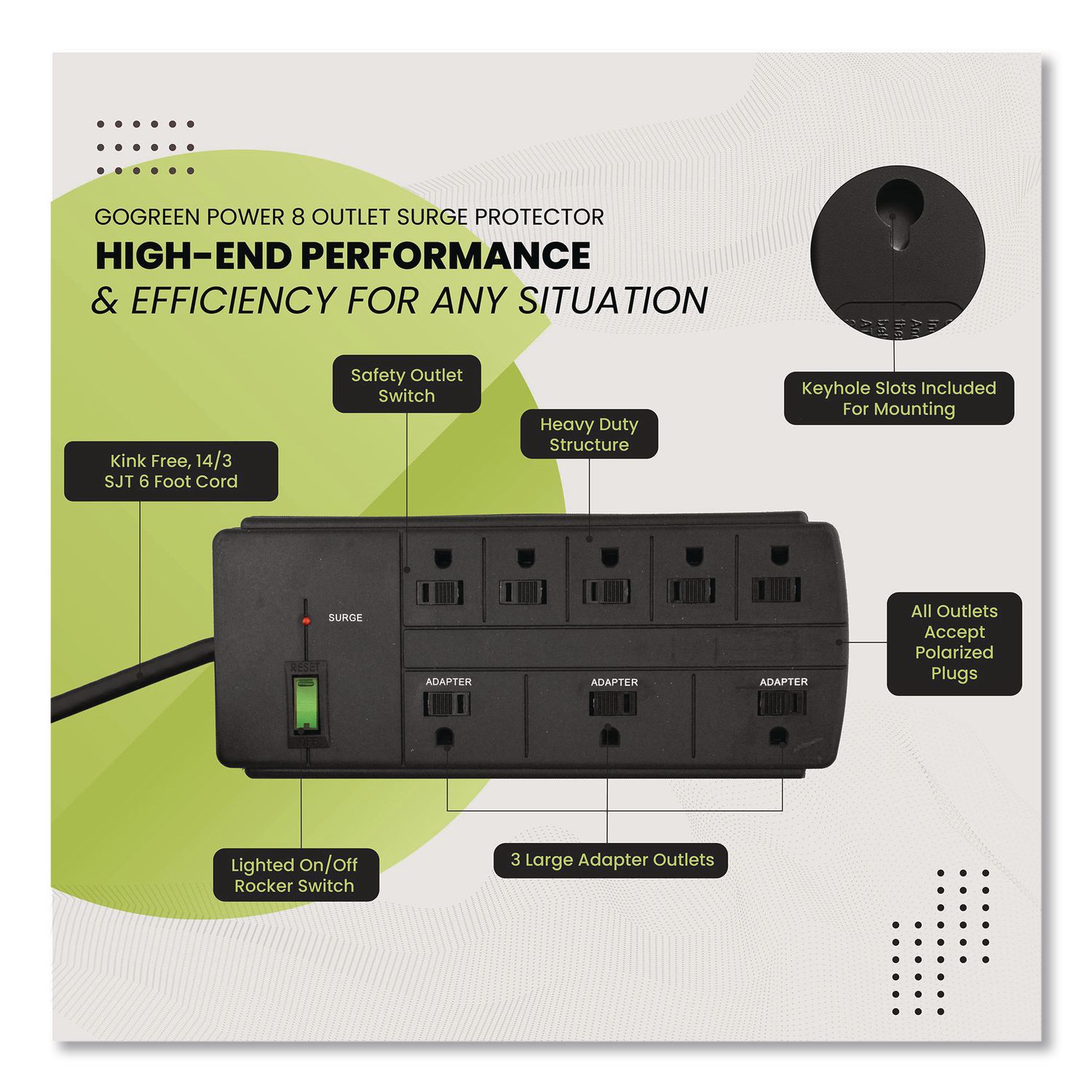 The GoGreen Power 8 Outlet Surge Protector is the solution to the situations where you need something a bit more heavy duty to protect your electronic devices. When the going gets tough, the tough get going, and this power outlet surge protector lives up to the saying! The surge strip comes with a robust 15 A, 1,875 W resettable circuit breaker/rocker switch combo, that protects your unit in case of a surge spike. This safety feature helps protect various electrical appliances such as televisions, computers, laptops and much more! Also built into the circuit breaker/rocker switch is an indicator light that confirms operation for the unit. It comes with five standard adapters and three outlets for large adapters. Ideal for almost any indoor electrical appliances. Hook up your charger to it, televisions, gaming systems, laptops, or use it to power your desktop at the office! The possibilities are endless with this surge protector. The service cord attached to the surge protector is constructed of 14-gauge SJT cable housed in a durable PVC insulation and jacket that makes this heavy-duty cord strong enough to last a lifetime but pliable enough to be fully extended. The surge strip also offers a sturdy base for your centralized power station by simply attaching your unit where you need it most. The included keyhole slots on the back of the surge protector make it a breeze to mount your unit to a wall, desk, workbench or counter. We offer free recycling and free shipping back of the used product to our recycling facility. Please view the recycling code and instructions on the back of the package and visit the GoGreen Power website for additional information. Number of Outlets: 8; Joules Of Surge Protection: 750 J; Lines: 1; Protection Type: Surge.