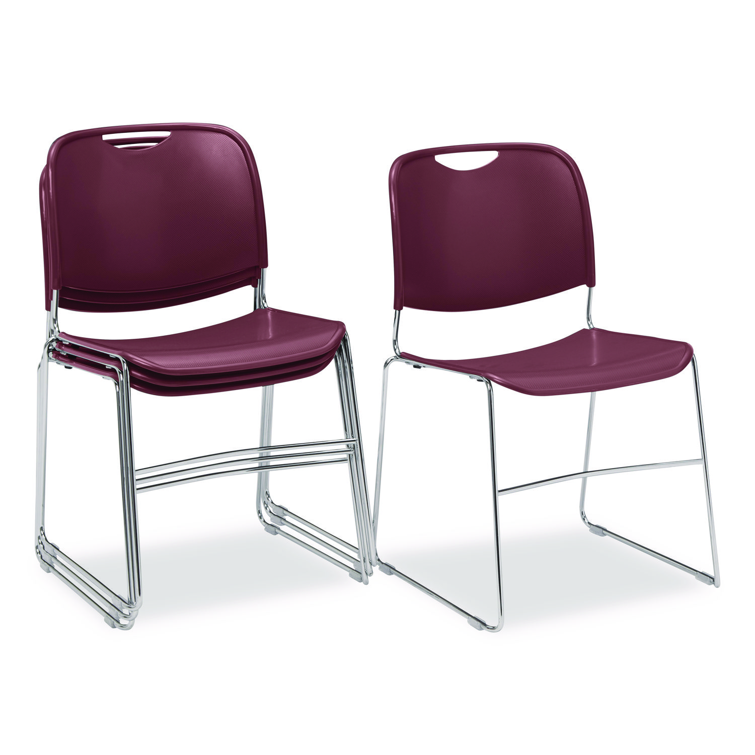 The popular 8500 Series Ultra-Compact Stack Chair stacks up to 40 units high for quick clean-up and efficient storage in cafeteria-type settings. Each has an injection-molded, textured, polypropylene, waterfall-style seat and flexible backrest contoured for maximum ergonomic comfort. The plastic won’t fade or scratch and is easy to keep clean. The durable 11 mm solid steel-rod chrome-plated frame features under-seat ribbing for reinforced support and prevents cracking. Chair is lightweight, with a built-in backrest handle allowing for easy portability. Sled-style base moves easily over carpeted surfaces while clamping protective glides keep floors unscathed. Recommended Application Area(s): Breakroom & Foodservice; Conference & Meeting; General Office & Task; Seat Color: Burgundy; Back Color: Burgundy; Color Family: Red.
