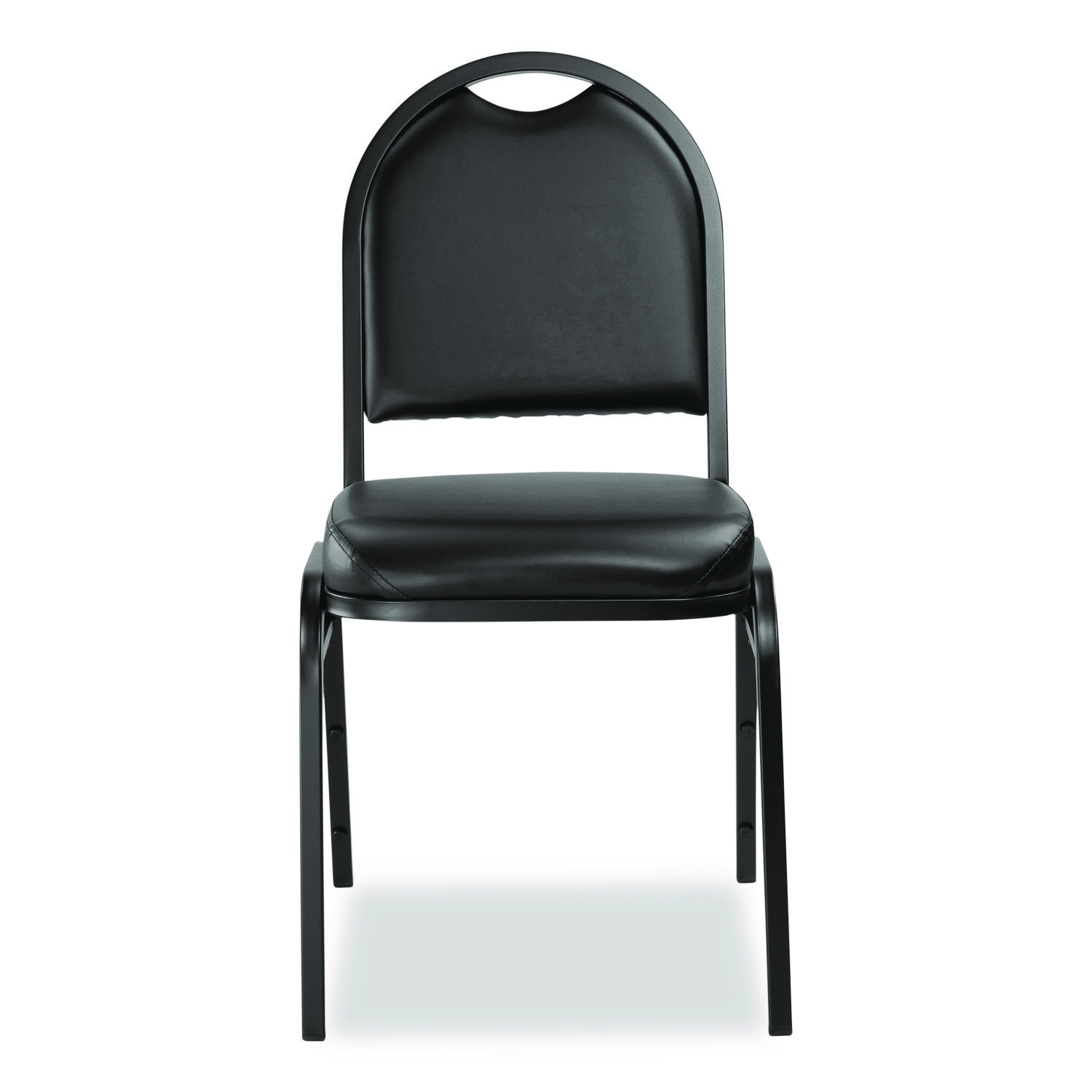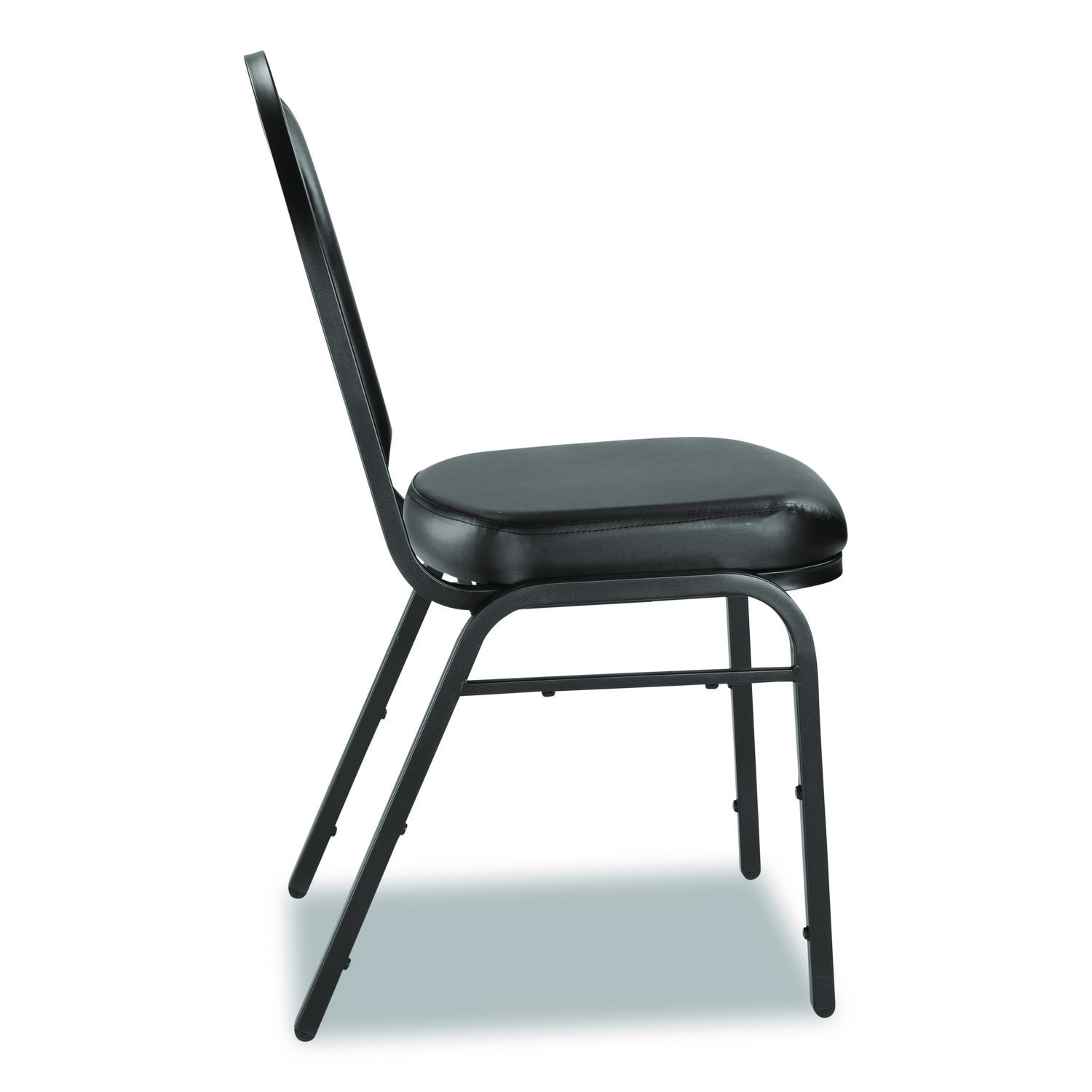 The 9200 Series Premium Upholstered dome-back stack chair is durable and classy enough to use in your busiest social setting, be it a dining room or corporate banquet hall. It features a strong square, 18-gauge steel frame plus an under-seat H-shaped brace for extra support. The seat features supremely comfortable and spacious 2″-thick high-density foam padding and a waterfall-style edge. MDF core within both the seat and rounded backrest which has a built-in handle for easy moving and stacking. Fortifying stacking bars and 12 plastic bumpers protect the powder-coated paint finish from scratches when the chair is stacked. East-to-Clean Vinyl Upholstery. Recommended Application Area(s): Breakroom & Foodservice; Conference & Meeting; General Office & Task; Seat Color: Black; Back Color: Black; Color Family: Black.