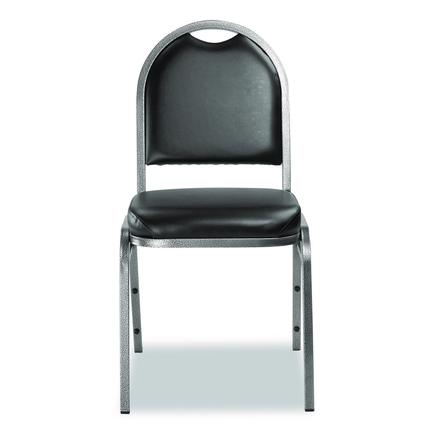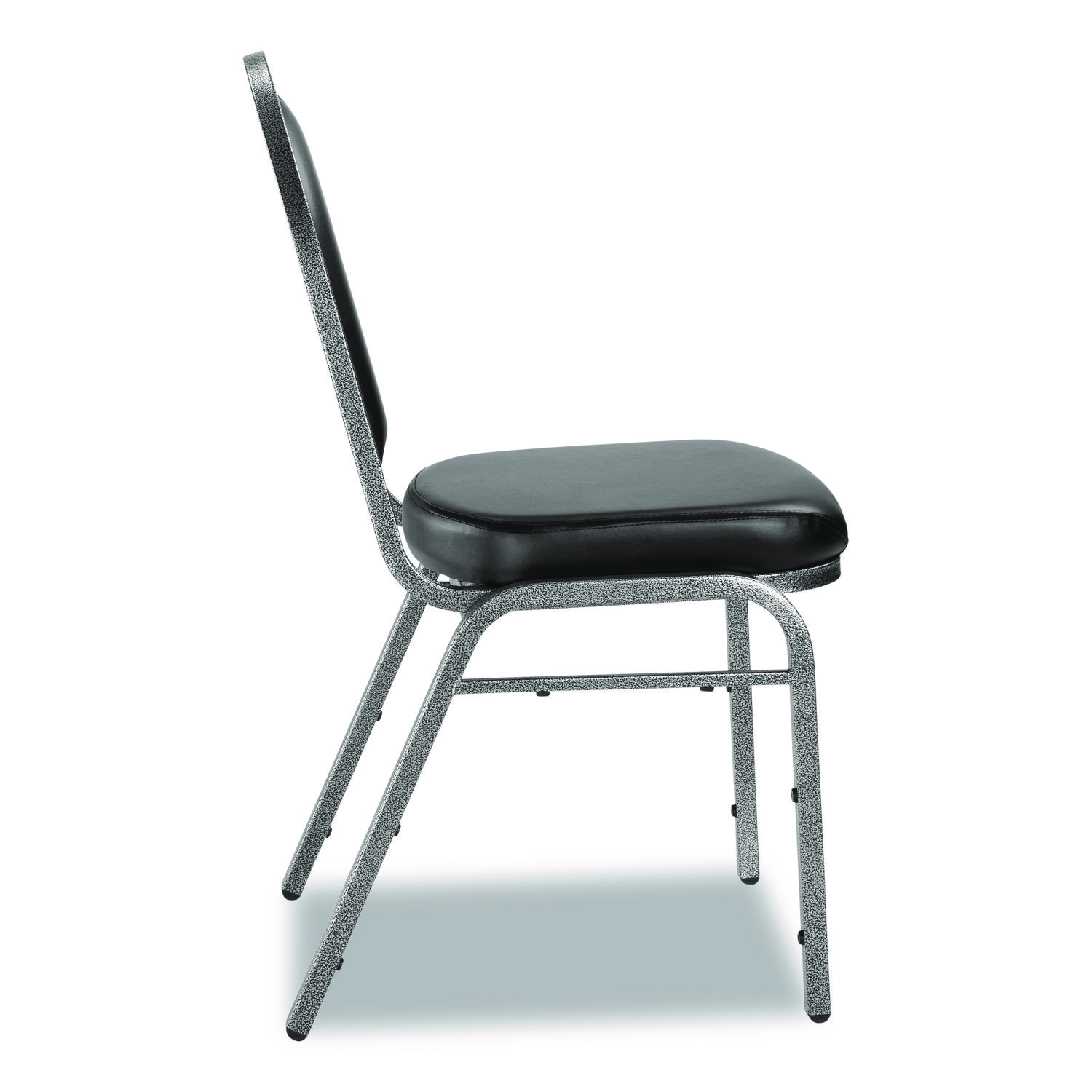 The 9200 Series Premium Upholstered dome-back stack chair is durable and classy enough to use in your busiest social setting, be it a dining room or corporate banquet hall. It features a strong square, 18-gauge steel frame plus an under-seat H-shaped brace for extra support. The seat features supremely comfortable and spacious 2″-thick high-density foam padding and a waterfall-style edge. MDF core within both the seat and rounded backrest which has a built-in handle for easy moving and stacking. Fortifying stacking bars and 12 plastic bumpers protect the powder-coated paint finish from scratches when the chair is stacked. Easy-to-Clean Vinyl Upholstery. Recommended Application Area(s): Breakroom & Foodservice; Conference & Meeting; General Office & Task; Seat Color: Black; Back Color: Black; Color Family: Black.