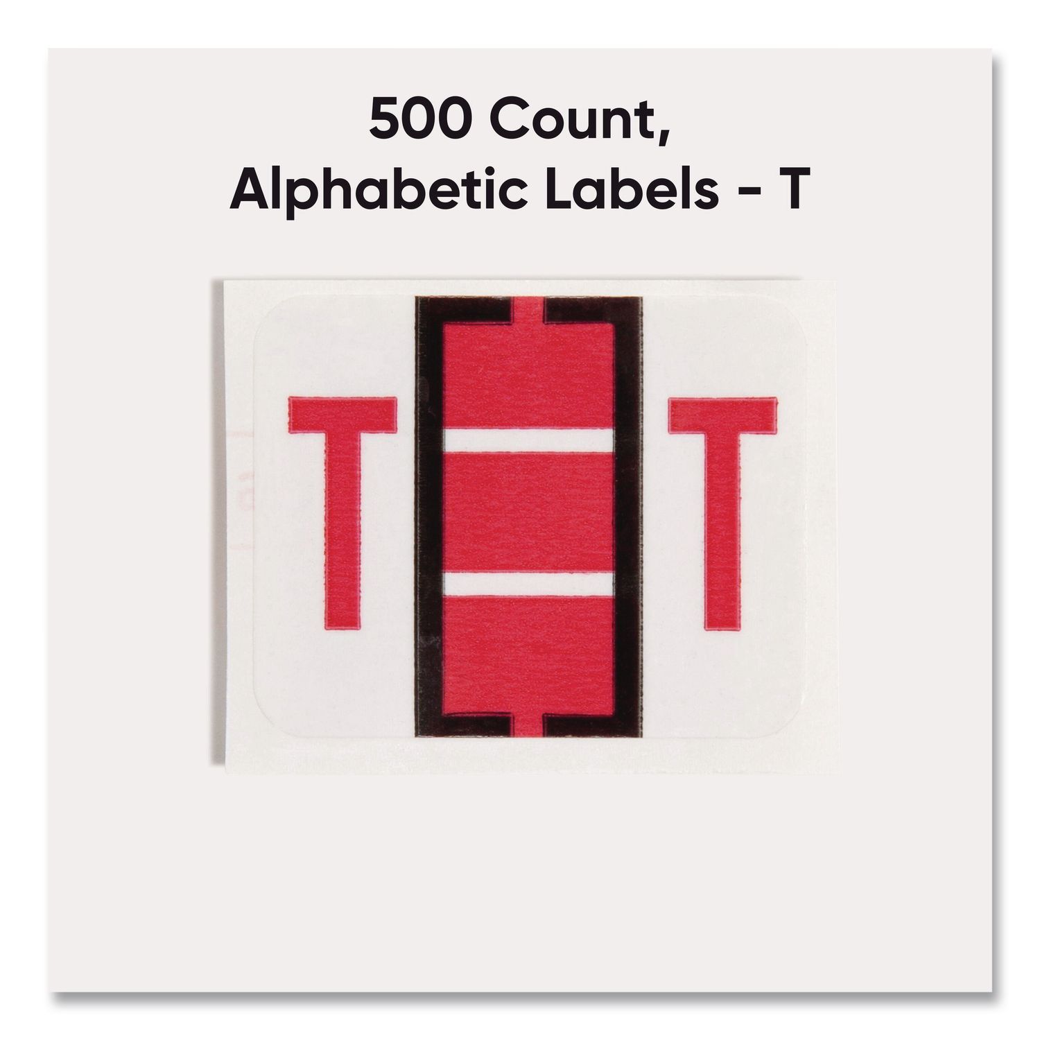 Keep files organized at a glance with these alphabetic labels that feature a wraparound solid color bar and a colored character printed on a white background. Colors are compatible with end tab systems using the bar-style format. Convenient dispensing box for easy peel off and application. Includes 500 labels per roll. Compatible with TabĀ® Products 1283 series alphabetical labels. Shape: Rectangular; Label Size – text: 1 x 1.25; Label Color(s): White; Color Family: White.