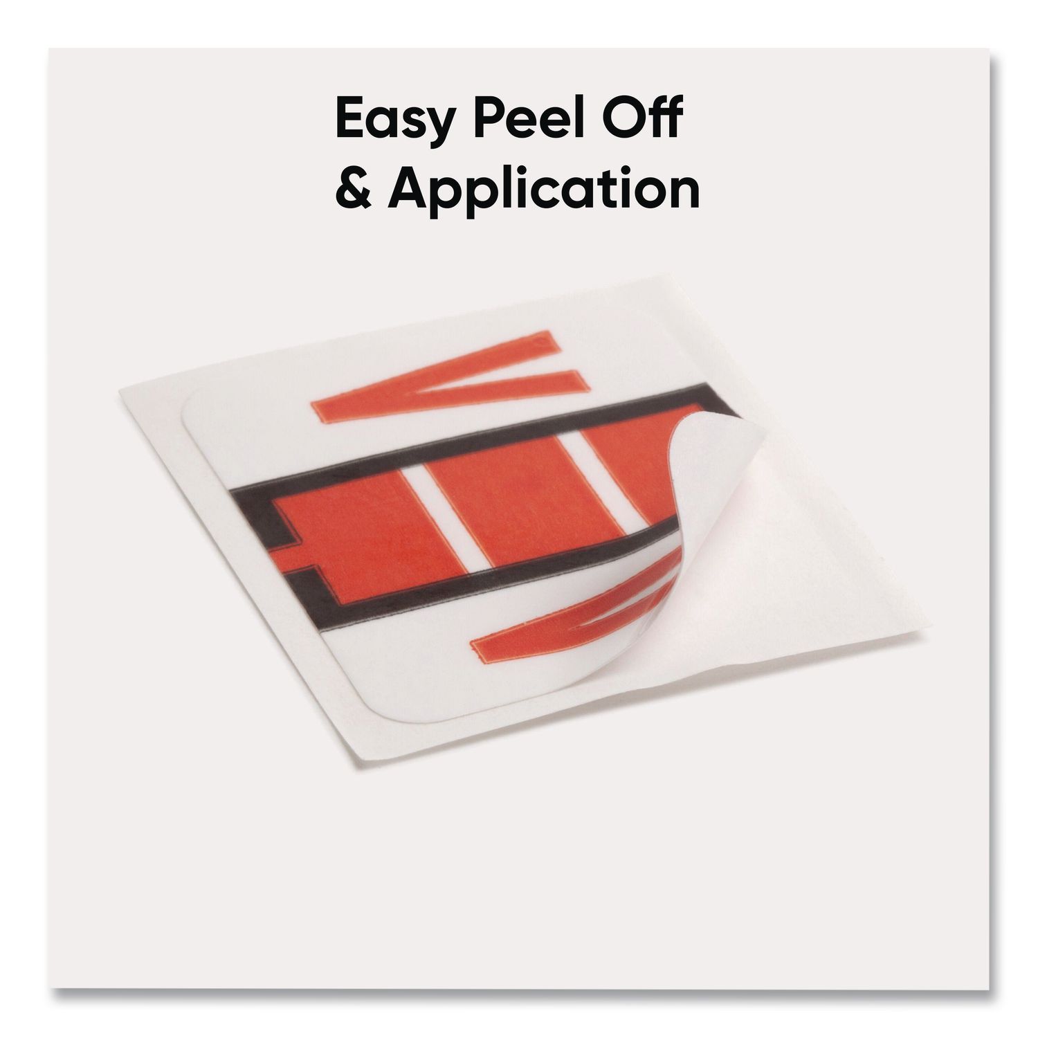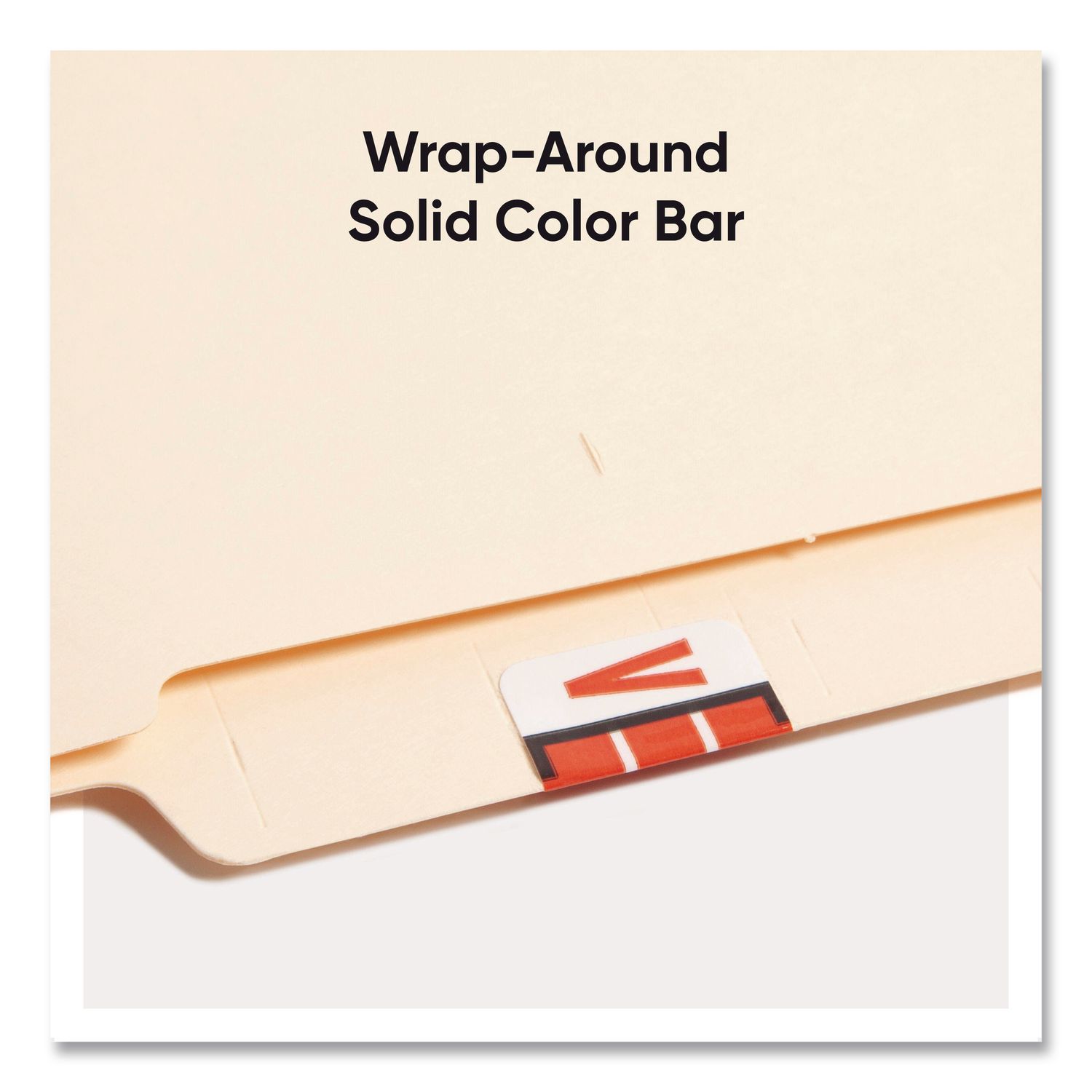 Keep files organized at a glance with these alphabetic labels that feature a wraparound solid color bar and a colored character printed on a white background. Colors are compatible with end tab systems using the bar-style format. Convenient dispensing box for easy peel off and application. Includes 500 labels per roll. Compatible with TabĀ® Products 1283 series alphabetical labels. Shape: Rectangular; Label Size – text: 1 x 1.25; Label Color(s): White; Color Family: White.