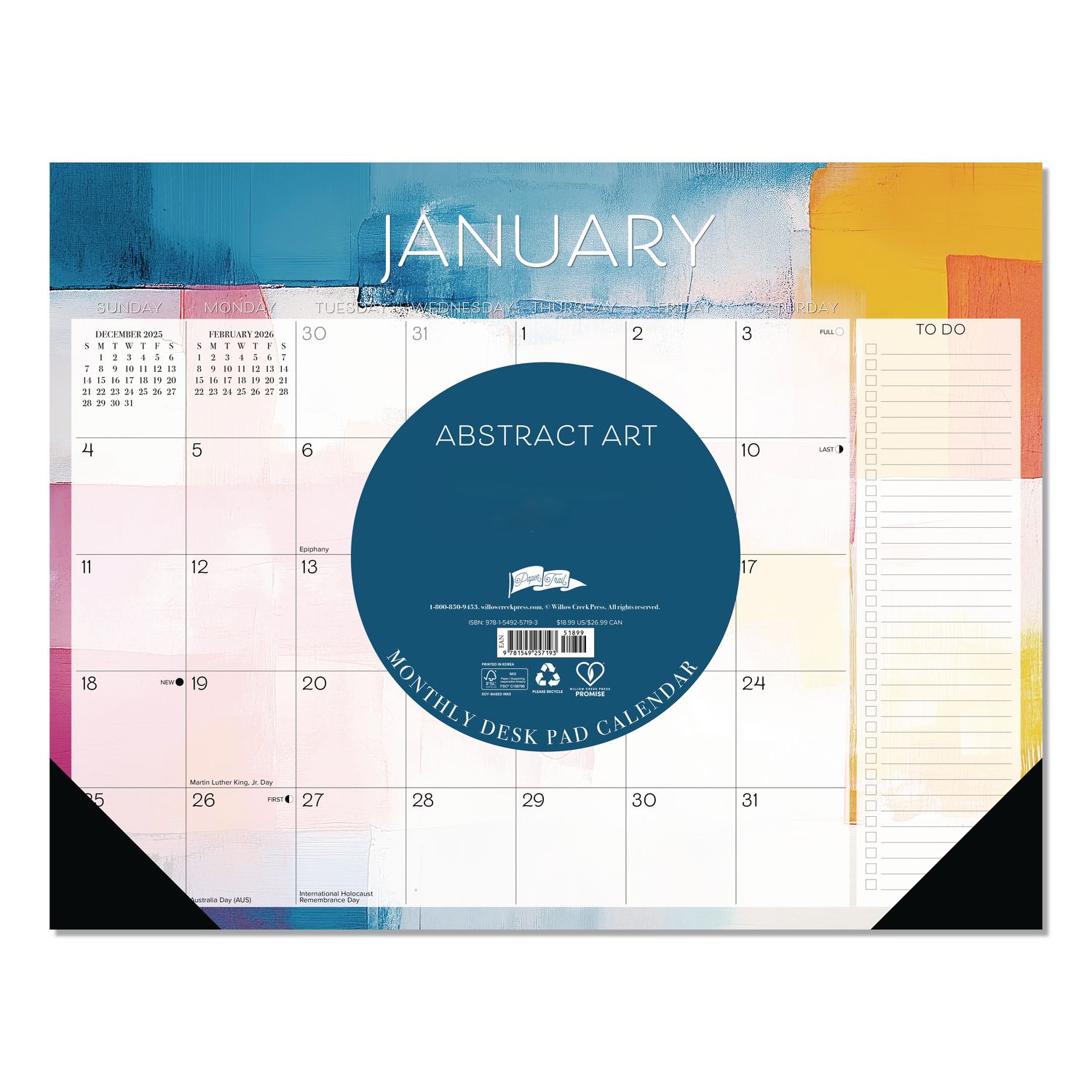 Abstract Art Large Monthly Desk Pad Calendar, 22×17, White/Multicolor Sheets, Black Headband/Corners, 12-Month (Jan-Dec) 2026