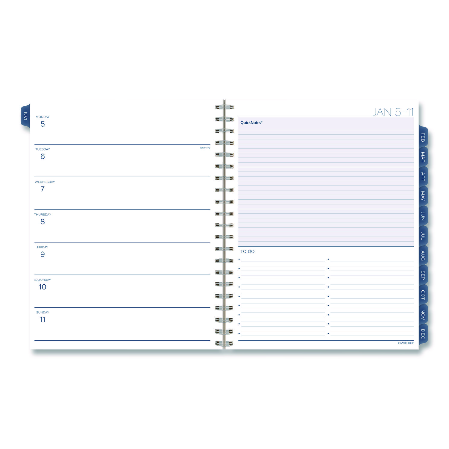 | Calendar Spread Format: | One Week per Two-Page Spread; One Month per Two-Page Spread |