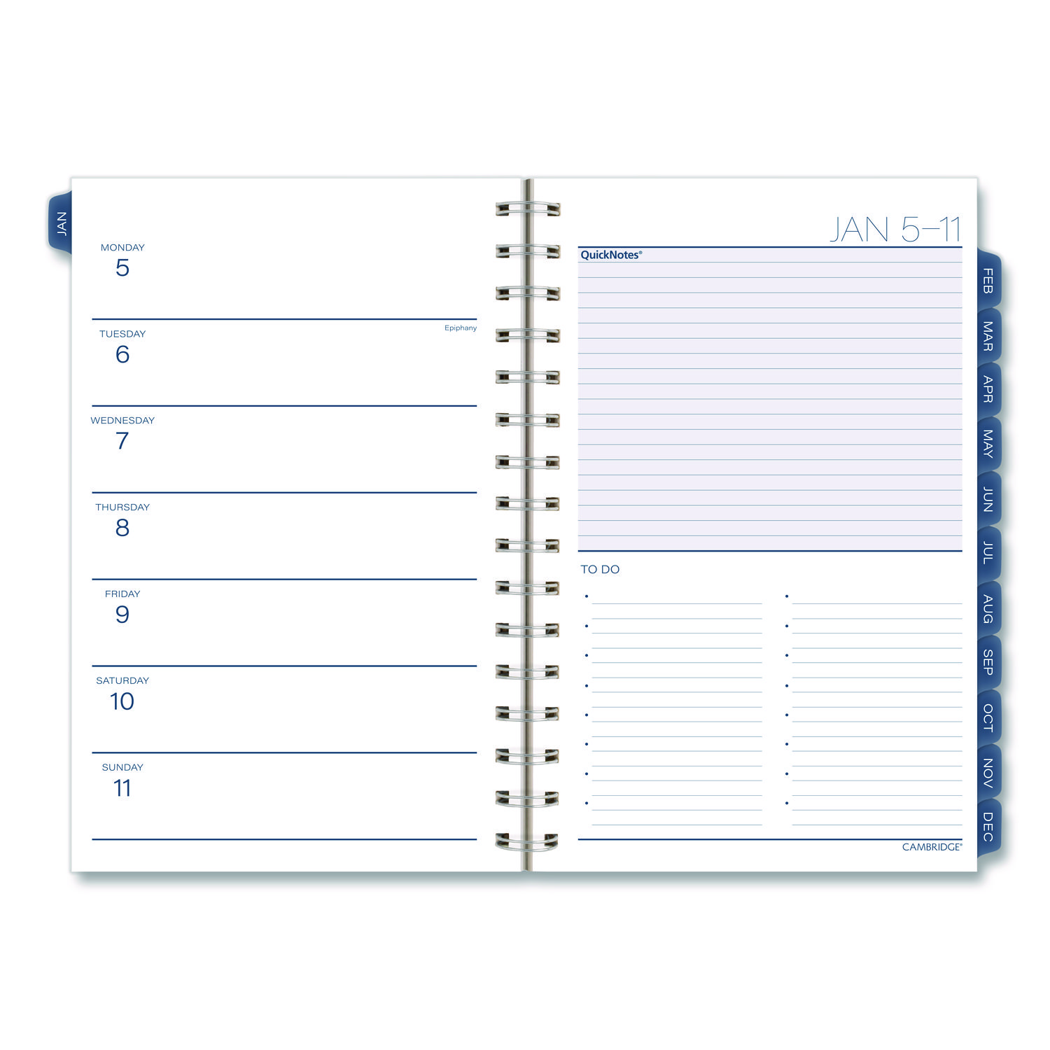 Plan with style this year when you use the Cambridge Abyss Weekly Monthly Planner. Bring tranquility to your plans with the blue water-inspired design. Start fresh each week. Weekly spreads have open daily sections paired with a QuickNotes® area and To-Do list to easily keep track of important details. See how much you can accomplish in one month! The tabbed monthly pages help you see your big picture plans in an instant. Who doesn’t love extras? Special pages include a double-sided poly pocket, three-year reference calendar and others. The durable poly cover helps the planner stand up to wear and tear no matter where your day takes you. Our twin wire binding helps keep your pages secure and won’t snag on your bag or clothing. Dated: Yes; Academic Year: No; Calendar Format: Weekly/Monthly; Calendar Spread Format: One Week per Two-Page Spread; One Month per Two-Page Spread.