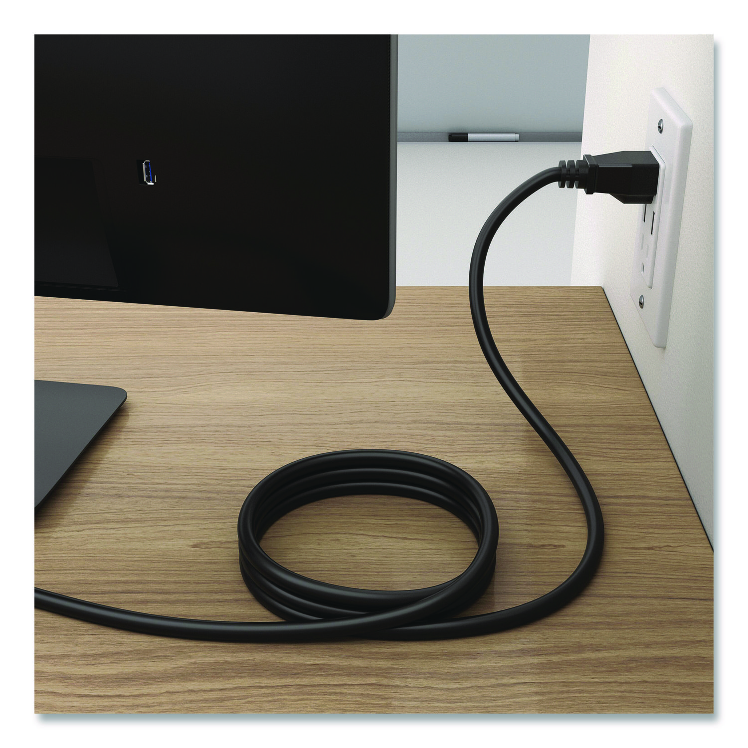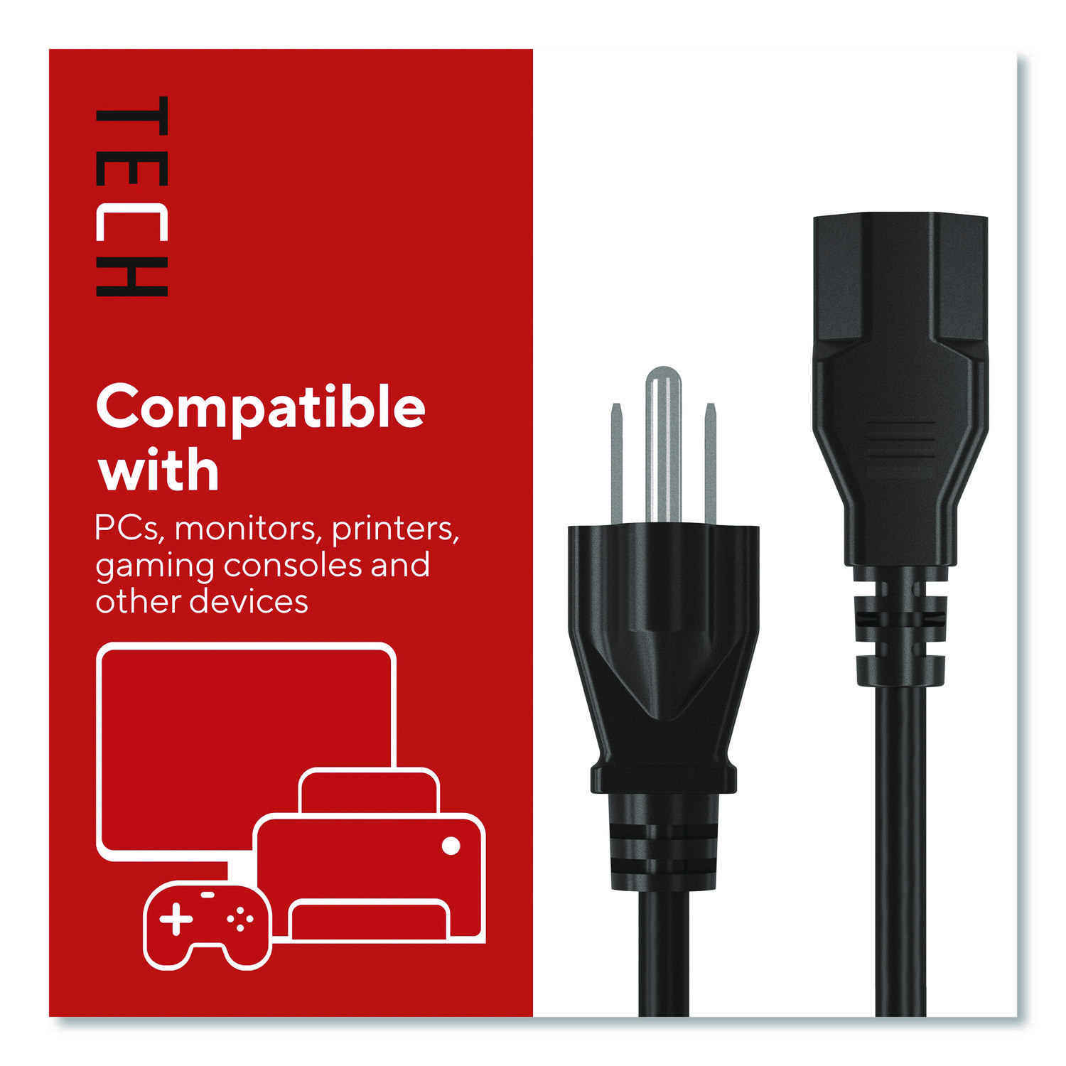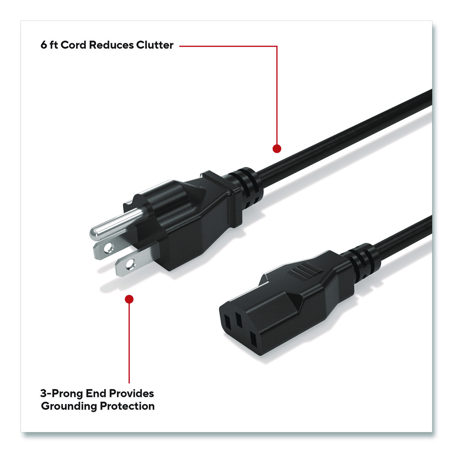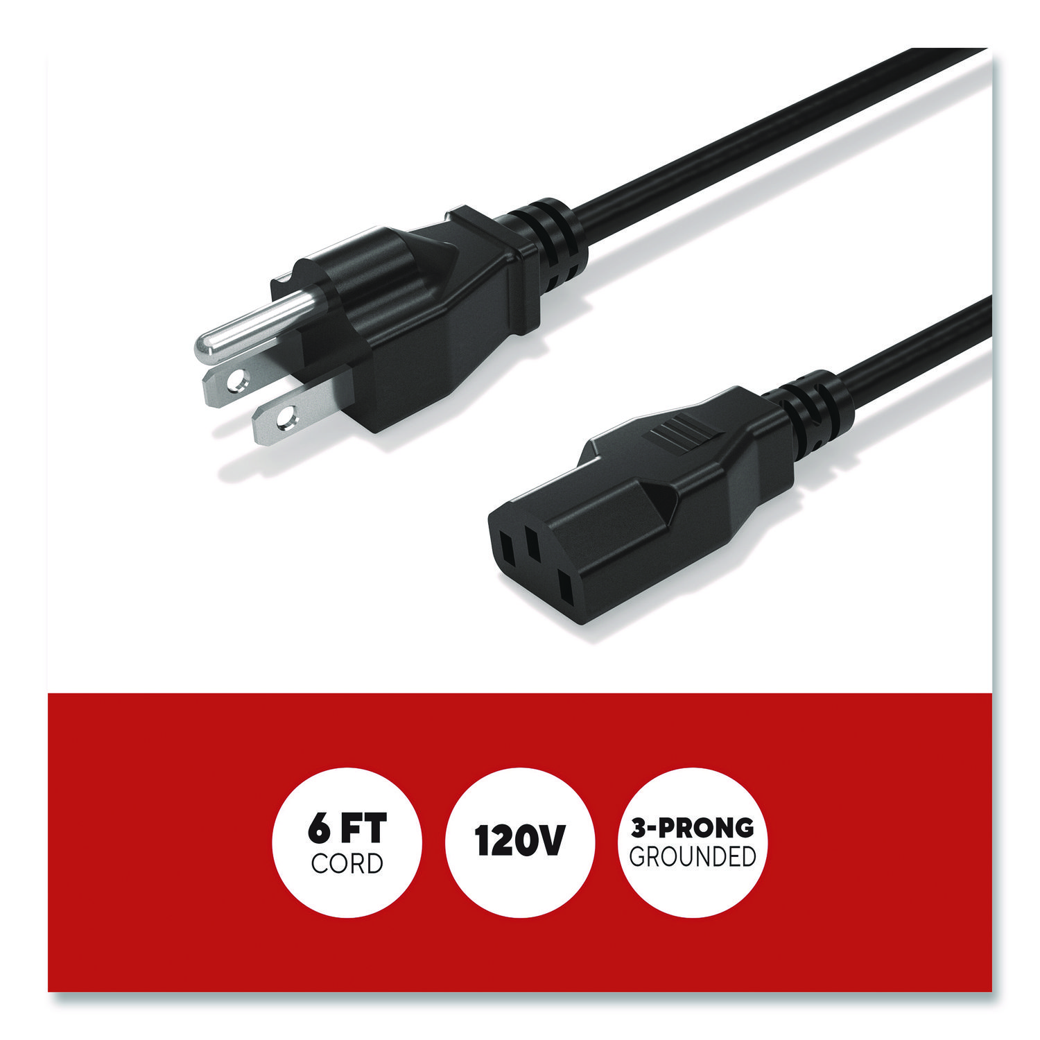 This power cable features built-in 3-prong grounding for enhanced safety. It gives you enough length for everyday setups but is short enough to keep clutter to a minimum. It’s versatile, so you can use it with PCs, monitors, printers, gaming consoles and more. It also delivers reliable 120 V power. Power up and stay that way in your home or office. Cable Type: Power Cord; Cable Length: 6 ft; Jacket Color: Black.