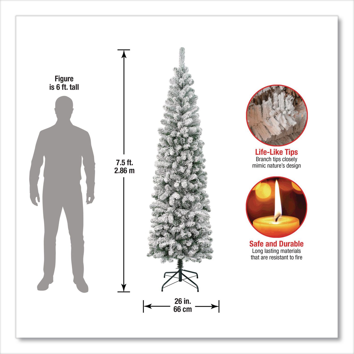 Acacia Pencil Slim Flocked Tree, 26″ x 26″ x 88.5″, Green Tree, Green Tree Stand