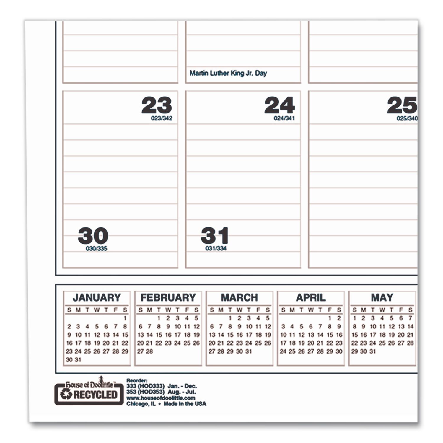 Ruled daily blocks keep notations neat. Full-year reference calendar aids in planning throughout the year. Neutral graphics match any décor. Wirebound with a full chipboard backer and a sturdy wire hanger. Made entirely of recycled materials. Academic Year. Dated: Yes; Academic Year: Yes; Calendar Format: Monthly; Calendar Spread Format: One Month per Page.