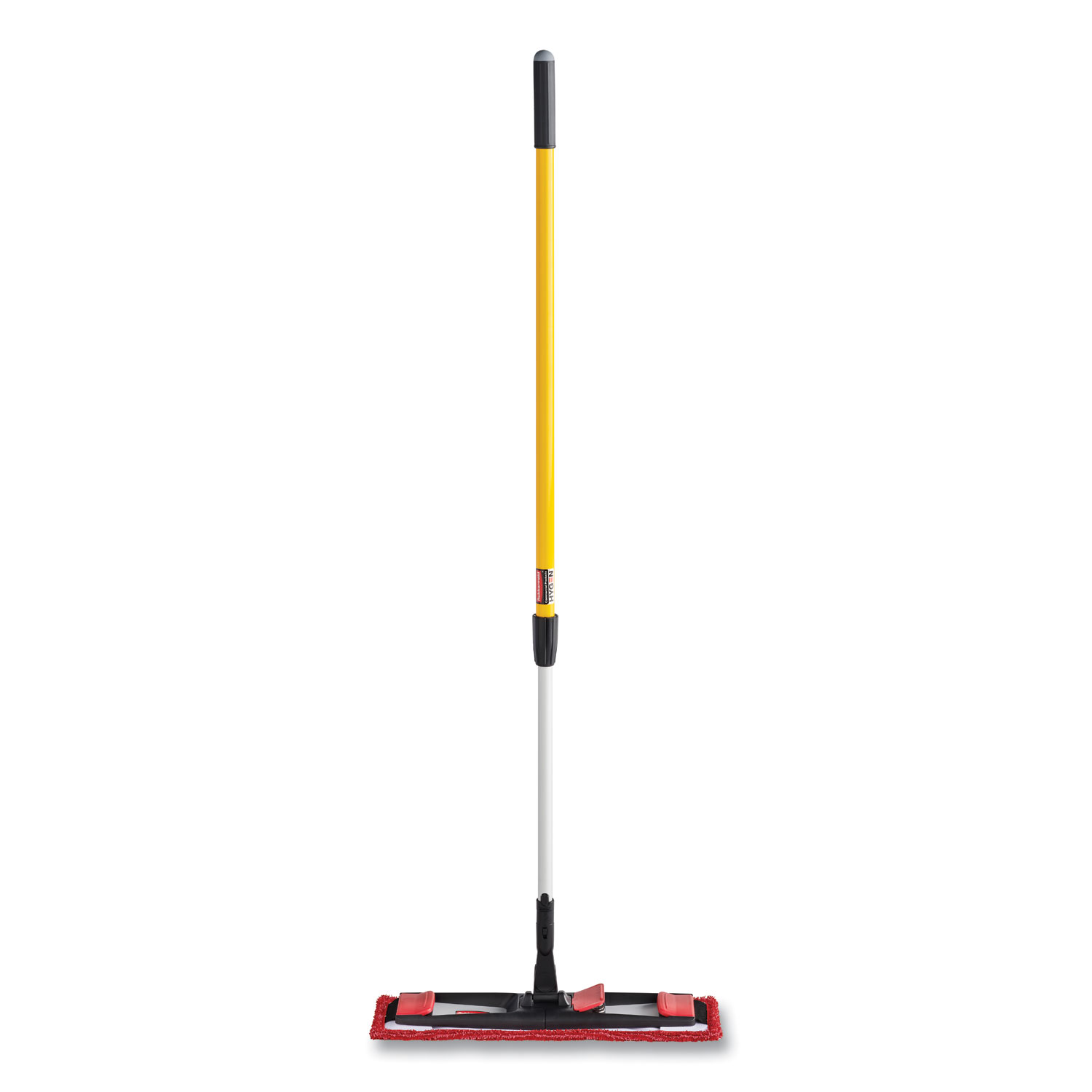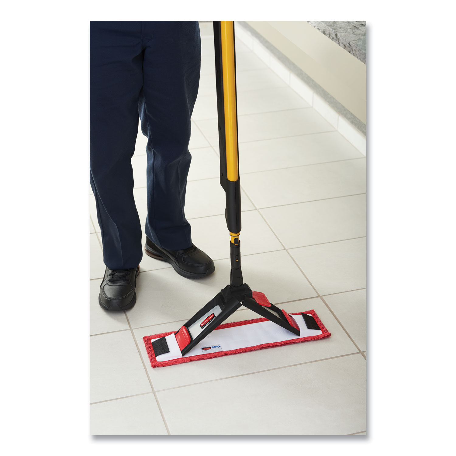 The Adaptable Flat Mop Pad connects to the Adaptable Flat Mop Frame via tabs or pockets for two styles of microfiber mopping in large spaces. Strong black tabs connect to frame via red clips to hold mop pad on during rinsing and wringing. Pocket function allows for simple microfiber mopping with your spray mop handle. Made of high-quality polyester/nylon split microfiber, the pad can be laundered up to 200 times (100 with bleach). Compatible with Quat, chlorine bleach, and hydrogen peroxide. Microfiber pad removes 99.7% or more of tested viruses (Feline Calicivirus a surrogate for Norovirus) and bacteria (MRSA, Pseudo, C.diff) with water only to help improve cleaning efficacy. Floors dry 4X faster when mopping with microfiber pads, compared to Rubbermaid large cotton string mops. Mop Head Type: Microfiber Flat Wet Mop Pad; Application: Floors; Mop Head Style: Pad; Mop Head Size: 19.5″ x 5.5″.