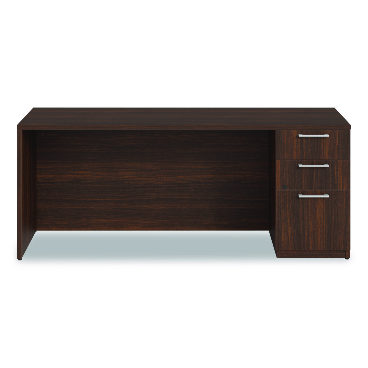 A versatile and durable addition to any office environment, combining modern design with high functionality. Built with a single pedestal, this credenza provides efficient storage space for important files and office supplies, keeping your workspace organized and clutter-free. Its laser edge band design adds a clean, finished look that enhances the overall aesthetic of your office. Constructed from high-quality particleboard and featuring a thermofused melamine (TFM) finish, it is designed to withstand the rigors of daily use. The durable, high-performance laminate surface resists impacts, scratches, and burns, ensuring long-lasting durability while maintaining a polished appearance. Pair it with returns and bridges to configure an L-shaped or U-shaped workstation that suits your needs. Its adaptability makes it perfect for both individual offices and collaborative workspaces. For added convenience, it is equipped with adjustable glides, allowing it to be easily leveled on uneven surfaces, ensuring stability and comfort. Color(s): Mahogany; Color Family: Mahogany; Pedestal Count: 1; Drawer Configuration: Right: Box/Box/File.