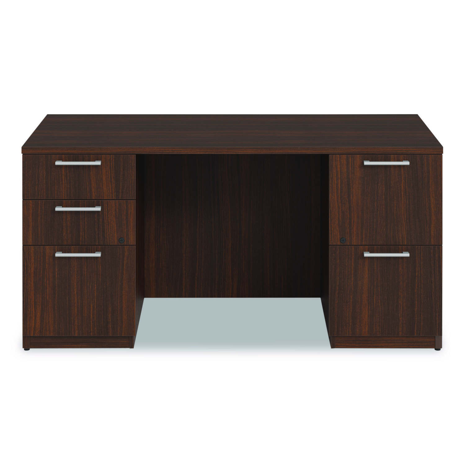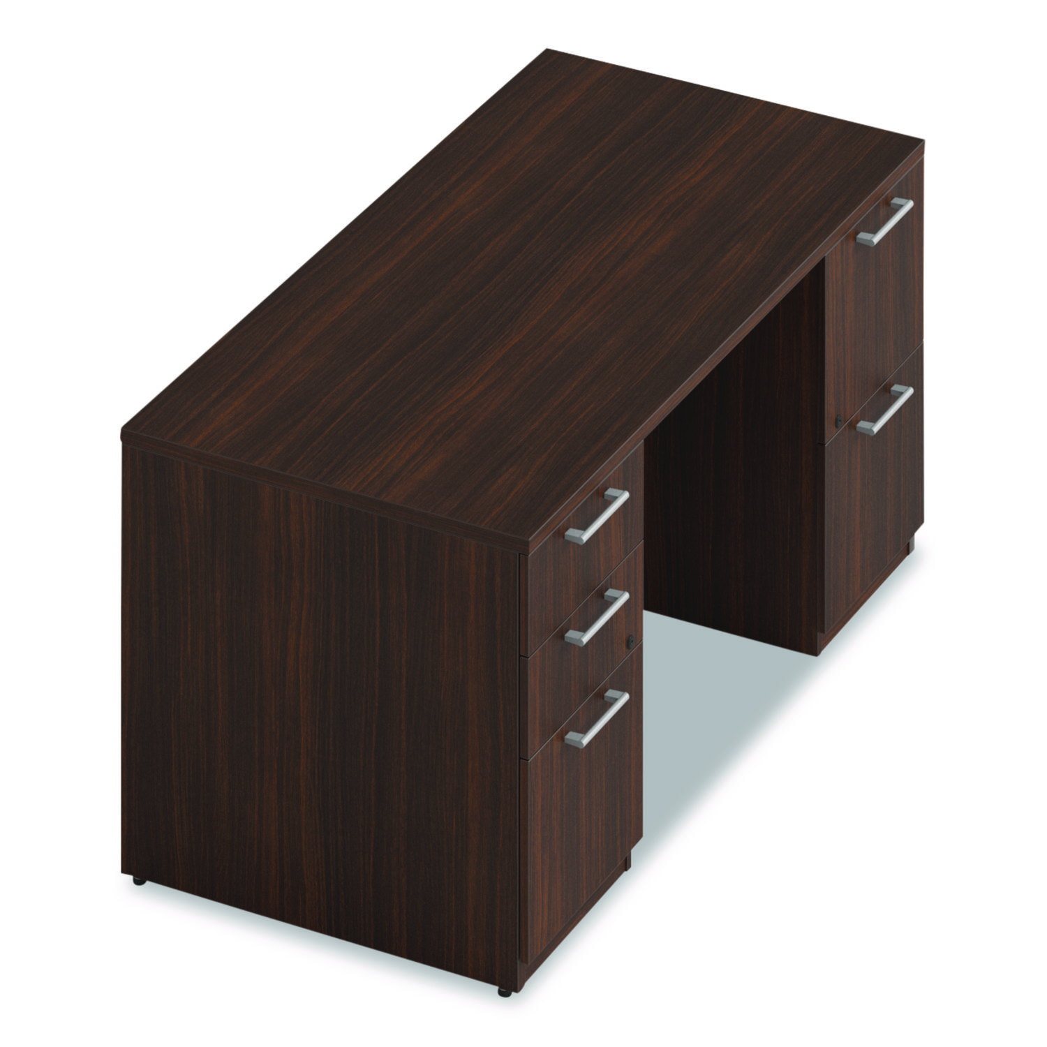 A thoughtfully designed piece that offers both functionality and style for any office environment. Equipped with two pedestals, this desk maximizes storage space to keep your workspace organized and clutter-free. These drawers offer versatile storage solutions for your office supplies, files, and personal items, allowing you to access what you need with ease. The double-pedestal design offers sturdy support, while the laser edge band construction enhances durability for long-lasting use. Crafted from particleboard, the desk is finished with a rich laminate and thermofused melamine (TFM), combining both strength and aesthetics. The premium laminate is resistant to burns and impacts, making this desk ideal for a high-traffic office setting. Its surface is designed to withstand the daily wear and tear of a busy work environment, ensuring that it maintains its sleek appearance over time. To enhance functionality, the desk includes two grommets for convenient cable management, allowing you to keep wires and cords organized and out of the way. Additionally, adjustable glides provide stability on uneven flooring, ensuring a level surface no matter where the desk is placed. Series Name: Alera® Seville Series; Worksurface/Base Color: Mahogany; Color Family: Mahogany; Worksurface Shape: Rectangular.