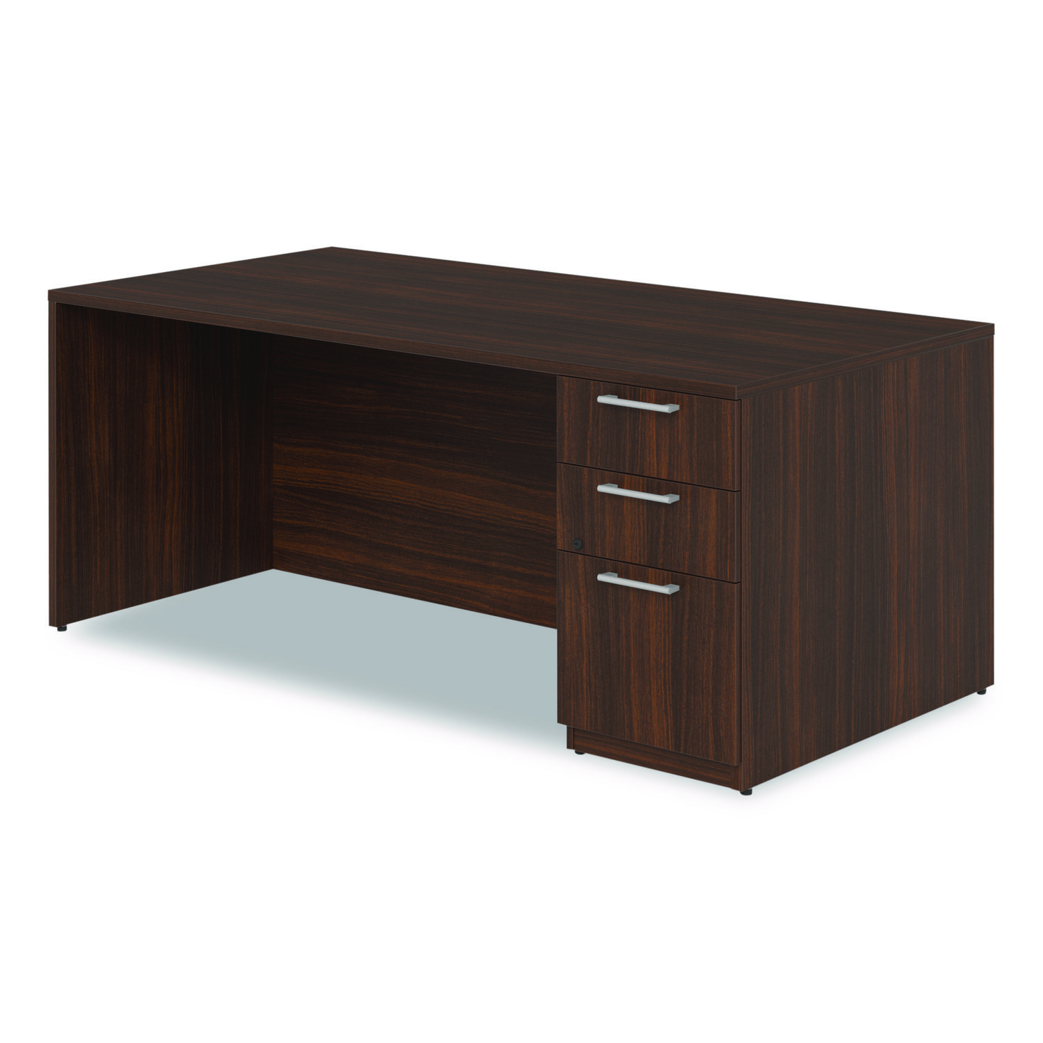A thoughtfully designed piece that offers both functionality and style for any office environment. Equipped with one pedestal, this desk maximizes storage space to keep your workspace organized and clutter-free. The laser edge band construction enhances durability for long-lasting use. Crafted from particleboard, the desk is finished with a laminate and thermofused melamine (TFM), combining both strength and aesthetics. The premium laminate is resistant to burns and impacts, making this desk ideal for a high-traffic office setting. Its surface is designed to withstand the daily wear and tear of a busy work environment, ensuring that it maintains its sleek appearance over time. Adjustable glides provide stability on uneven flooring, ensuring a level surface no matter where the desk is placed. Series Name: Alera® Seville Series; Worksurface/Base Color: Mahogany; Color Family: Mahogany; Worksurface Shape: Rectangular.