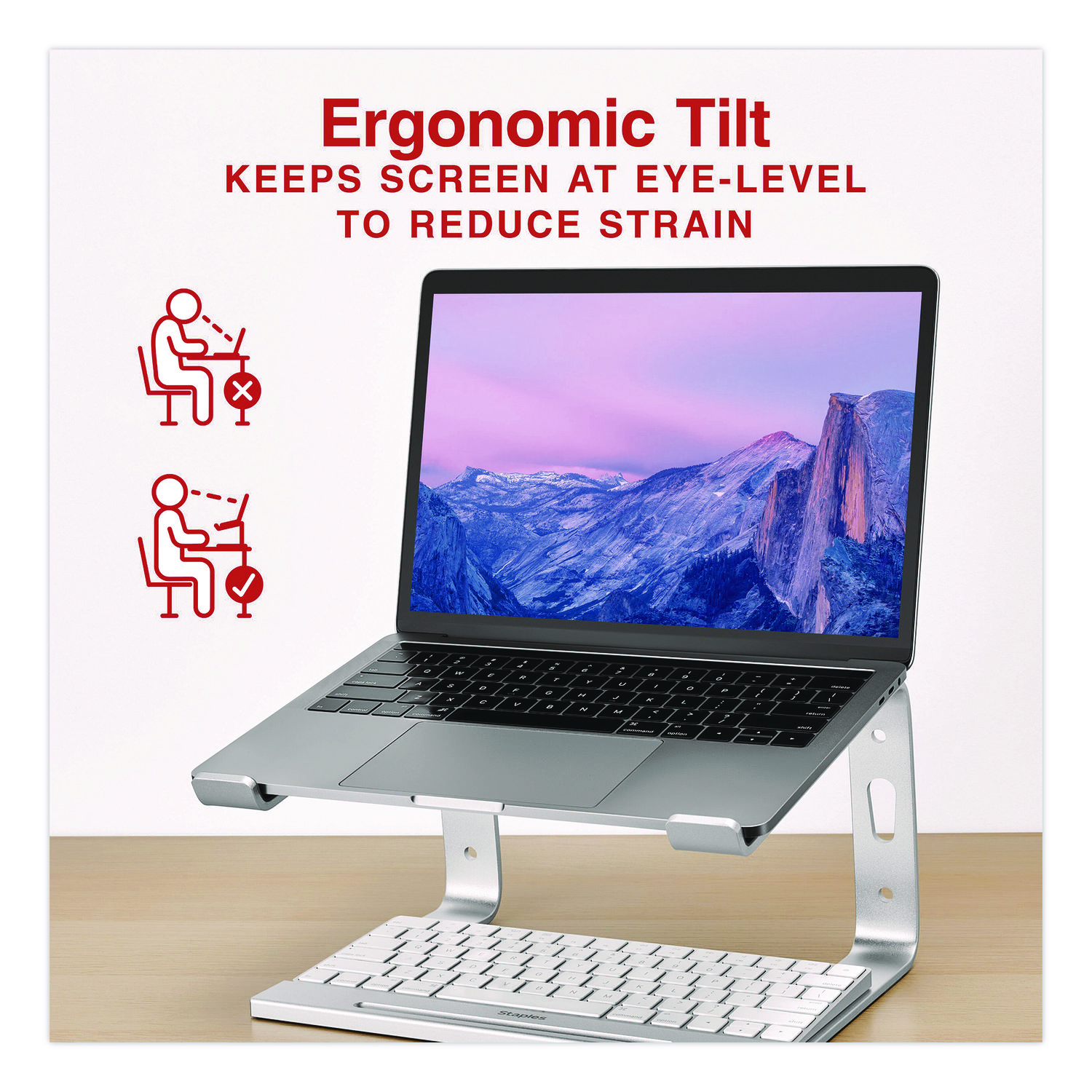 Set up an ergonomic workspace with the Staples TECH Laptop Stand. Elevates your laptop to eye level, promoting better posture, reducing eyestrain, and increasing your productivity. Constructed from sand-blasted aluminum, it’s lightweight and portable while still being durable enough for everyday use. This laptop stand fits laptops ranging from 11 to 17 inches and up to 11 lbs. The ventilated body lets your laptop cool by allowing air to continually circulate around your equipment. Rubberized anti-slip pads ensure stable placement on any surface, and the stand’s easy assembly makes it ideal for any user. Achieve a more ergonomic workspace with the Staples TECH Laptop Stand. Backed by Staples 100% Satisfaction Money Back Guarantee. Width: 11.2″; Depth: 10.2″; Height (Max): 6.2″; Weight Capacity: 11 lb.
