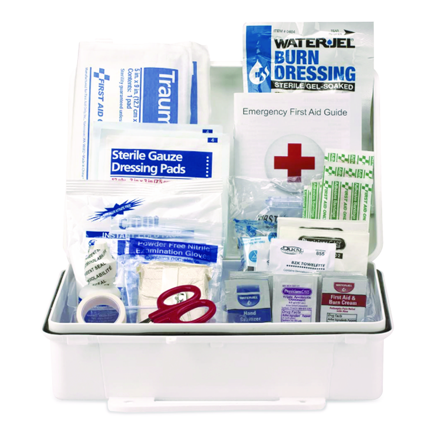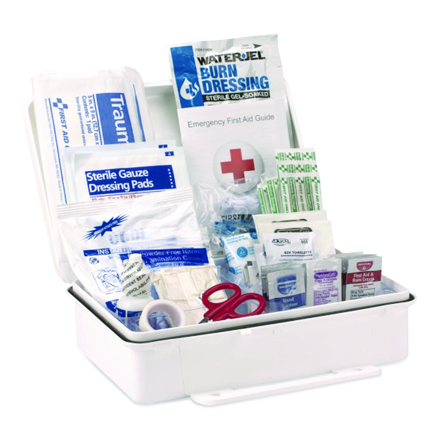 | Package Includes: | (32) 1" x 3" Adhesive Plastic Bandages; 4" x 4" Burn Dressing; (10) BZK Antiseptic Towelettes; 4" x 5" Cold Pack; 2" Conforming Gauze Roll; CPR Face Shield; 52" x 84" Emergency Blanket; 1 oz Eyewash; 0.5" x 5 yds First Aid Tape; First Aid Guide; (10) 0.9 g First Aid/Burn Cream Packets; (10) 0.9 g Hand Sanitizer Packets; (4) Nitrile Exam Gloves; Scissors; (2) Sterile Eye Pads; (4) 3" x 3" Sterile Gauze Pads; (2) 5" x 9" Trauma Pads; 40" x 40" x 56" Triangular Bandage; (10) 0.5 g Triple Antibiotic Ointment Packets |