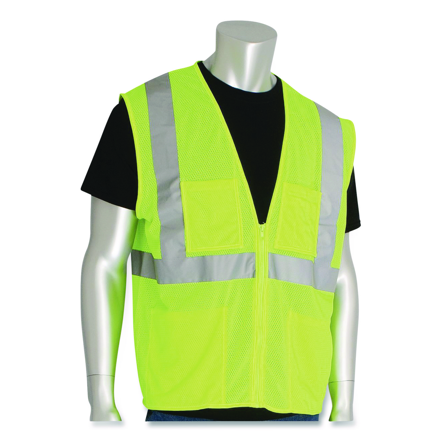 For workers exposed to traffic traveling over 25 mph and who work against complex backgrounds. Zipper enclosure for secure closure of vest. Features high-vis color and reflective 2″ silver stripes that make you easy to see both night and day, so it’s ideal for a range of tasks where visibility is important. With a 100 percent polyester mesh fabric design and zipper closure, this vest is lightweight and easy to wear over clothing. Includes two lower internal pockets, two upper chest external pockets one including four pen pockets. Apparel Type: Vest; Material(s): Polyester Mesh; Color(s): Hi-Viz Lime Yellow; Color Family: Yellow.