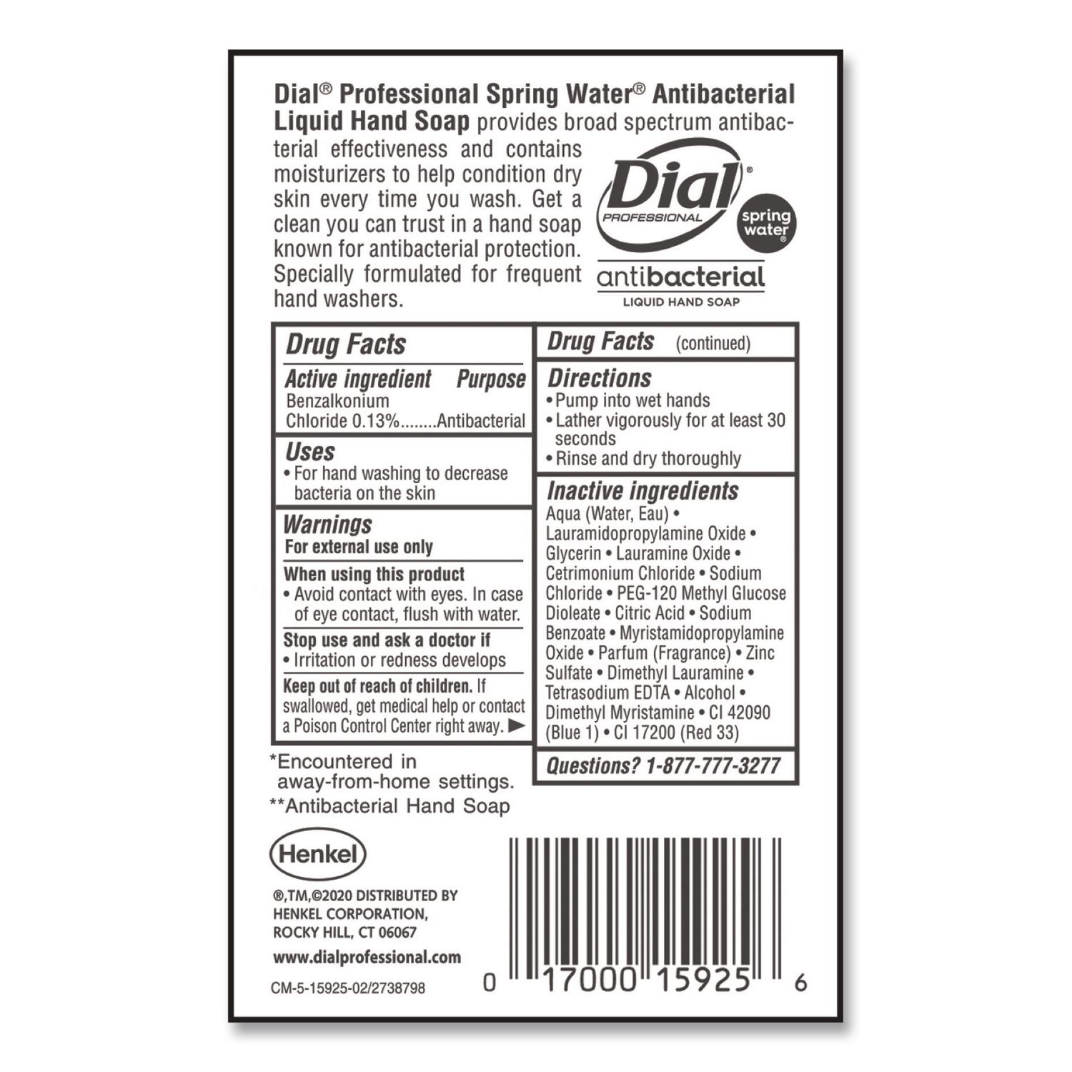 Dial® Spring Water® Antibacterial Liquid Hand Soap kills 99.9% of bacteria encountered in away-from-home settings. Enriched with moisturizers. Soap Type: Antibacterial Liquid; Volume Capacity: 1 gal; Scent: Spring Water; Personal Soaps Application: Hand.