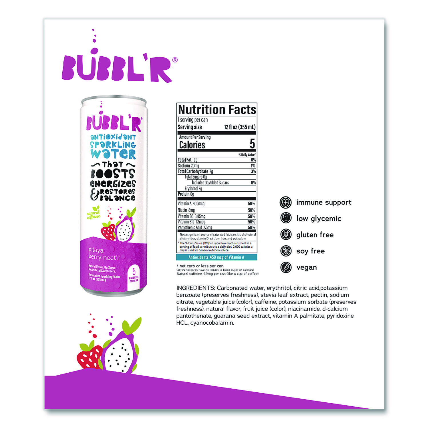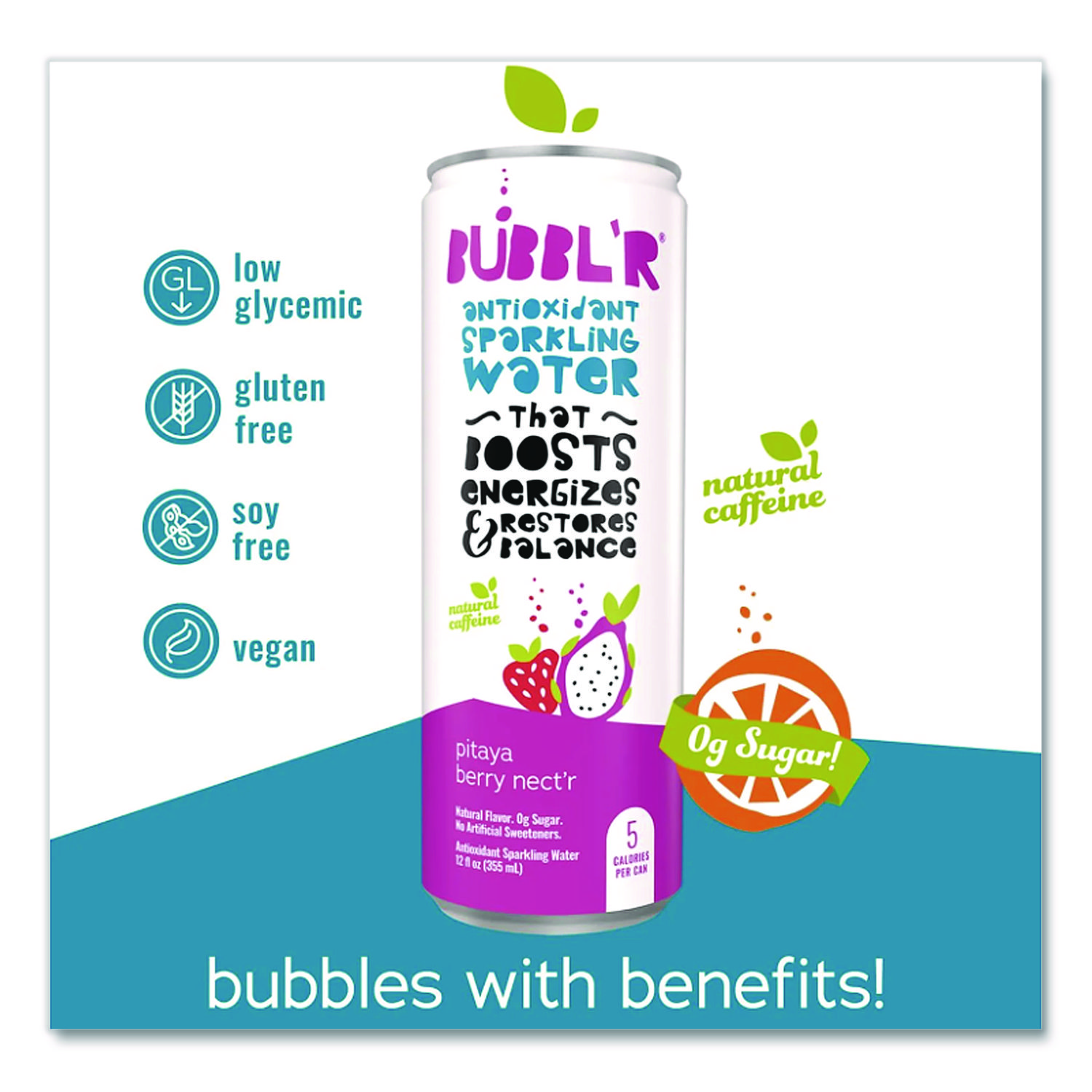 Bubbl’r Antioxidant uses natural flavors, colors, and caffeine sources to give consumers a bubbly burst of energy without any drawbacks of traditional caffeinated soda. With zero grams of sugar and no artificial sweeteners, Bubbl’r Antioxidant is the perfect drink for those looking for a soy-free, gluten-free, or low-glycemic option. Sure, the sparkling personality will make you fall in love at first sip, but then the real magic happens. Fruity effervescence and awesome antioxidants swoop in to balance the body and focus the mind, right before a boost of natural caffeine shows up to save your day. Beverage Type: Sparkling Water; Flavor: Pitaya Berry Nect’r; Product Packaging: Can; Volume Capacity: 12 oz.