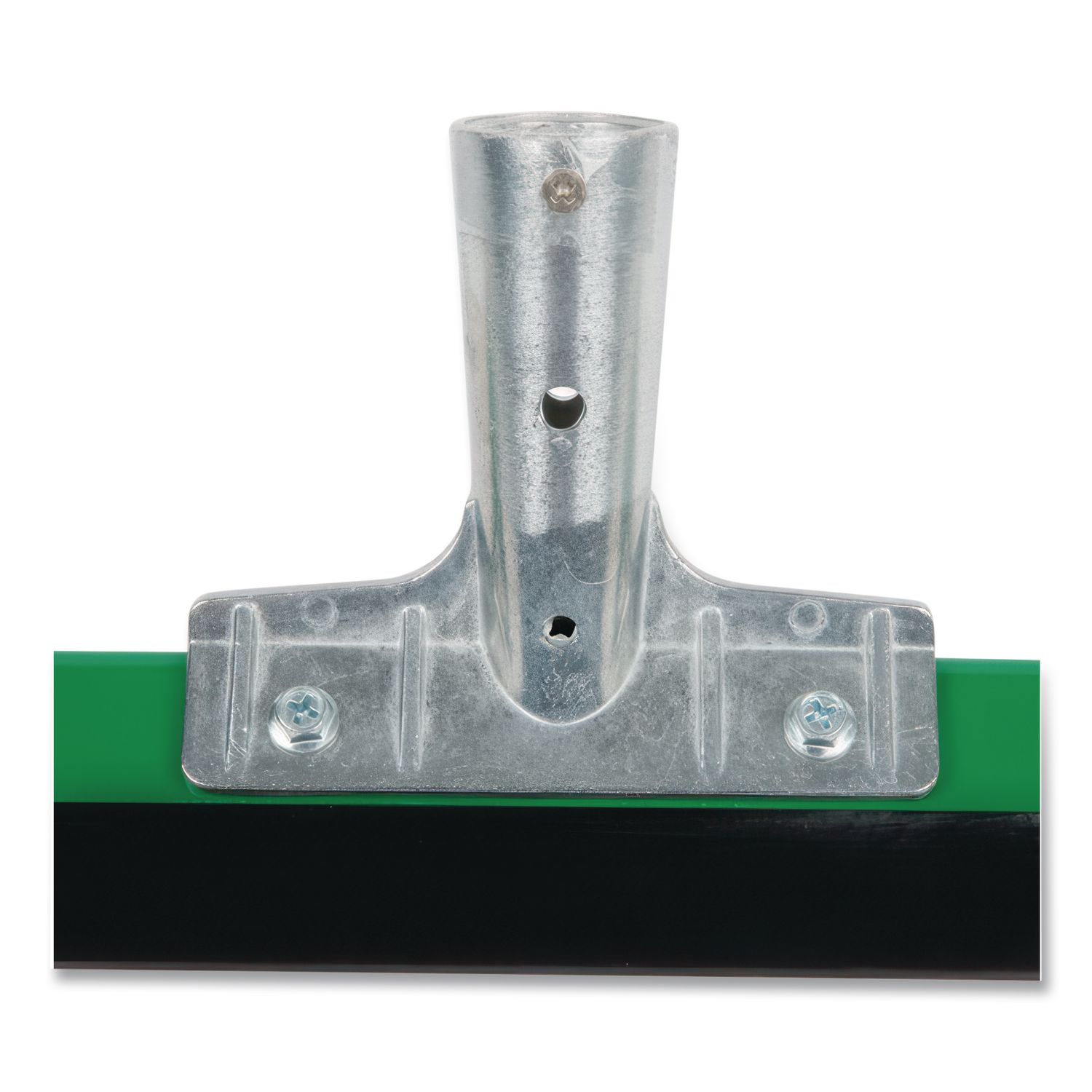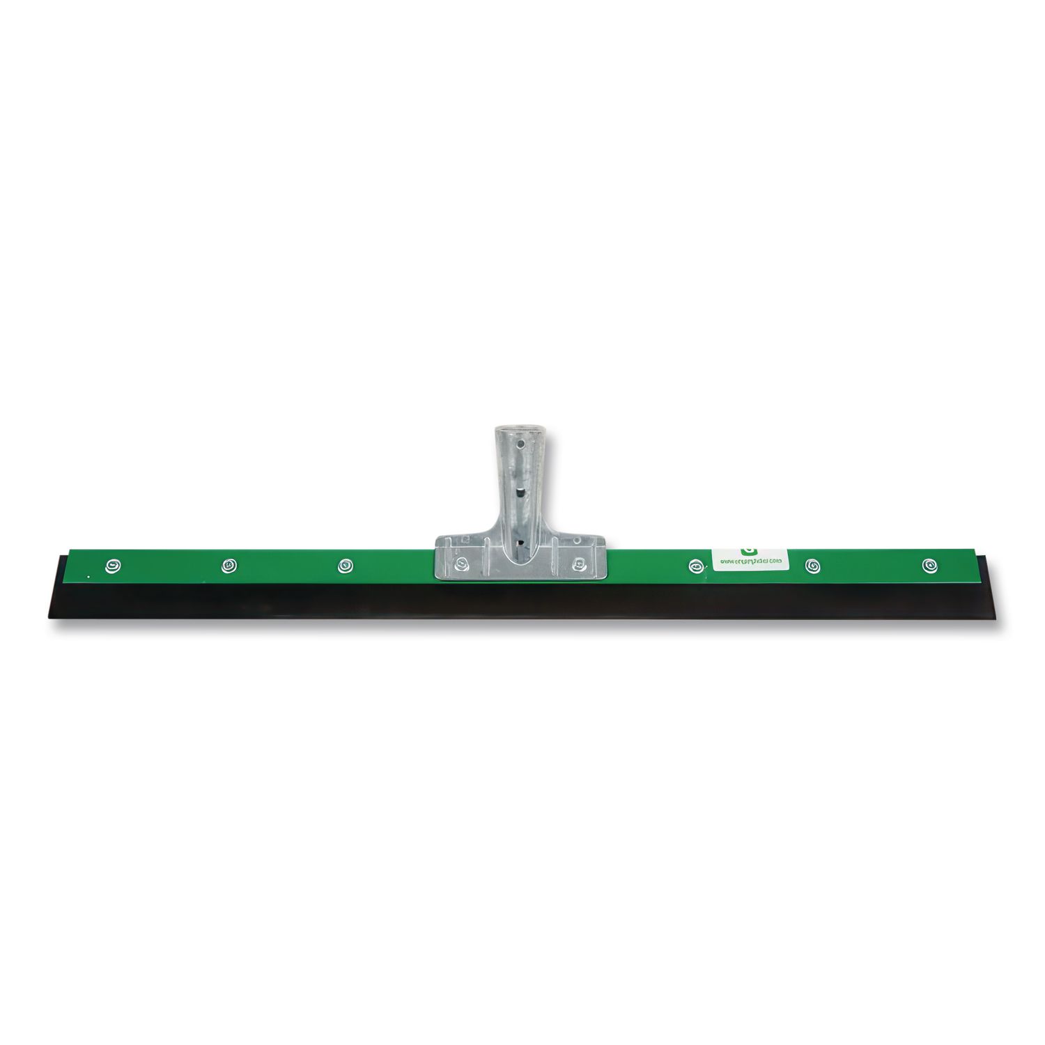 Sturdy construction with 14-gauge powder-coated steel frame and reinforced zinc alloy handle socket. Use for moving large volumes of water, mud, debris, waste, scraps, slush, snow and flood clean-up on coated and uncoated smooth concrete floors, asphalt and other smooth surfaces. Great for construction sites, plants, factories, large commercial areas, loading docks, agricultural, food processing, arenas, outdoor areas and around large drains. Replaceable rubber blade. Unger® AL14T handle sold separately. Curved—With black neoprene rubber. Blade Material: Rubber; Blade Width: 24″; Blade Color: Black; For Use With: Unger® AL14T.