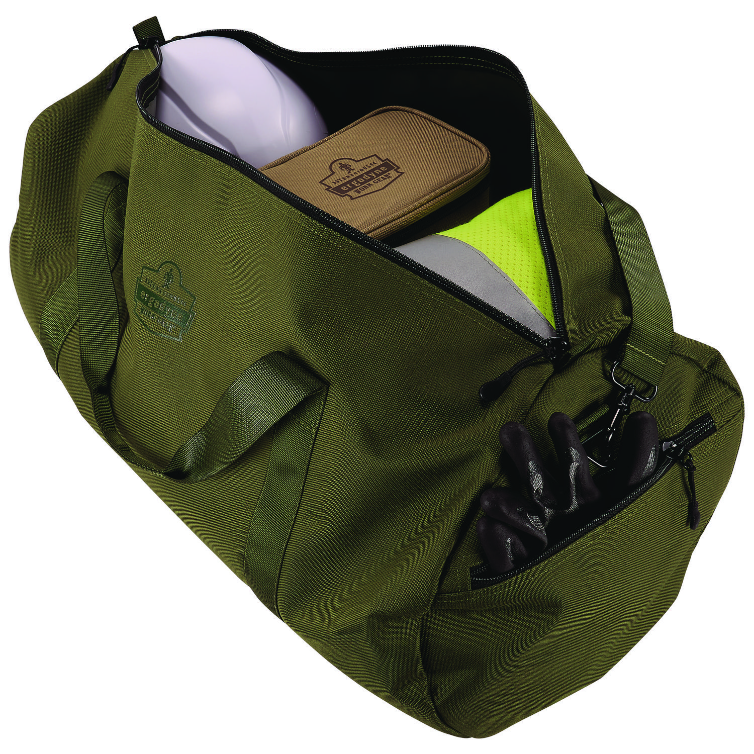 The Arsenal 5020P Standard Gear Duffel Bag is easy to carry and helps organize everything you need for the workday or the weekend. Whether you use it as a way to store your equipment on the job, a hunting bag to trek your gear through the woods, or as a carry-on duffel bag while traveling, you can rely on this utility duffel bag to house and protect your valuables. This lightweight, yet super durable gear bag is made with 600D polyester material to withstand wear and tear for long-lasting performance. Keep your essentials clean and dry with the reinforced water-resistant backing. Heavy-duty ribbed webbing handles and the adjustable padded shoulder straps. A large open main compartment fits all your gear with easy loading and unloading, so nothing is left behind. There are two accessory pockets with zippers on each side to hold smaller items. For Use With: Gear; Color(s): Olive; Color Family: Green; Material(s): Polyester.
