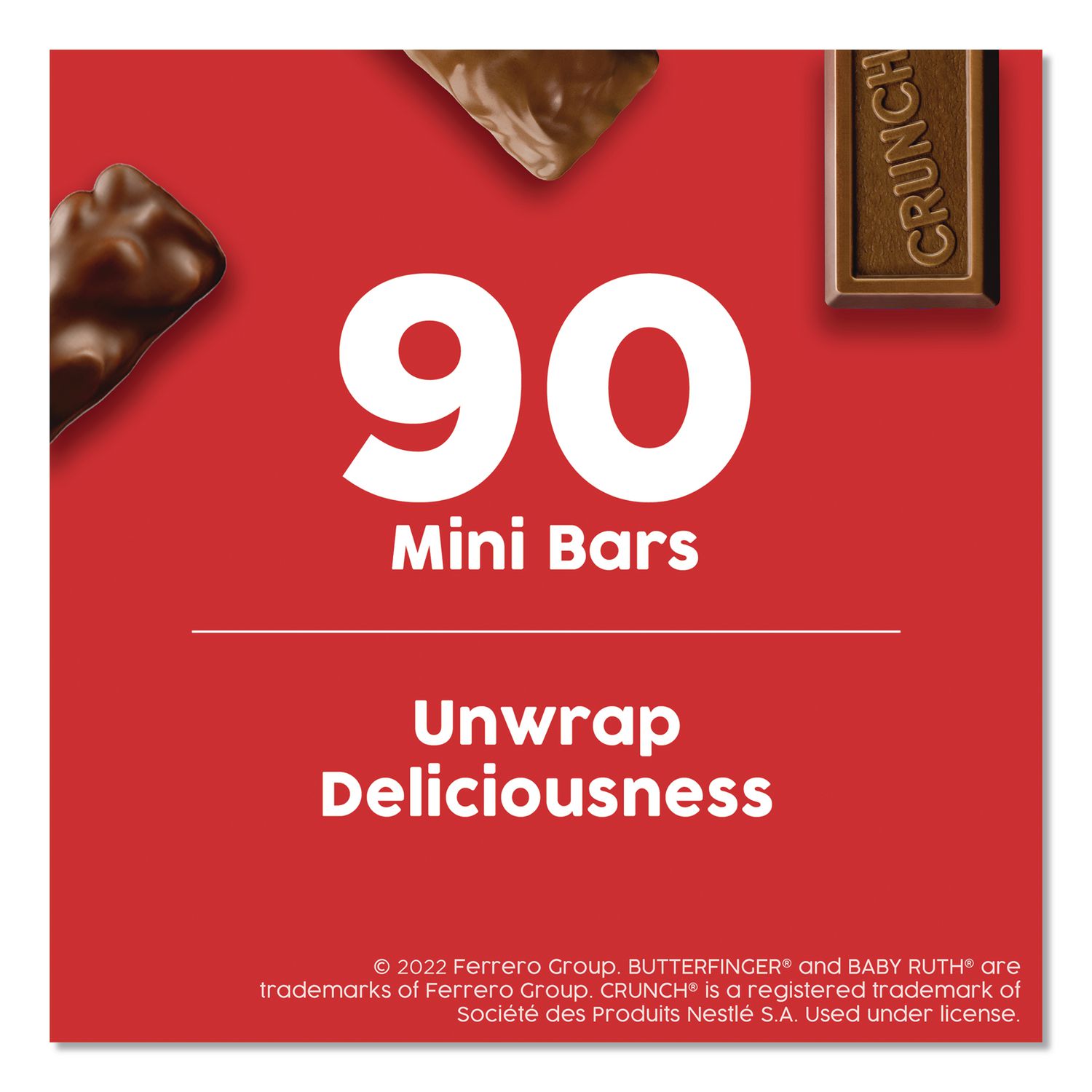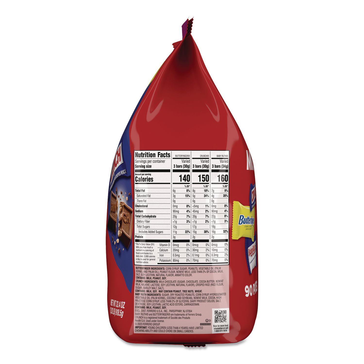 Keep your pantry or office stocked with classic snacks that make sharing with friends, family, coworkers or teammates easy and fun. Enjoy the variety of classic favorites. Tasty treat. Perfect for parties. 90 Pieces. Food Type: Candy; Flavor: Baby Ruth; Butterfinger; Crunch Bar; Capacity (Weight): 32.4 oz; Sugar Free: No.