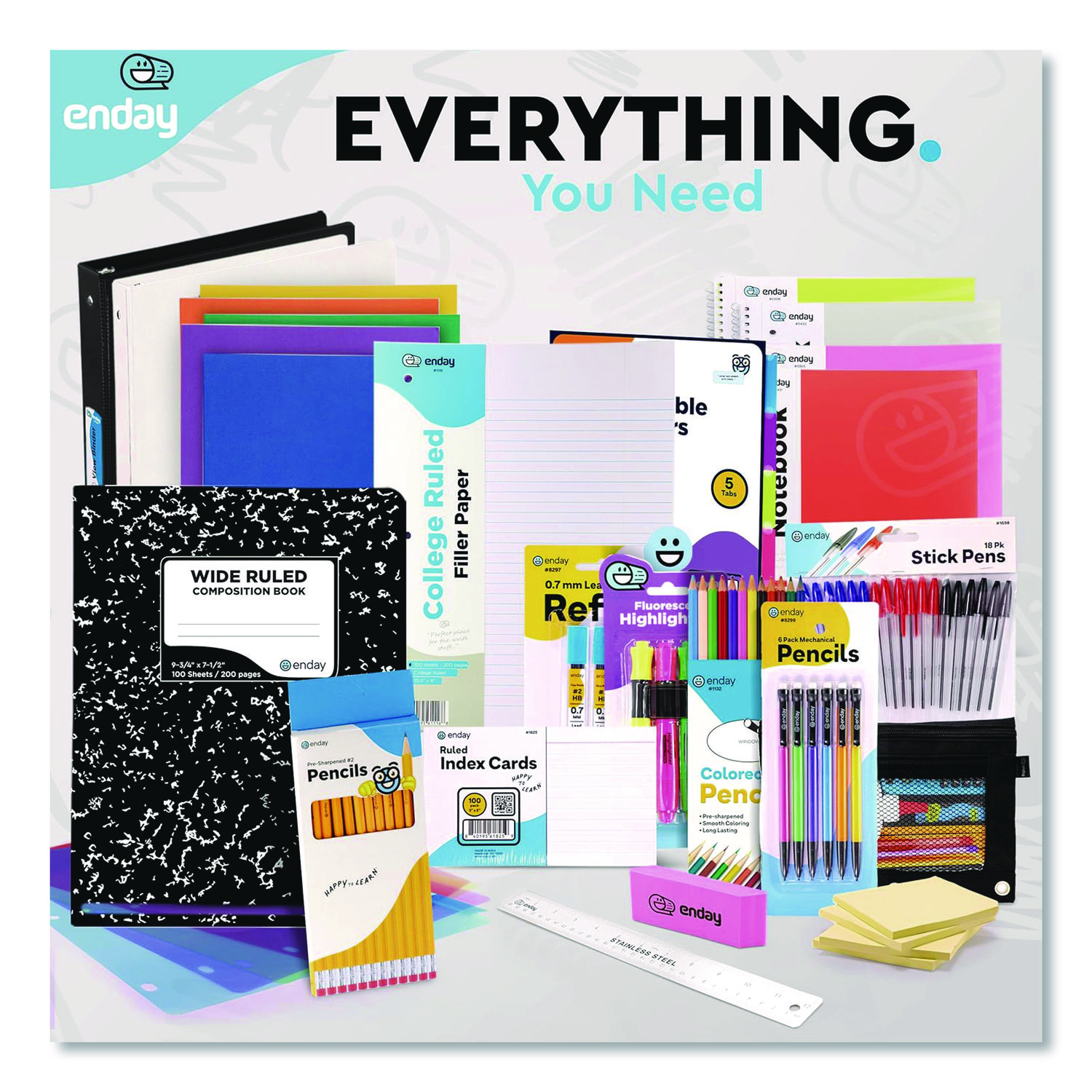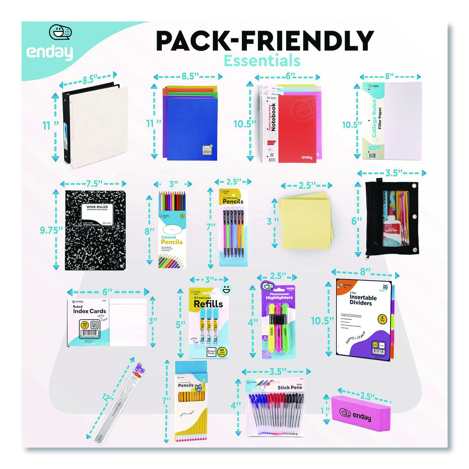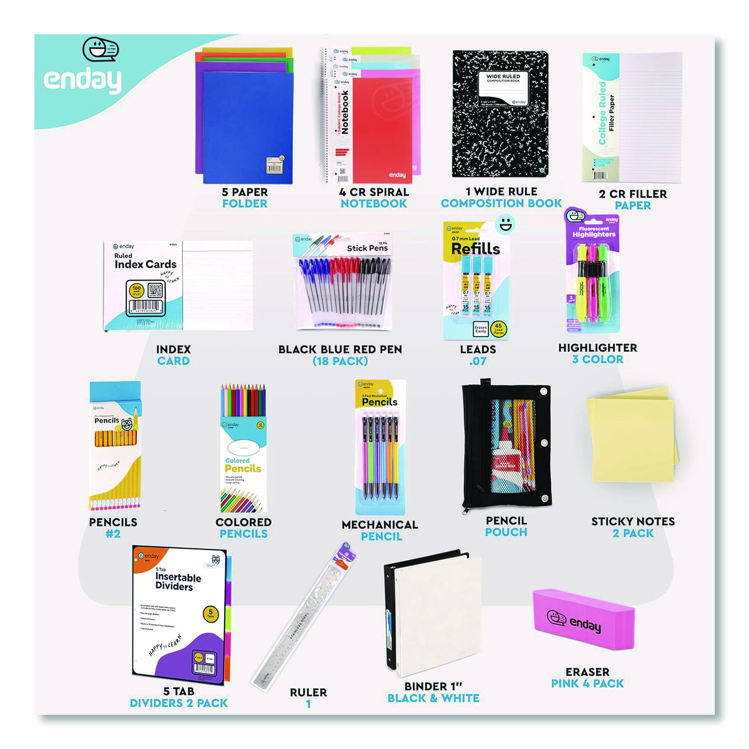 | Contains: | (2) 1" 3 Ring Binder Black & White; (5) Paper Folder with Pockets; (4) College Ruled Subject Notebook; (2) College Ruled Filler Paper; (2) College Ruled Composition Notebook; (1) Pack Index Cards; (2) 100ct Sticky Notes; (2) 5-Tab Dividers; (1) 12" Ruler; (6) Black Pens; (6) Blue Pens; (6) Red Pens; (12) #2 Sharpened Pencils; (12) Colored Pencils; (6) Mechanical Pencils; (3) 0.5 mm Lead Refills; (25) Pencil Top Erasers; (3) Highlighters; (1) Pencil Pouch; (4) Pink Erasers |