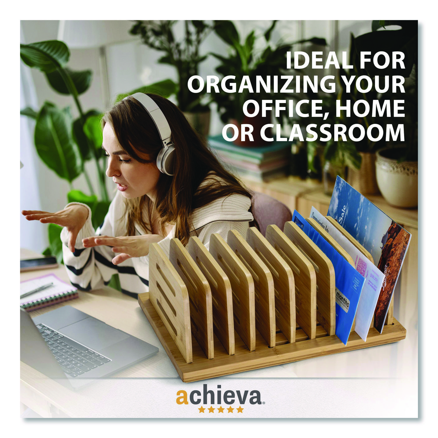 Officemate Bamboo Desk Accessories offer the natural elegance, durability, and sustainability of Bamboo. Not only is Bamboo longer-lasting and stronger than common types of wood such as Oak and Maple, it is highly renewable and biodegradable. It includes nine separate filing compartments. Multifunctional with adjustable widths. Some assembly required. Can stack and combine with others. Natural wood grain can match well with any other desk accessories. Number of Compartments: 9; For File Size: A6; A7; A8; A9; Legal; Letter; Tabloid; Load Orientation: Top; Color(s): Brown.