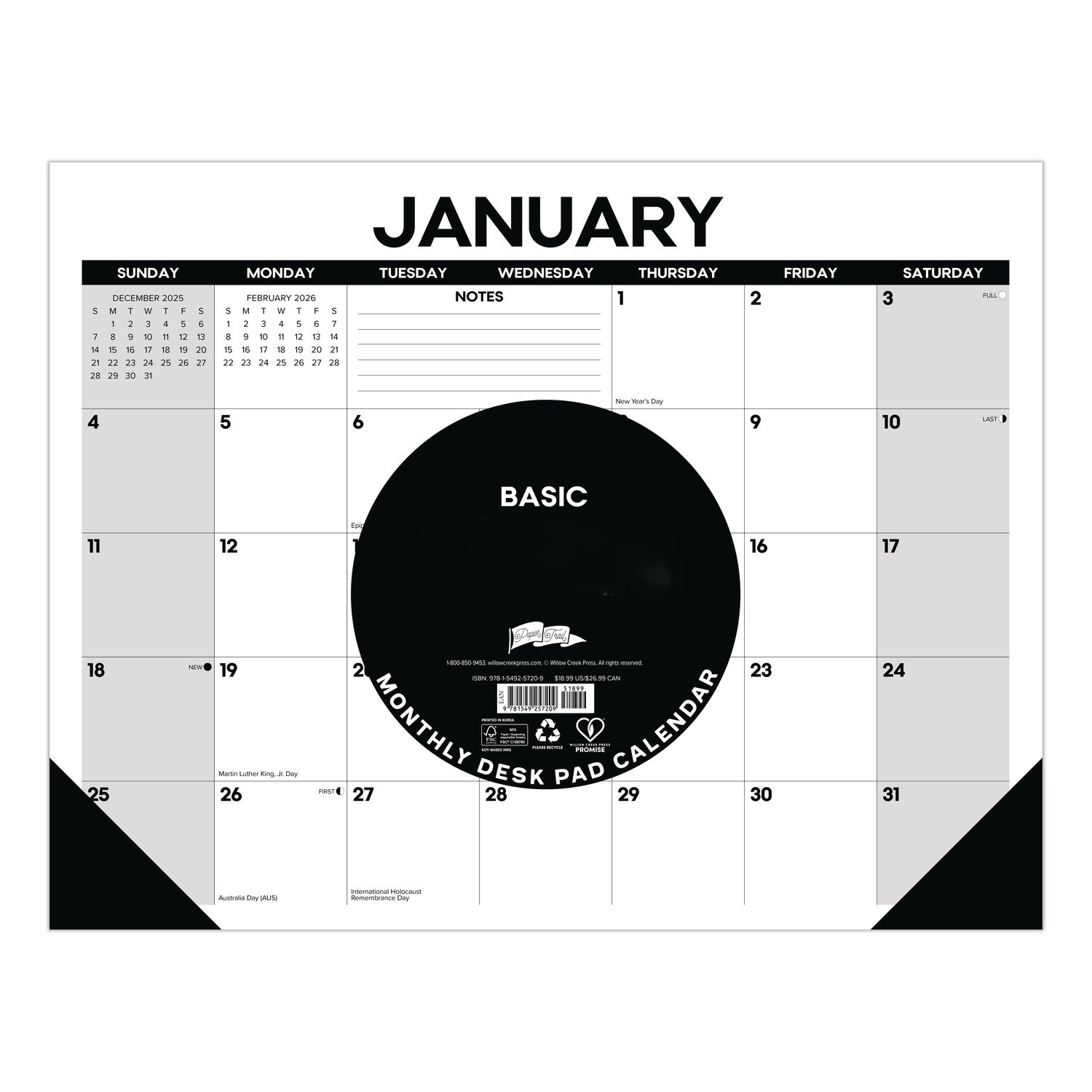 Basic Large Monthly Desk Pad Calendar, 22 x 17, White/Gray/Black Sheets, Black Headband/Corners, 12-Month (Jan to Dec) 2026