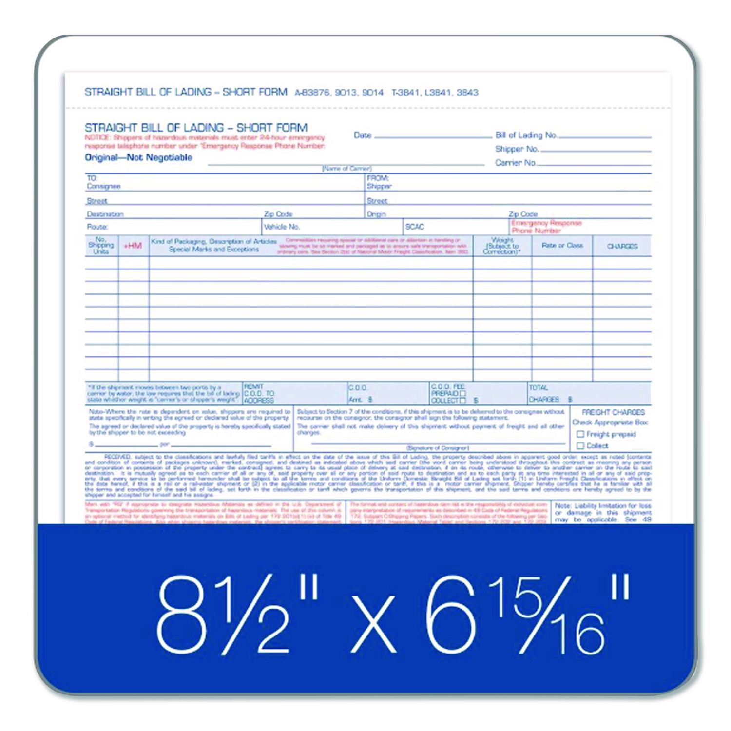 Choose AdamsĀ® Bill of Lading – Short Forms and ensure all your shipments arrive with the appropriate paperwork. Adaptable to most types of shipments to any location in the United States, these simplified, short forms provide space to itemize several articles. Dedicated columns are provided for shipping units, hazardous materials indicators, article descriptions, shipping weights, rate/class codes and charges. Multi-part format lets you distribute copies and keep a master for yourself. Carbonless paper produces clean, smudge-free results. For Up to Ten Articles. Form Type Details: Shipping/Receiving; Dated: No; Forms Per Page: 1; Form Size: 8.5 x 6.94.